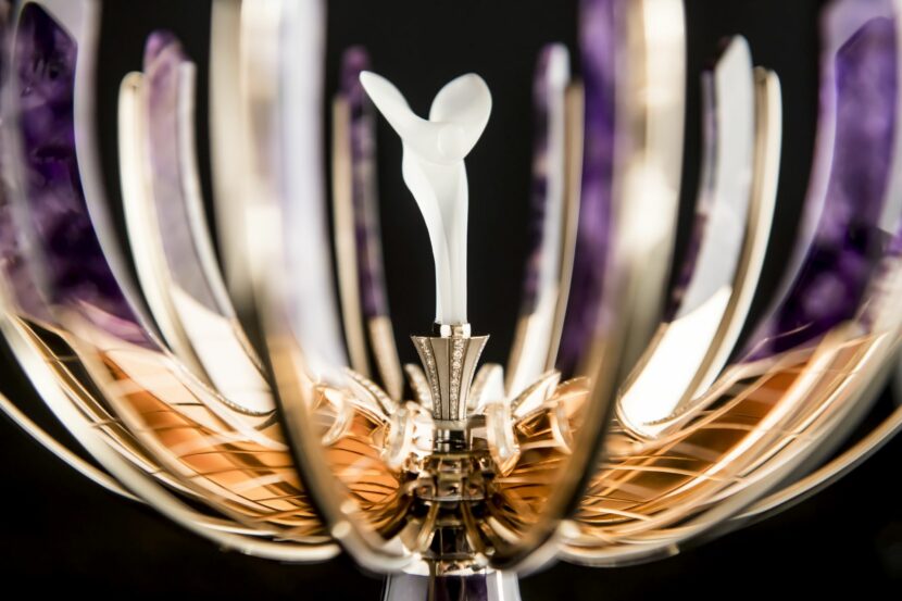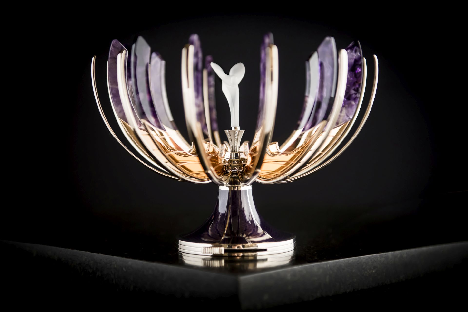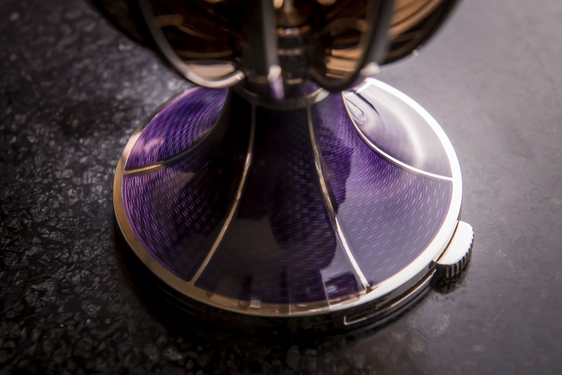 The Egg rests on an engine-turned, hand-engraved, purple enamel guilloché base of 18-carat white gold. Arms of rose gold define the shape of the egg, acting as a protective chamber for its contents. Operating a discreet lever at the base of the stand opens the shell to reveal a Spirit of Ecstasy figurine hand-sculpted in frosted rock crystal. The rose gold vanes, embellished with nearly 10 carats of round white diamonds, resolve into swathes of natural amethyst weighing over 390 carats, specially selected for its color saturation and quality.