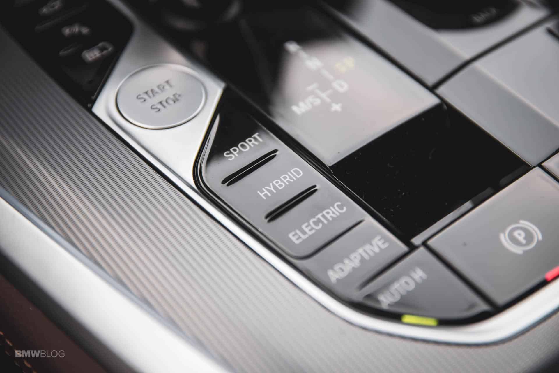The center console has a couple of different buttons on it, right next to the start button. They allow you to switch between different driving modes and they are labeled “Hybrid” or “Electric.”