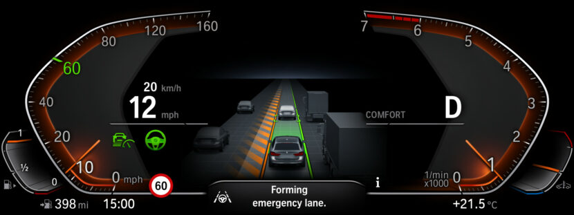 If the route navigation is on, the 3D visualization also displays helpful guidance above the Driving Assistant virtualization area within the digital instrument cluster of the BMW Live Cockpit Professional.