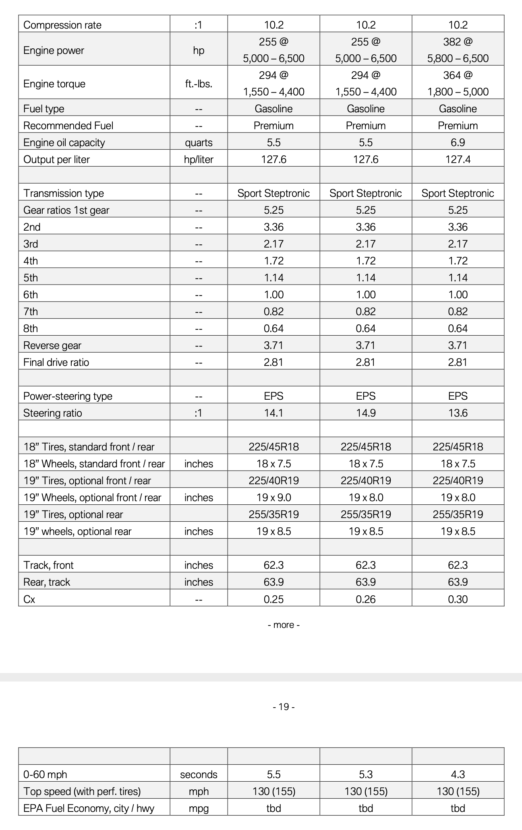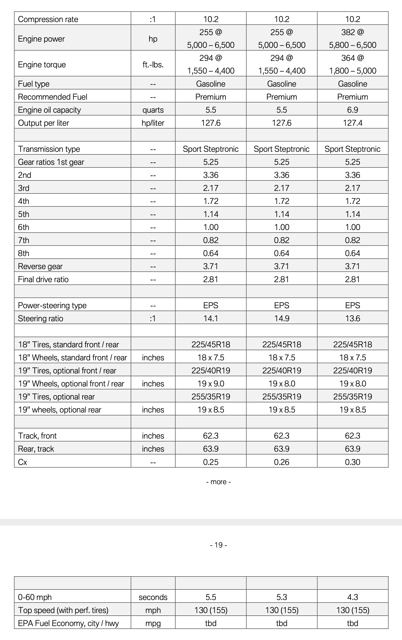 Capacity: 2,998 cc, output: 275 kW/374 hp at 5,500 – 6,500 rpm,