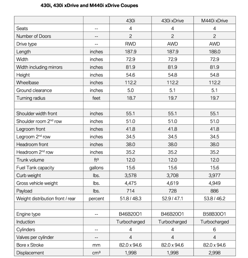 MSRP pricing is $45,600 for the 2021 BMW 430i Coupe, $47,600 for the 430i xDrive Coupe and $58,500 for the M440i xDrive Coupe. Pricing does not include $995 Destination.