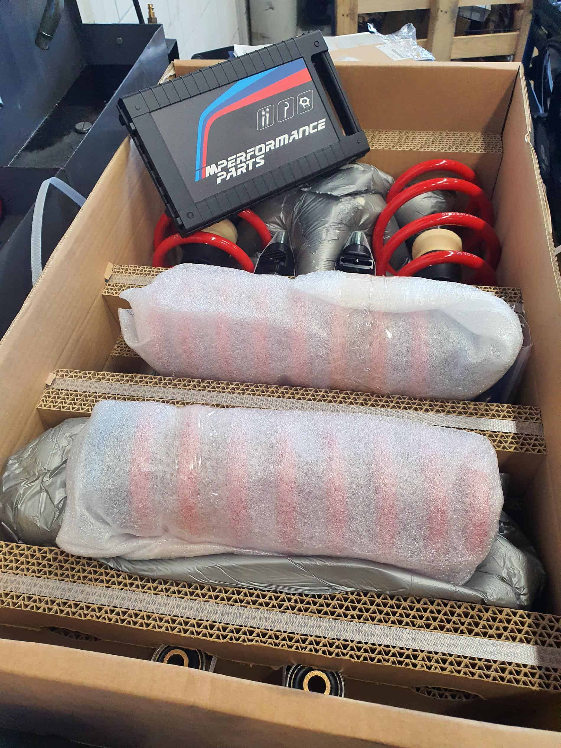 In the second step, the new M Performance chassis is first unpacked and checked. After all parts have been pre-sorted for the respective axle, the coilover suspension is installed. Once the installation is finished, the height of the M2 is adjusted on the front and rear axle according to BMW’s specifications.