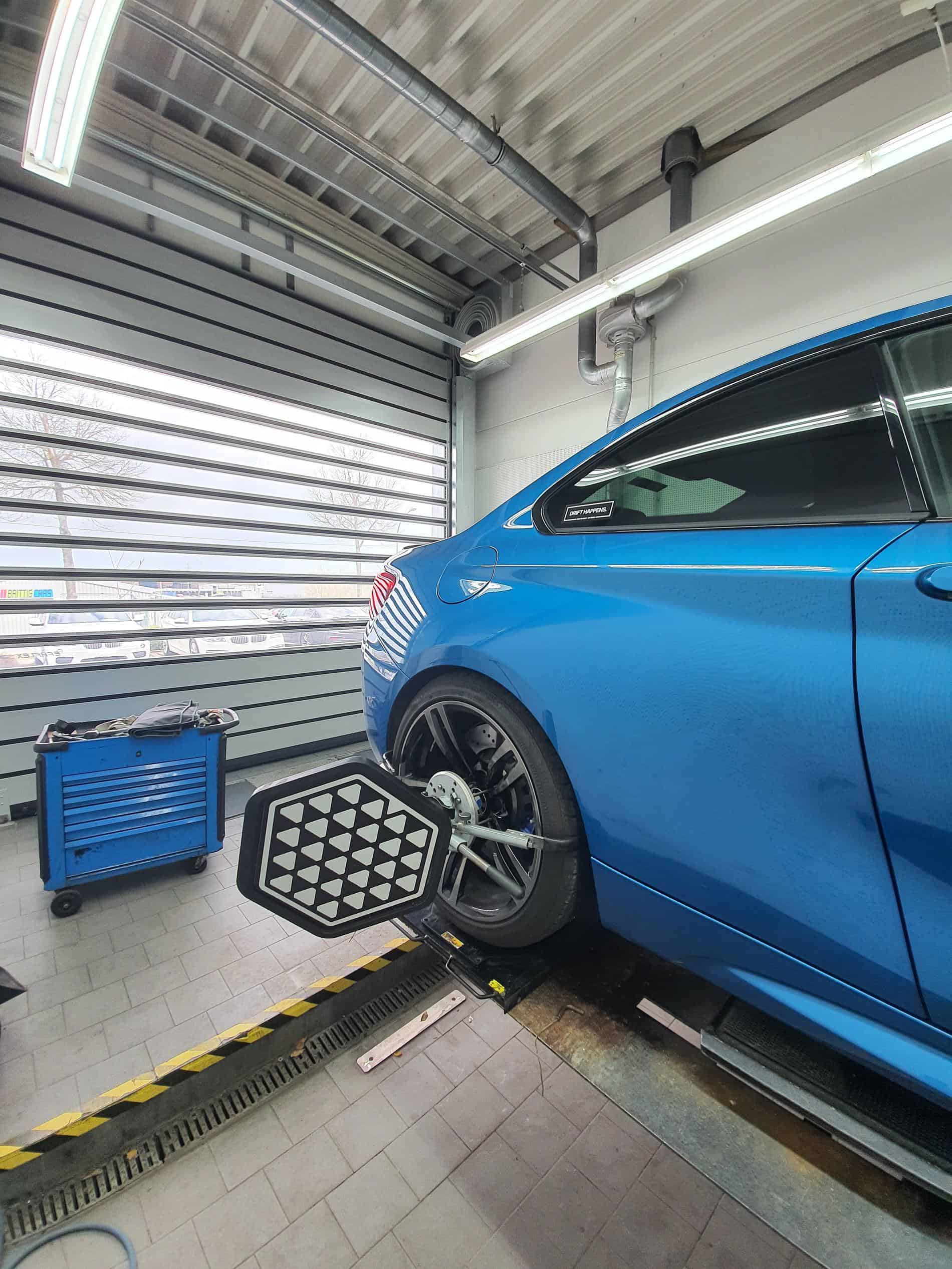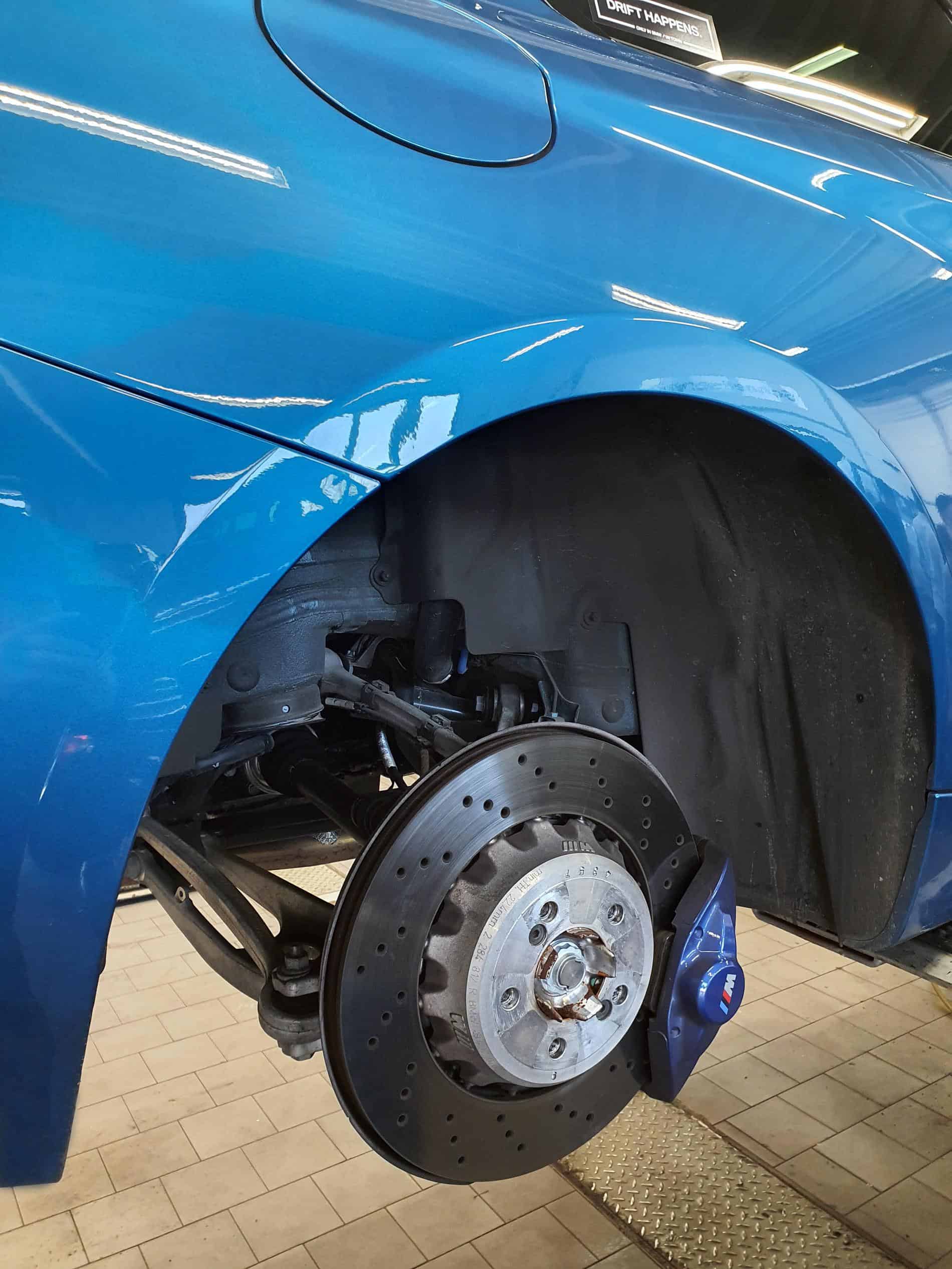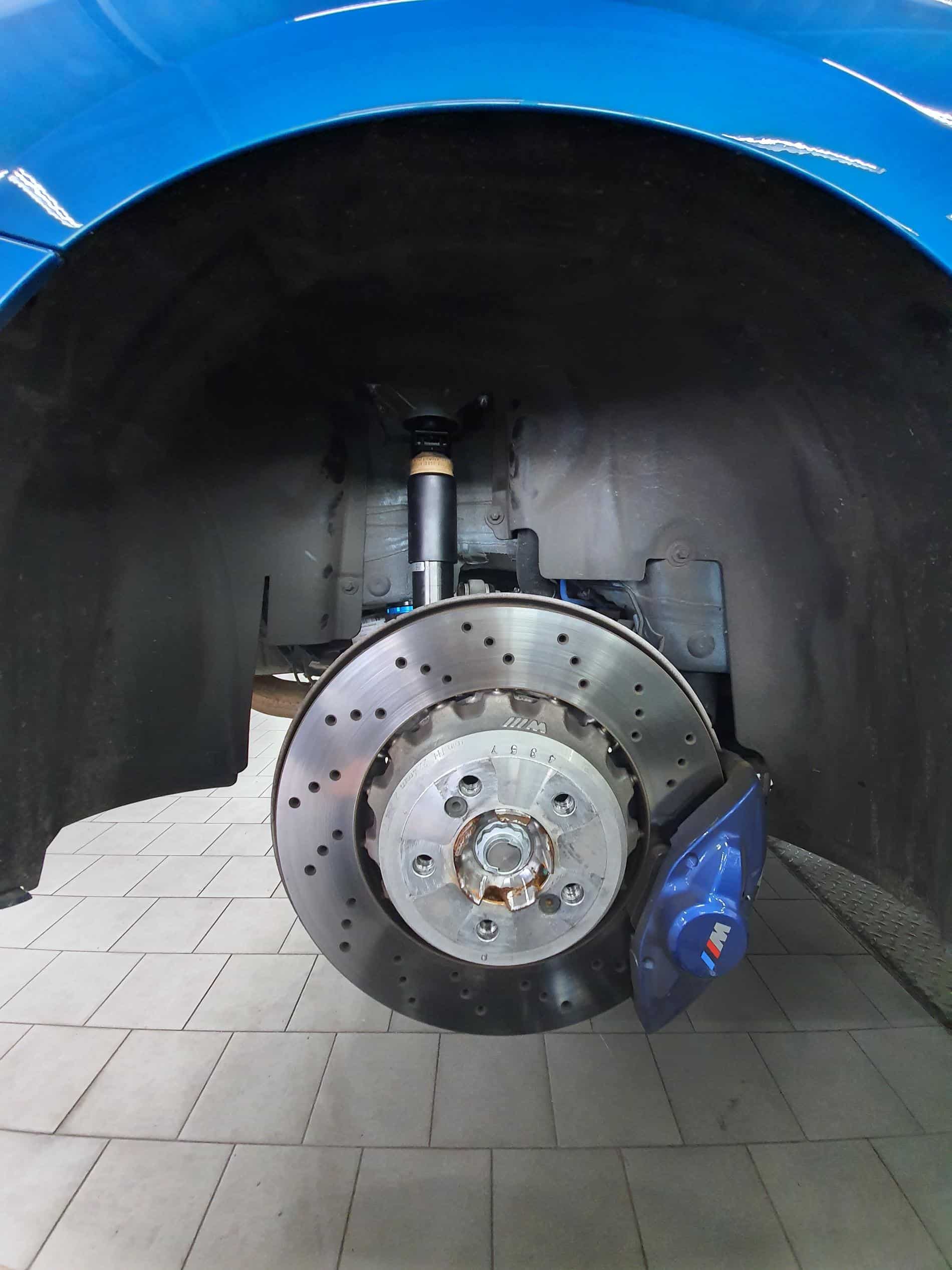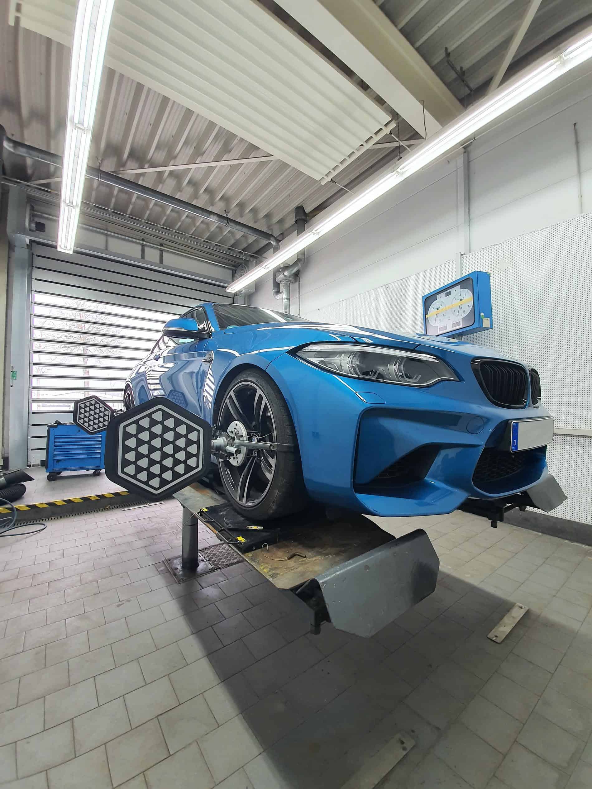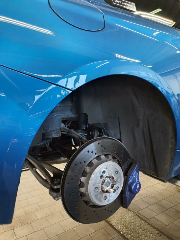 Before the installation of the BMW M Performance suspension for the M2 can start, several activities have to be done to prepare the car. First, the current software version is checked and, if necessary, the latest software version will be installed. Afterwards, the M2 is ready for the removal of the old suspension. This includes disconnecting the vehicle battery and removing the wheels on the front and rear axle.