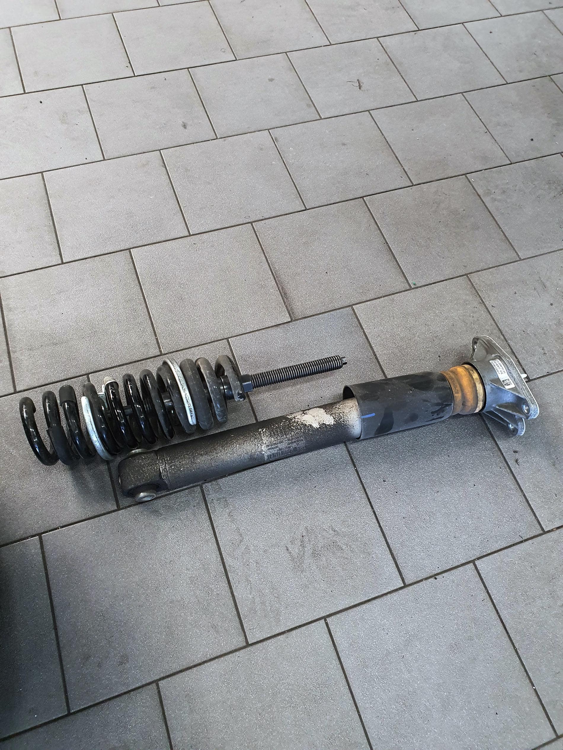 As soon as the wheels are dismounted, the extensive removal of the standard chassis can begin. This includes the removal of the suspension struts on the front axle, the removal of the shock absorbers on the front and rear axle and the removal of the coil spring on the rear axle. In addition to this, the pendulum support as well as the shock absorber support bearings is dismounted. After all parts of the standard suspension are removed, the second step can start.