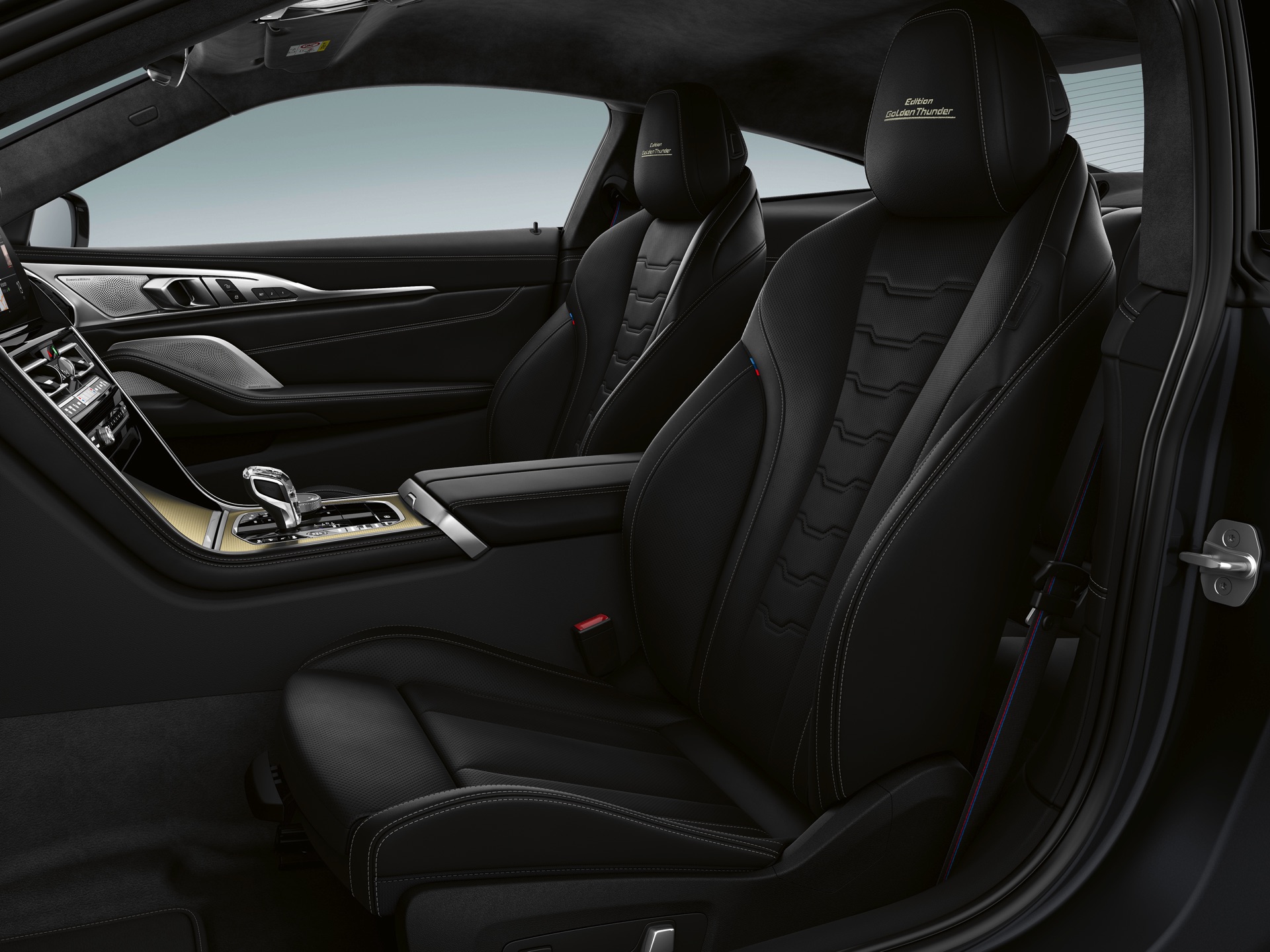 Moving inside, the BMW 8 Series Golden Thunder Edition comes with extended BMW Individual Merino leather trim in black with the “Edition Golden Thunder” inscription embroidered on the front headrests and the BMW Individual Alcantara Anthracite roof liner.