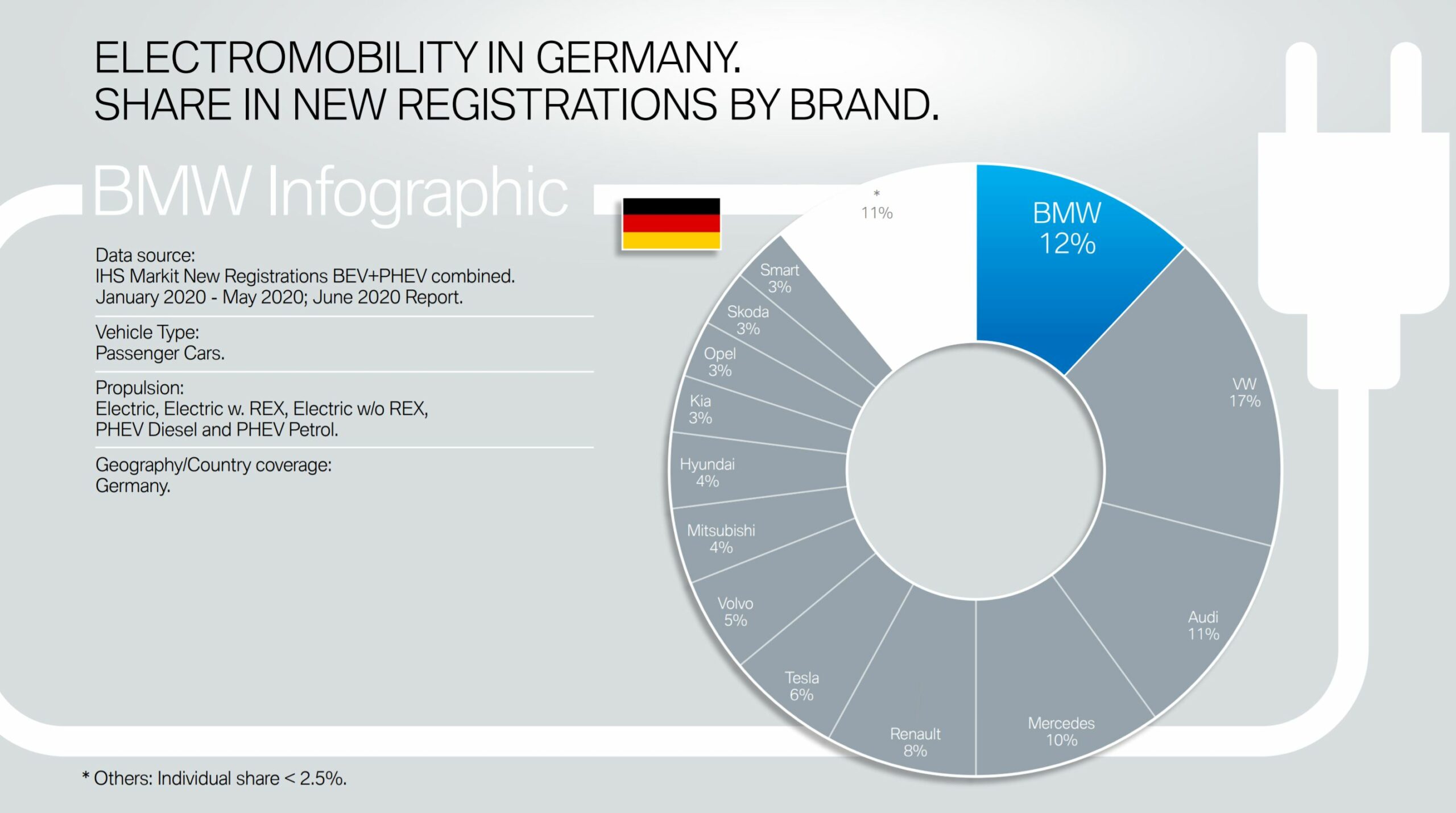 BMW’s electric offensive continues in 2020. According to a press release issued today, 7.9% of total BMW Group cars sold in 2020 were plug-in hybrids and electric vehicles. The car registration data for the first five months of this year comes from IHS Markit and concerns only passenger cars. In Germany, BMW brand was the second most popular plug-in brand with a market share of 12 percent. The top spot went to Volkswagen – 17 percent – followed by Audi with 11 percent and Mercedes-Benz 10 percent. Combined, the Big 4 German automakers control more than half of the electrified market in Germany. In the U.S., so far this year 4.5% of BMW Group cars were plug-ins, which is noticeably below the market average of 5.1%.