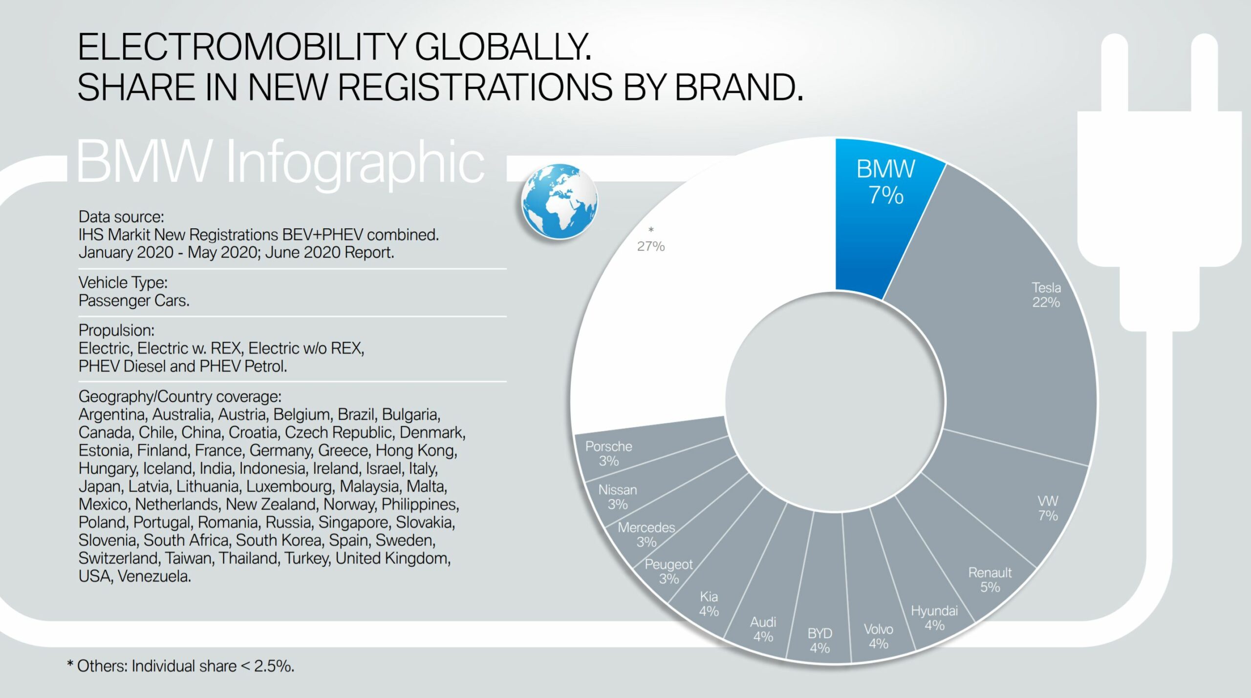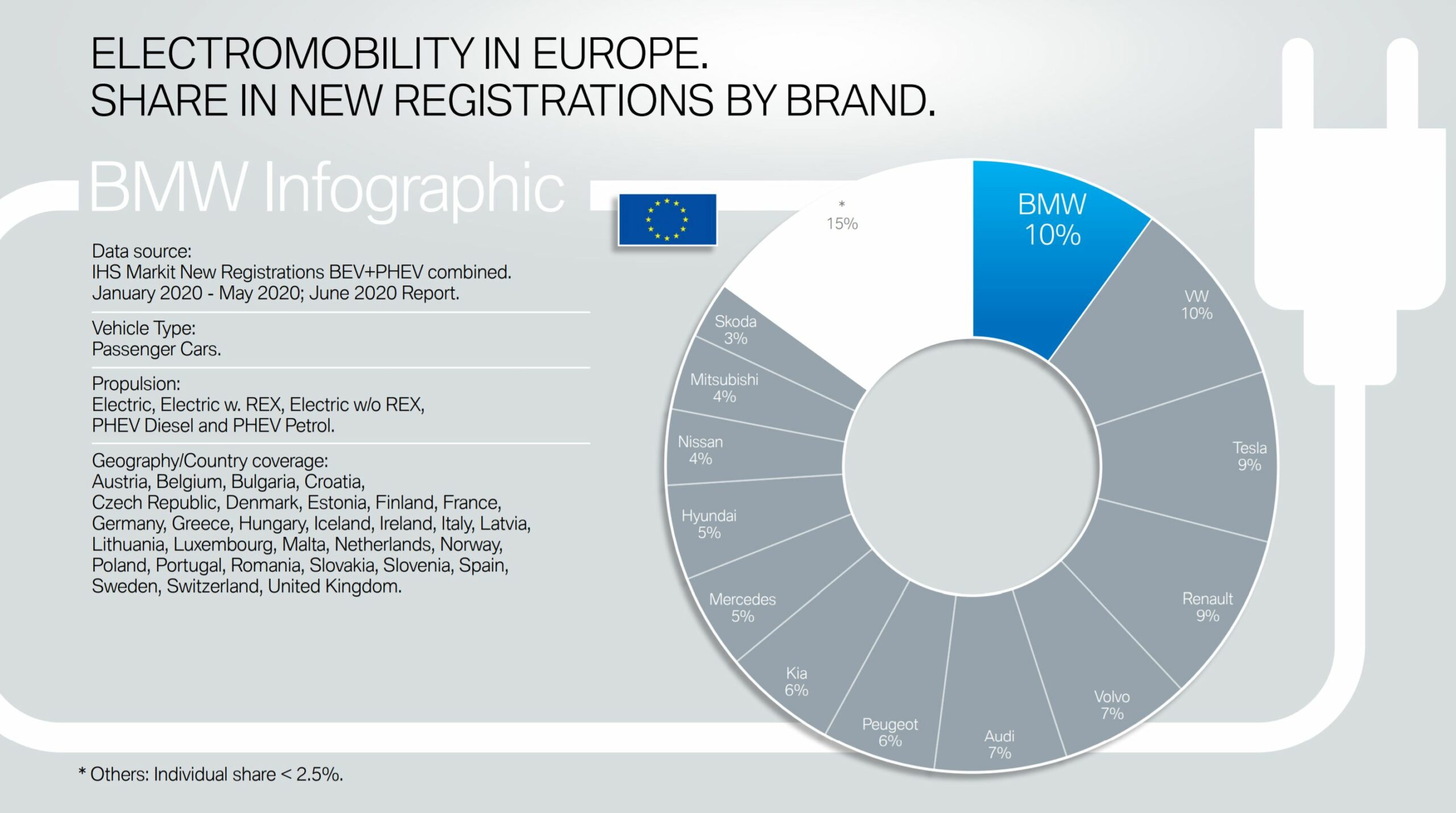 Taking a broader view in Europe and BMW still ranks high on the chart. 10 percent of the electrified market went to BMW in 2020, on par with Volkswagen and slightly ahead Tesla and Renault – 9 percent. Globally, BMW’s share is 7 percent, same as Volkswagen’s, but far behind the market leader Tesla – 22 percent.