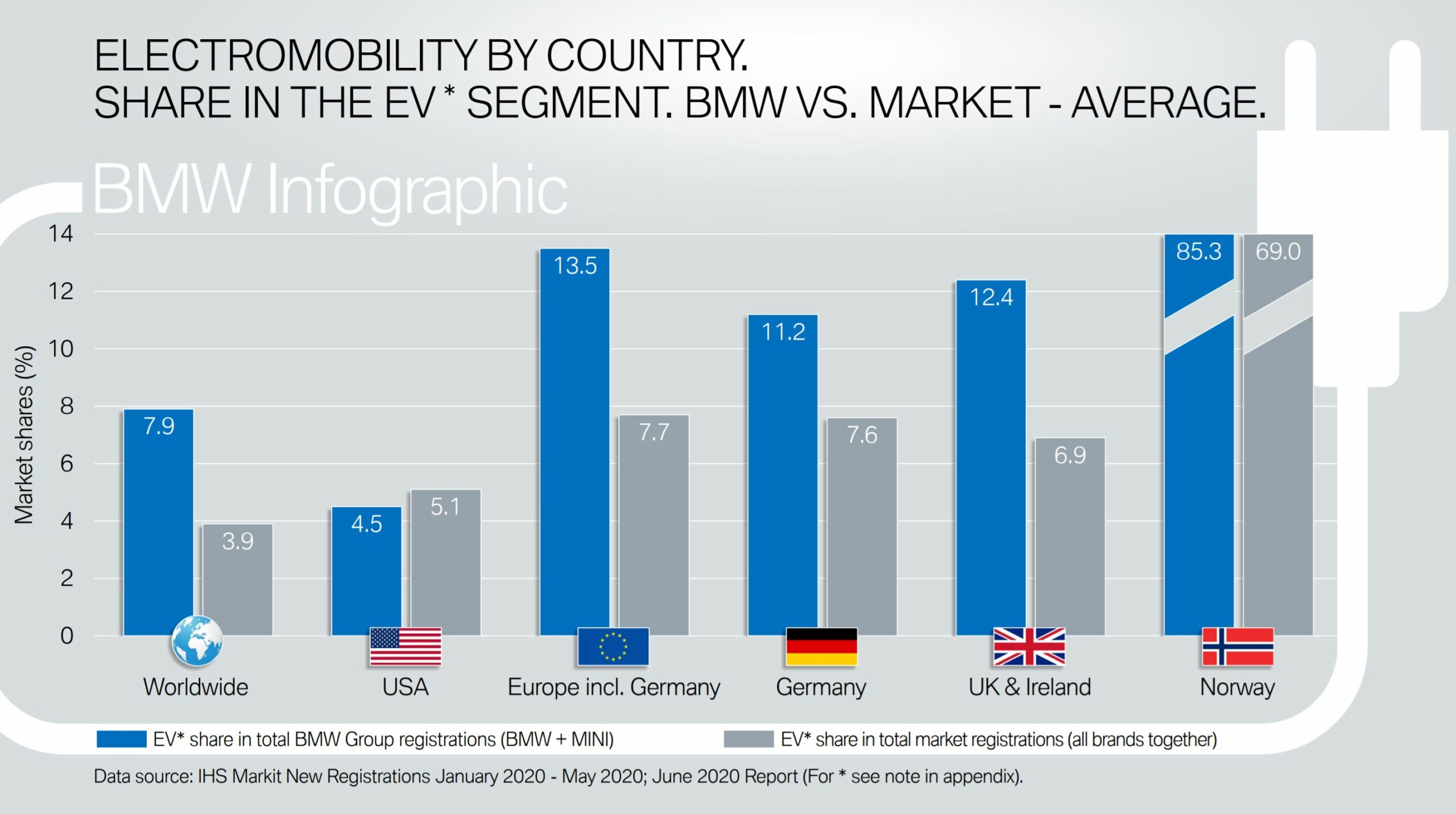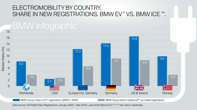 The top electric markets for BMW are the following: Norway (85 percent), UK (12.4 percent), Germany (11.2 percent), U.S. (4.5 percent). In all these markets, but the United States, the share of electrified vehicles sales in 2020 is higher than the models with a combustion engine.