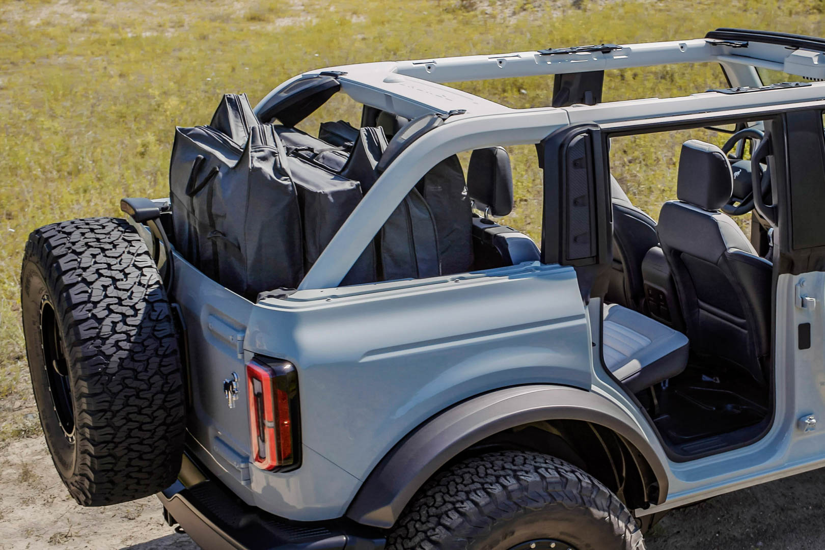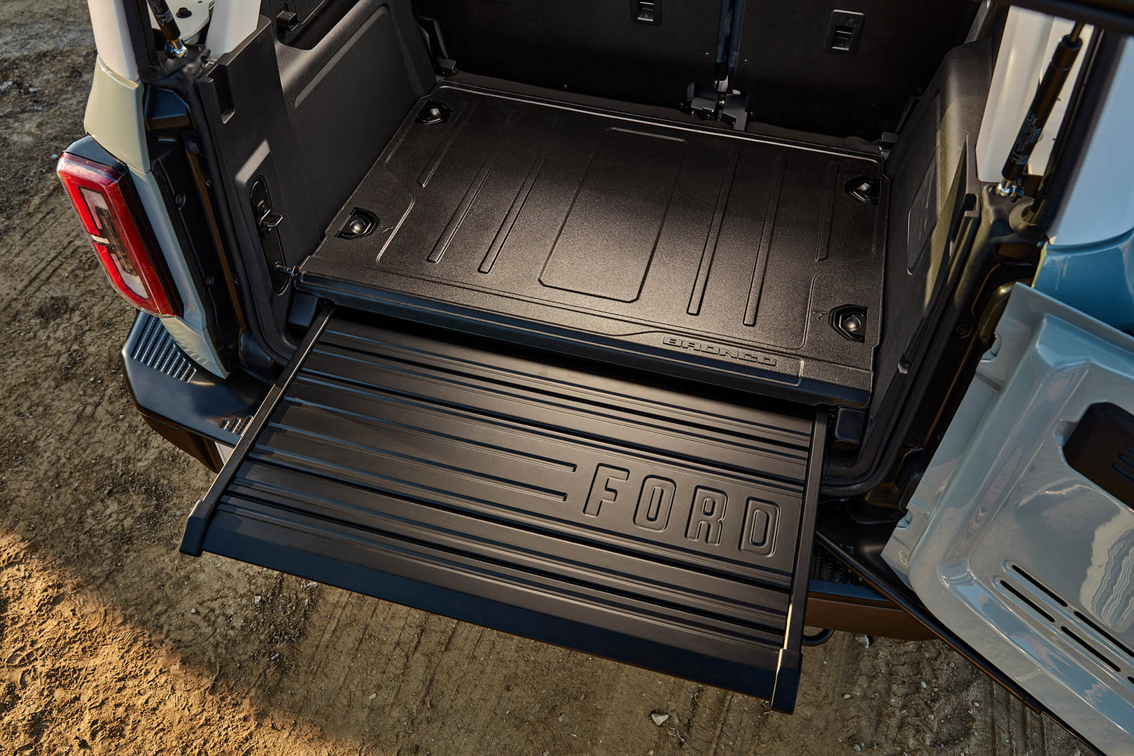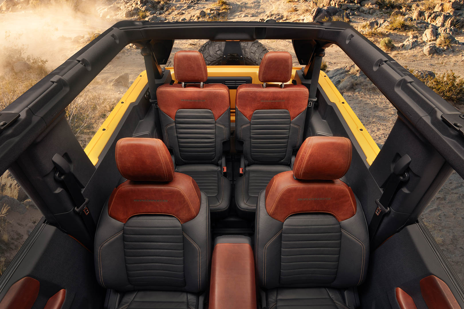 Like the Land Rover Defender, the entire interior is trimmed in a durable, waterproof rubberized coating, which not only allows it handle some rain or splashing while driving with the roof down but also allows it to be hosed off after a spirited day of off-roading. Also like the Defender, the cabin isn’t some spartan prison cell, as it’s packed with advanced technology, such as Ford’s latest SYNC 4 system and advanced trail mapping, with over 1,000 off-road trails pre-programmed into it.