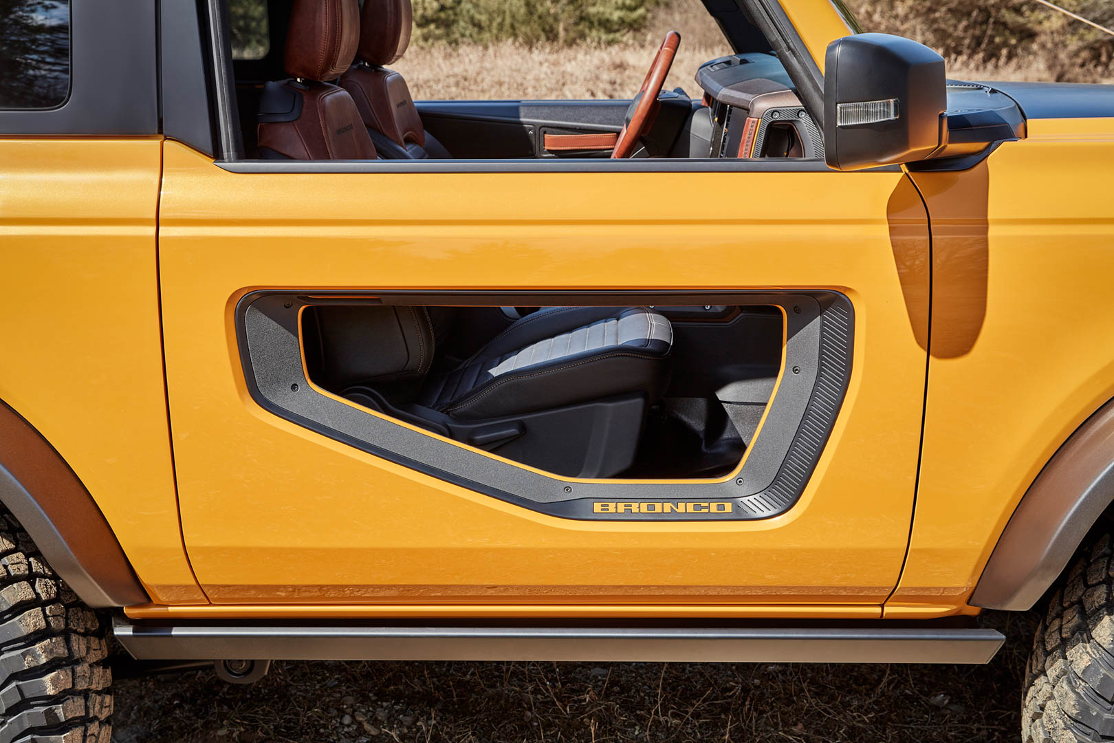 For instance, in classic Bronco fashion, the frame-less doors are removable, as they are on a Jeep Wrangler, but Ford was clever to put the side mirrors on the hood’s cowl, so that they still stay on the car with the doors off, unlike a Wrangler. Not only does the Bronco keep its mirrors with the doors off but those mirrors house the cameras to see the front wheels when off-roading, so the driver keeps that functionality, too.