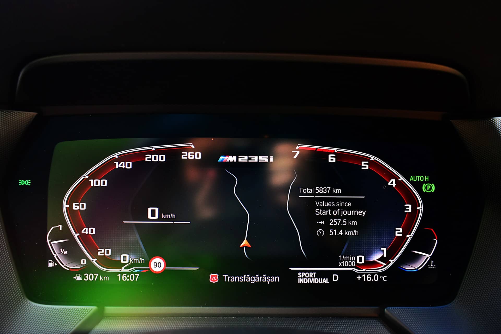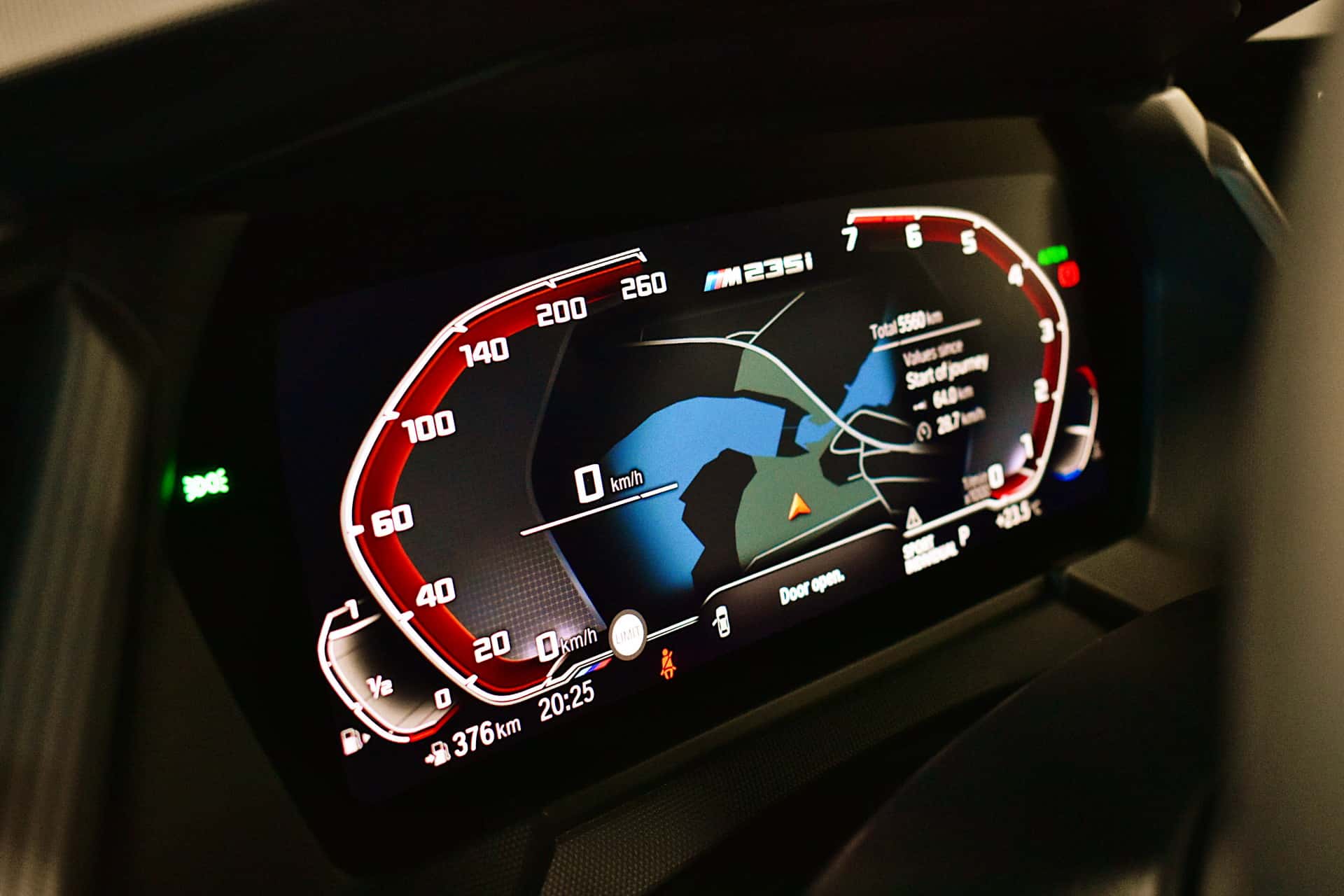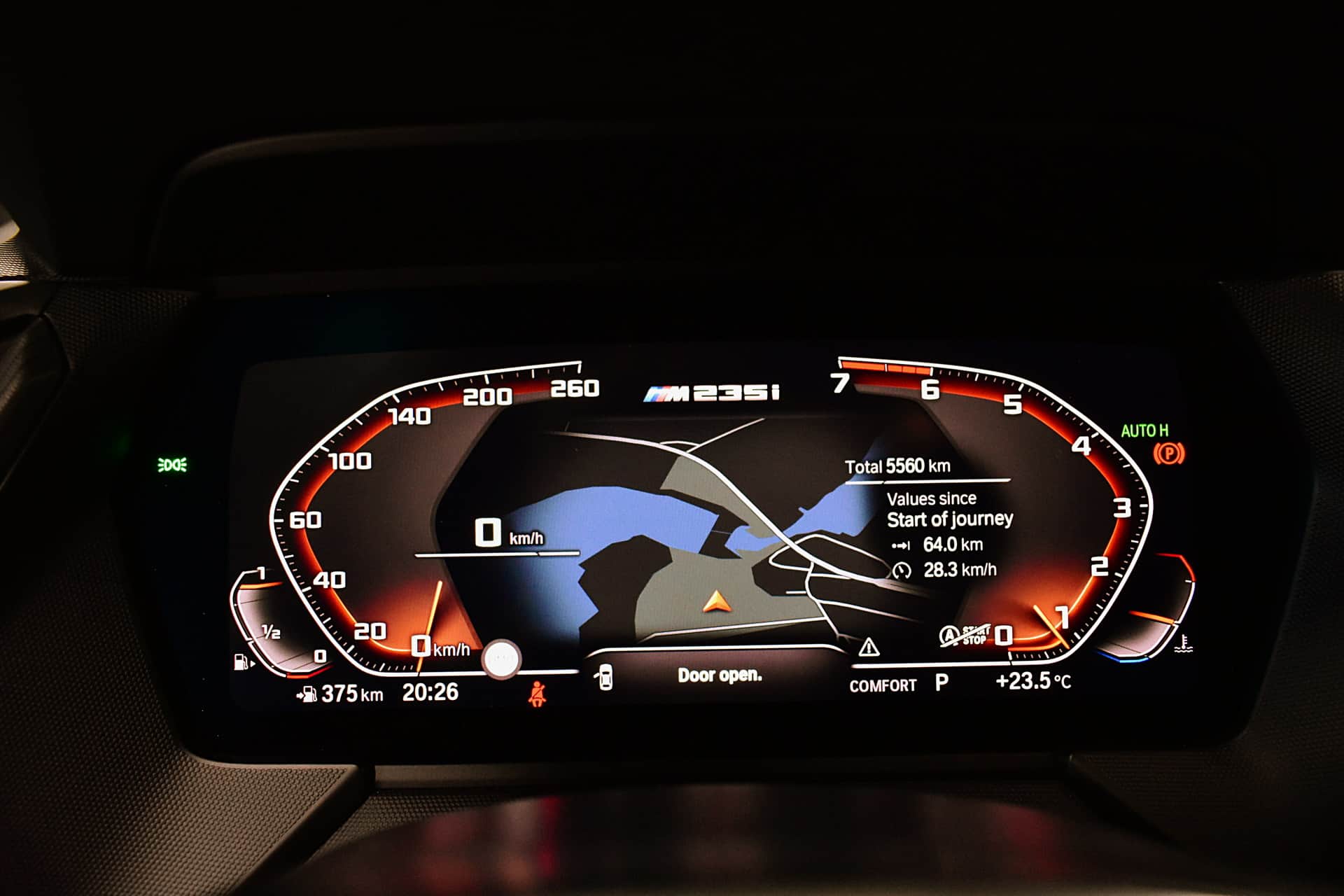 In terms of dashboard adornments, the car was specced with the Illuminated Boston trims. The M235i logo stands proudly in the digital instrument cluster and can also be found on the door sills.