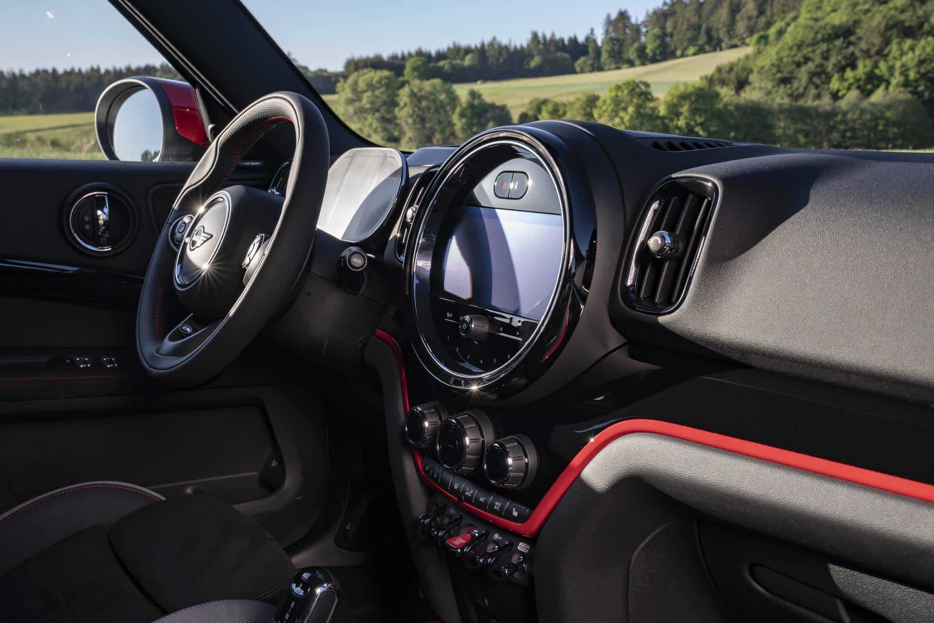 The interior features new tech. The digital instrument display behind the steering wheel with a diameter of 5.0 inches is a new optional equipment component. The optional Connected Media equipment in the new MINI John Cooper Works Countryman also includes an 8.8-inch color display with touchscreen functions. In its new version, it has a bezel and touch-sensitive control panels with high-gloss Piano Black surfaces.