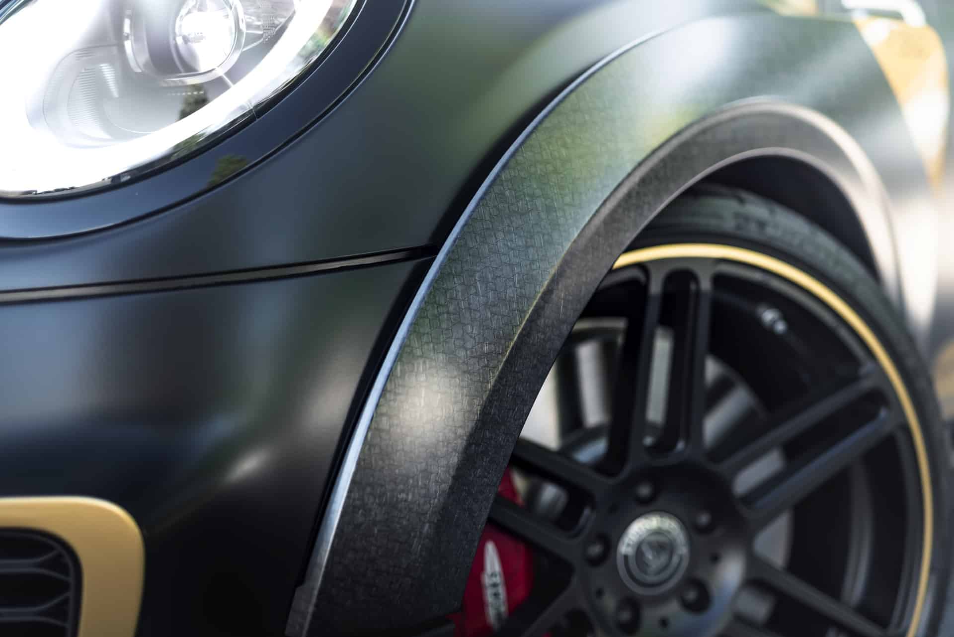 The look of the Manhart GP3 F350 will also stand out in the crowd. The standard fender flares and the huge rear wing of the MINI John Cooper Works GP get some golden accents. Next, the air inlets and the diffuser are also painted with the same golden accents.
