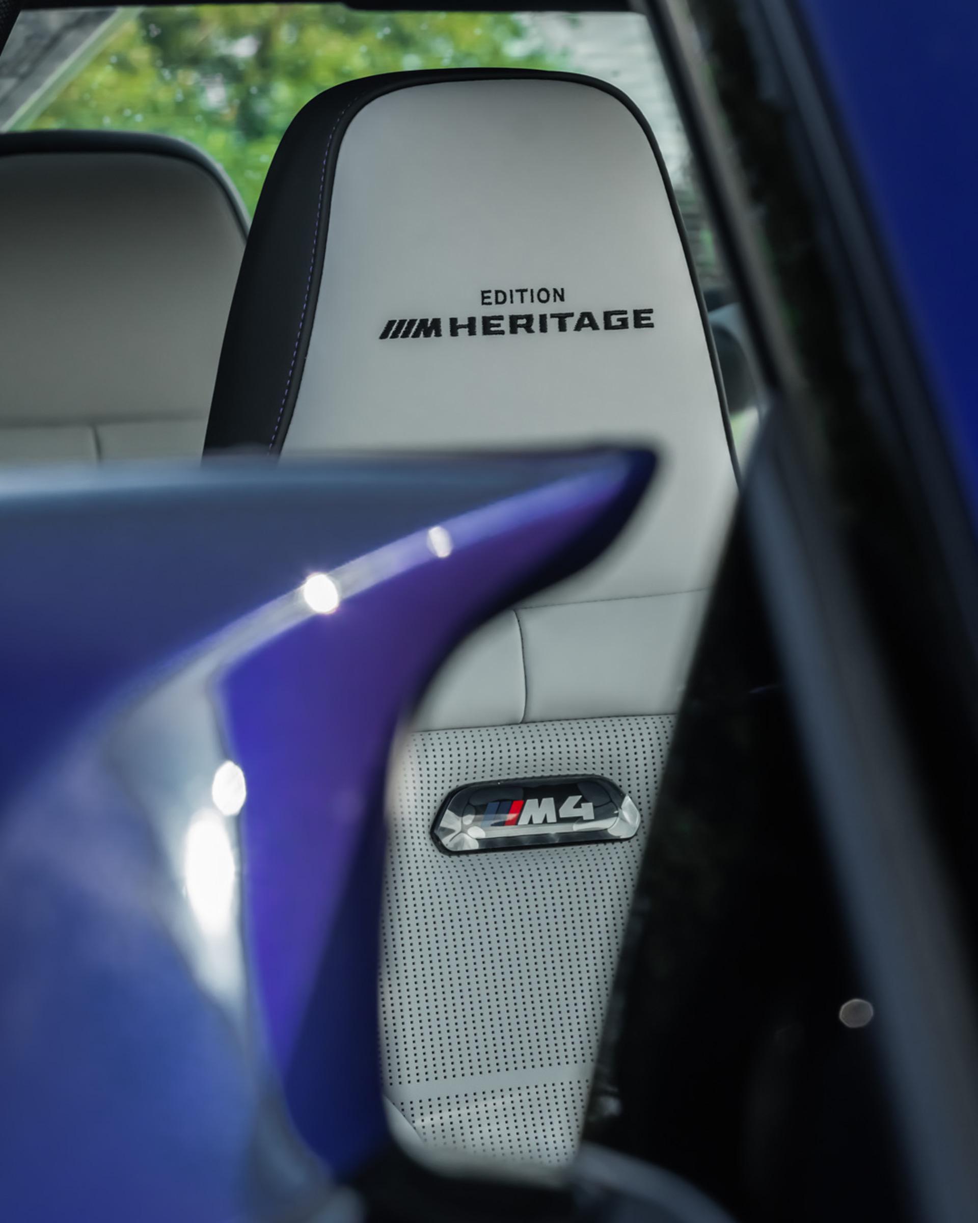 Inside, the special BMW M4 Edition M Heritage features full leather M seats in a bicolor design. Each seat color is oriented towards the exterior paint and is complemented by partly bicolored contrast stitching.