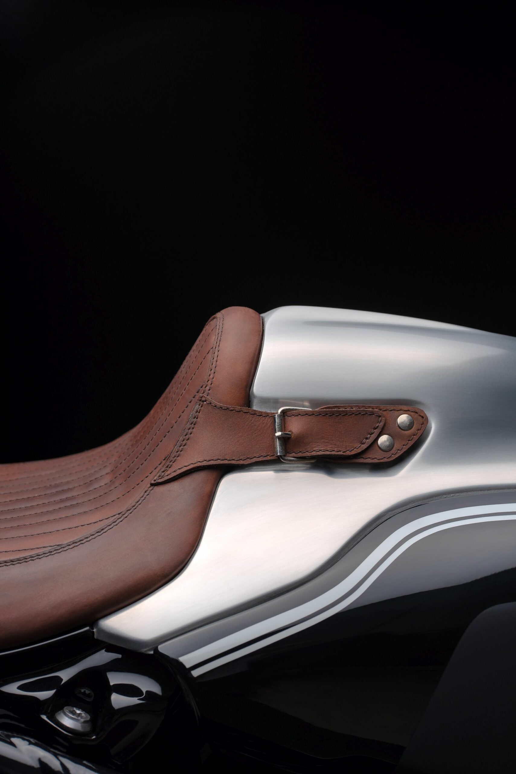 For this project he decided to start from the back and move towards the front. His creation uses the stock supporting structure of the rear fender, seat and pillion. To make things more interesting, a stop light from Kellermann was added while the fuel tank was heavily modified.