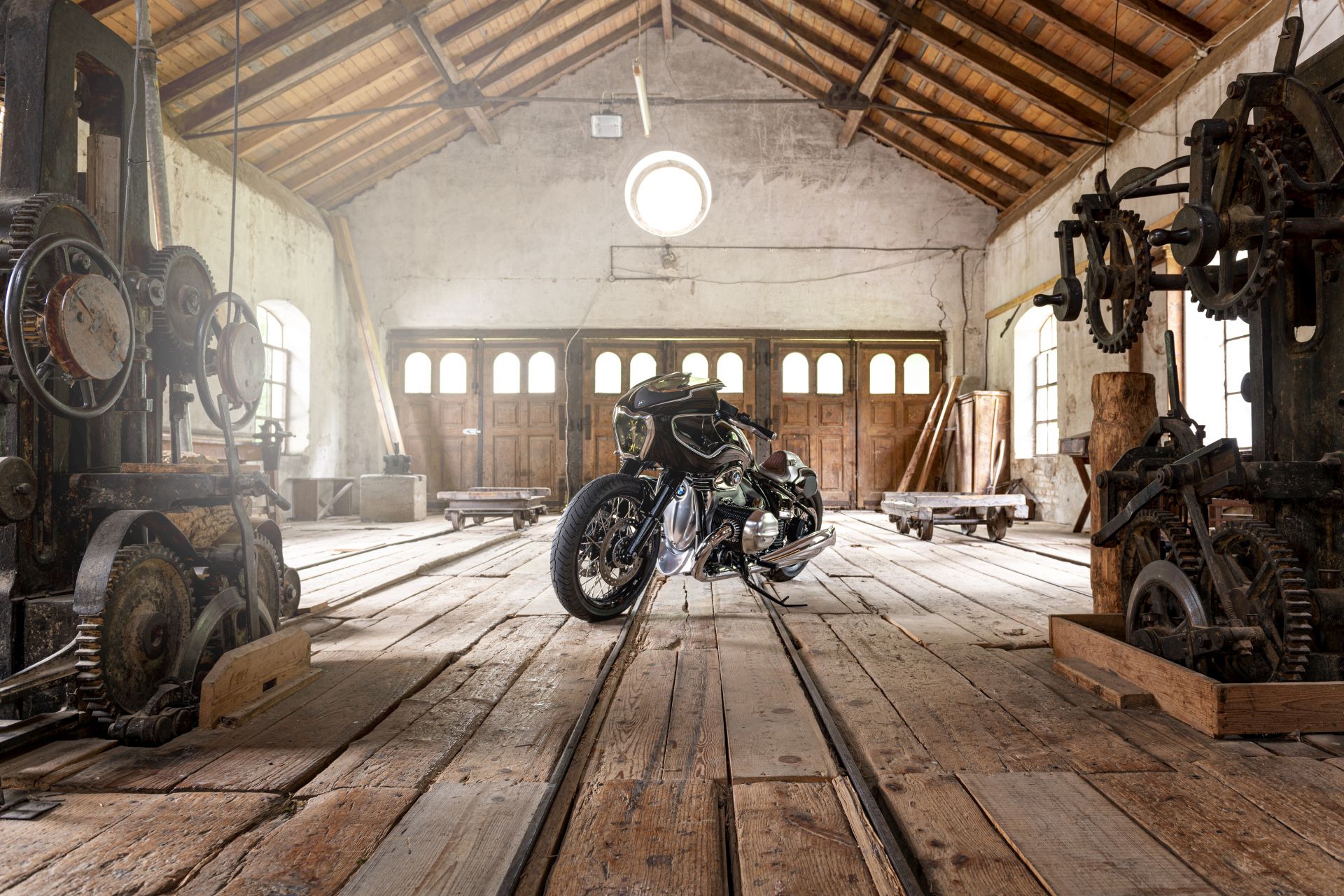 Analogous to the classic boxer engine, Blechmann placed a filament lamp prominently in the center. Here, too, the steering angle and the forward-tilted headlamp determine the basic layout of the custom bike. Bernhard Neumann perfected his personalization efforts with discreet black paint and classic white BMW Motorrad pin-stripes.