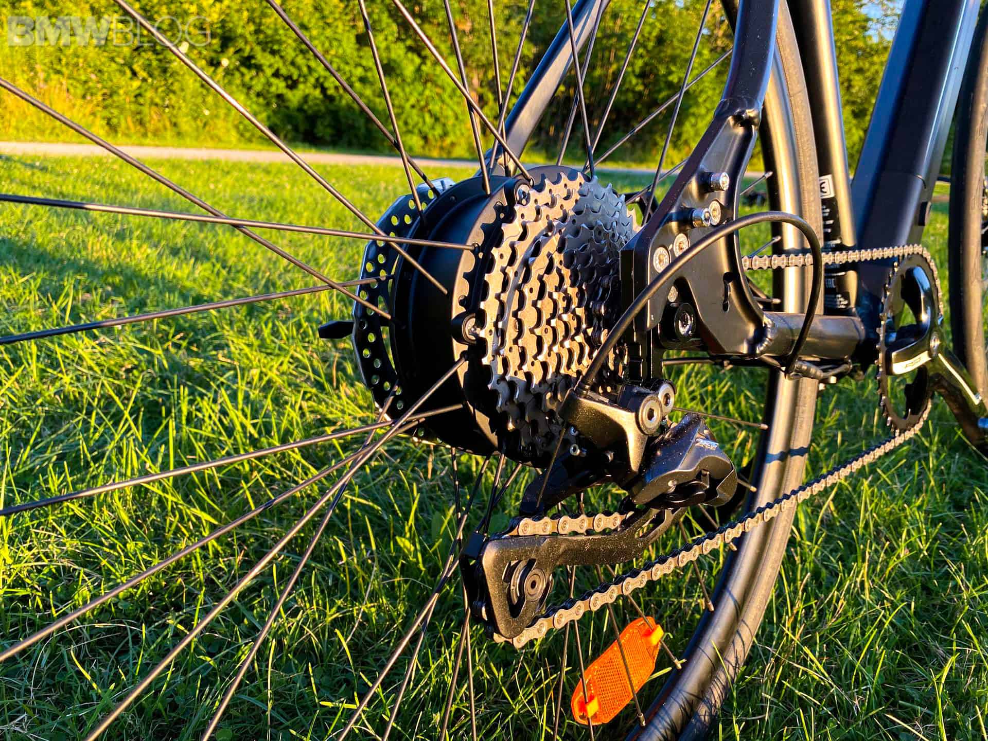 The electric motor is integrated in the rear hub which also houses a Deore/Shimano XT 10 gears derailleur. While riding in the city, I found the cassette to be adequate for urban riding, even when attempting to ride at higher speeds.