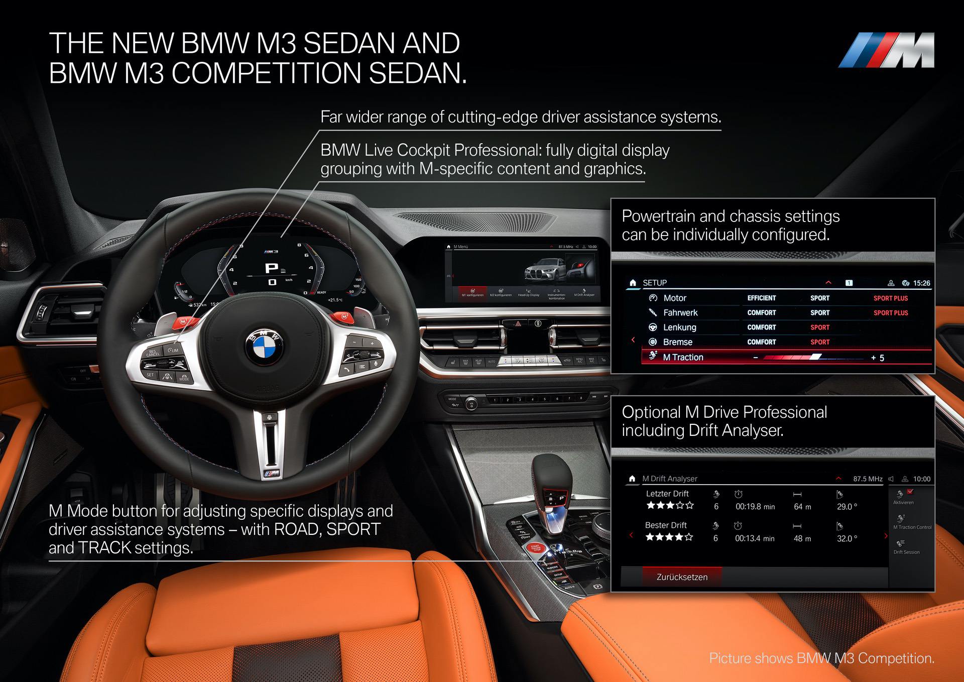The M3 also gets a new M Traction Control, which allows the driver to dial in specific levels of slip allowed by the car’s brain. Essentially, it uses all of those aforementioned systems to fine-tune the amount of slide it will allow before intervening and saving your life.