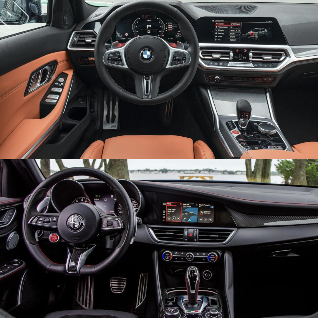On the inside, this is a bit interesting. The Alfa Romeo has more style. Its sculpted dashboard with contrast stitching looks really good. The way its infotainment screen is built into the dash is nicer looking than the Bimmer’s, its analog gauges are sportier and its steering wheel is far better looking, especially thanks to those big metal paddles. The M3’s cabin looks good, too, it’s just a bit boring. Aside from the cool color in these photos, there’s really nothing to stand out.