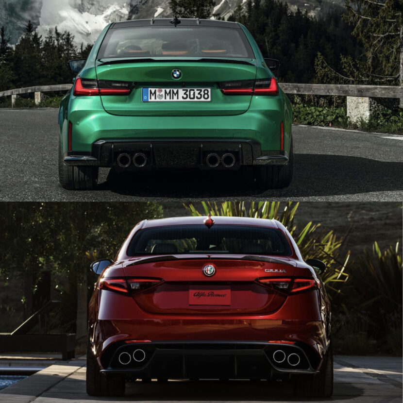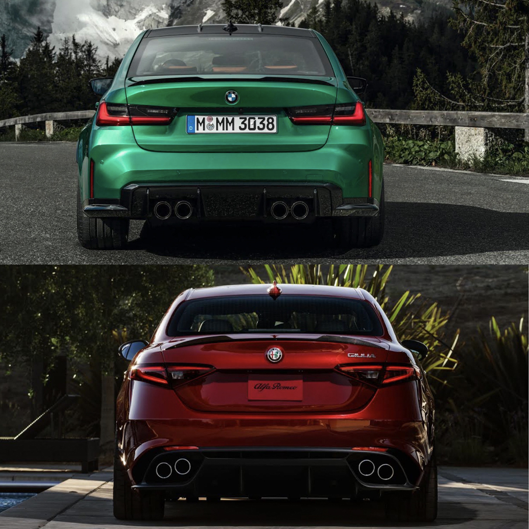 Out back, it’s a closer matchup than from any other angle. Both cars have slim-ish taillights, similar rear spoilers and quad exhausts. I like the rear diffuser of the Alfa, which makes it seem sportier than the M3 but I’m actually gonna give the nod to the Bimmer from behind. The way its rear wheel arches flare out from behind give it a more athletic, menacing look than the Alfa.