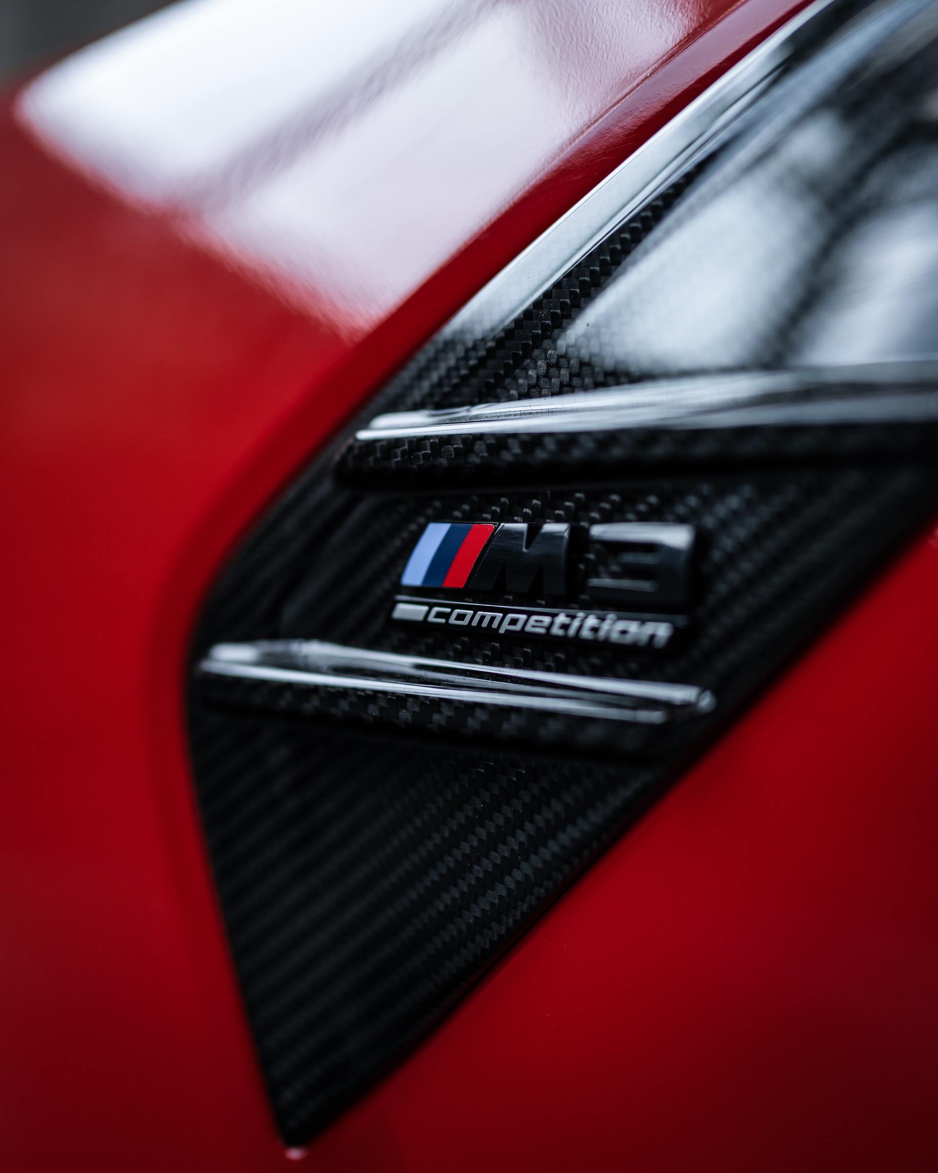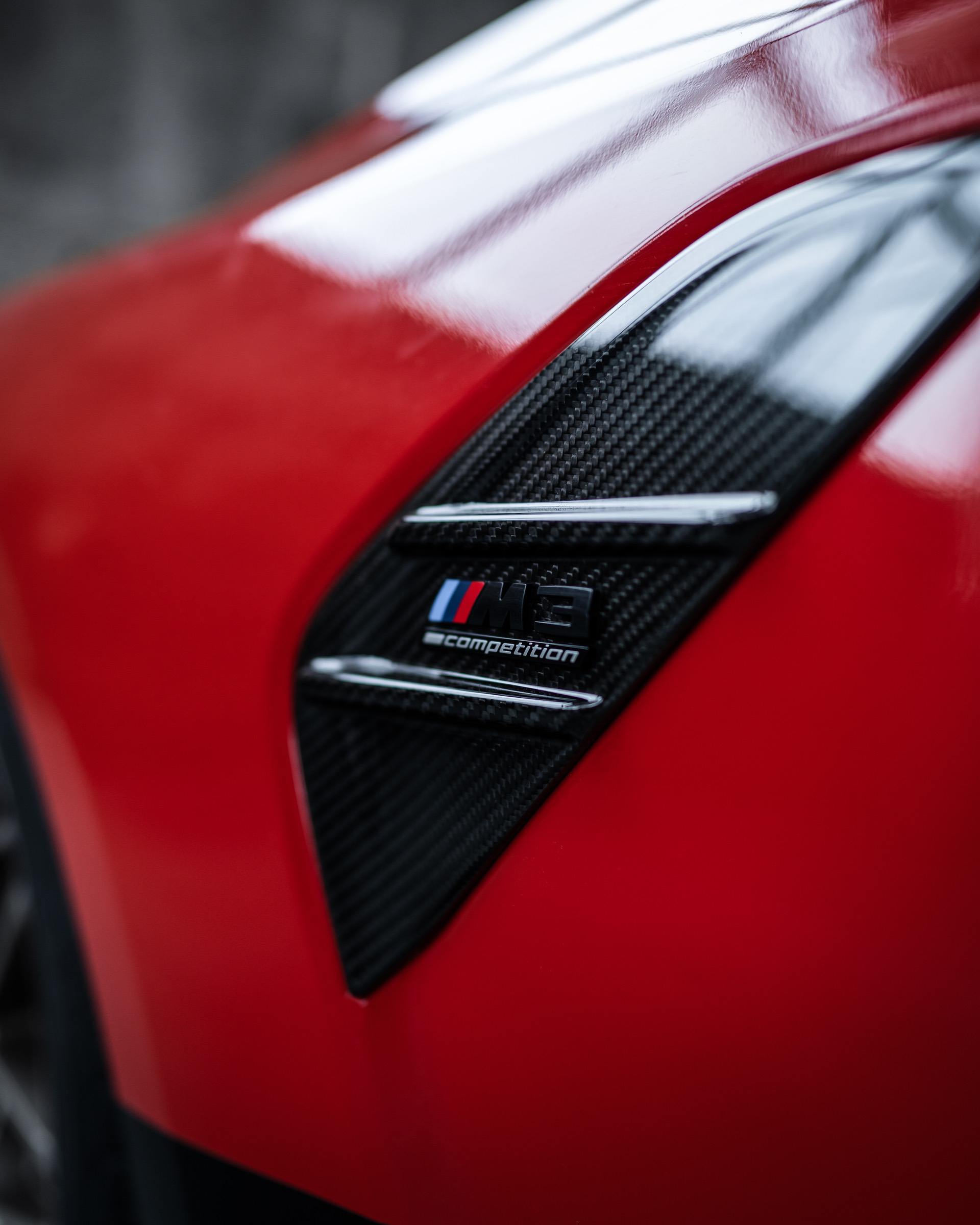 Furthermore, there is a wide range of carbon fiber M Performance Parts for the new M3 and M4. It all starts at the front with the M Performance carbon front attachment, the M Performance carbon front splitter and the carbon M Performance Aero Flicks. On the side, you can see the M Performance carbon air breathers and M Performance carbon side skirt trims.