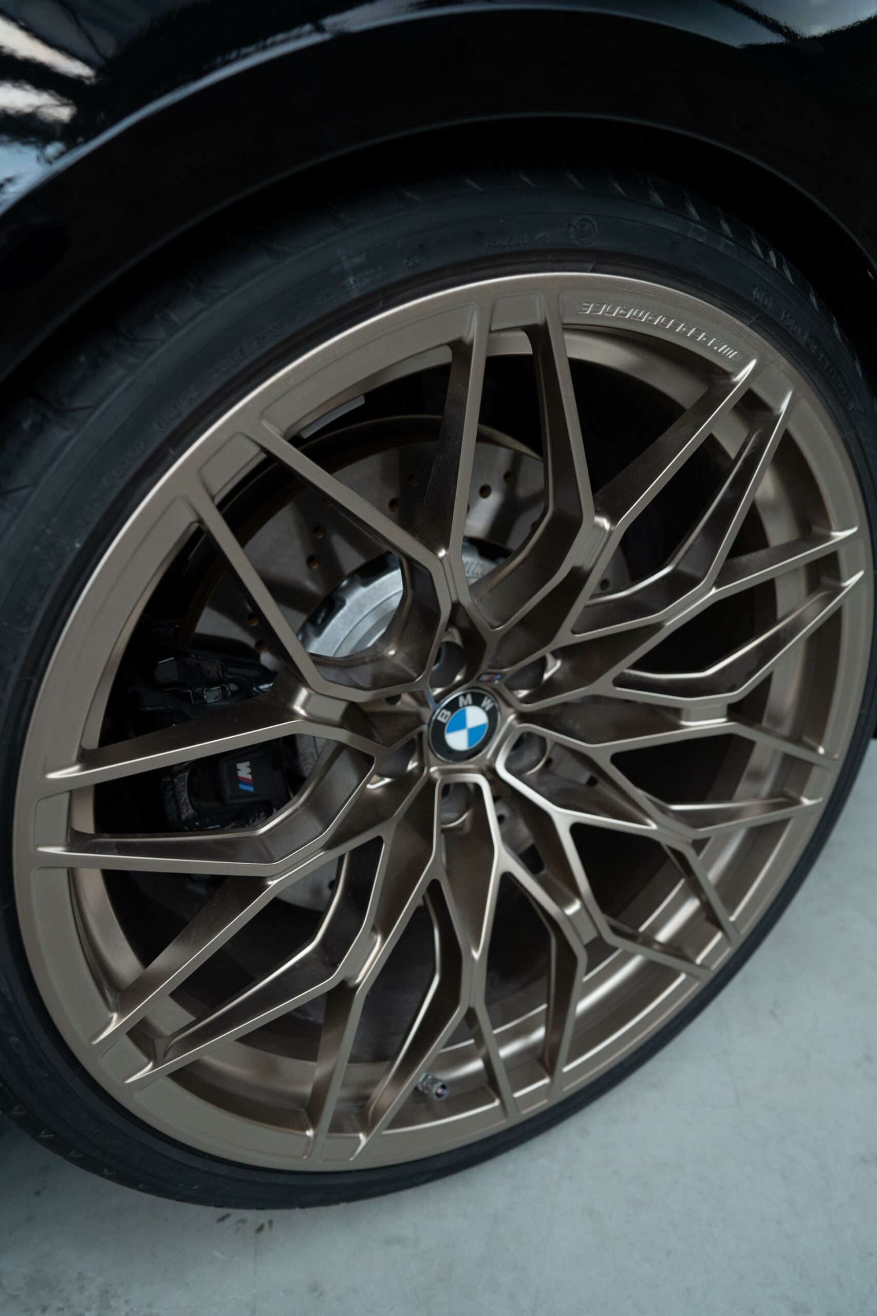 The wheels shown here are the cross-spoke forged wheel 1000M in Gold Bronze matte with M Performance lettering. The wheels are available exclusively from M Performance Parts in the sizes 20 inch at the front and 21 inch at the rear.