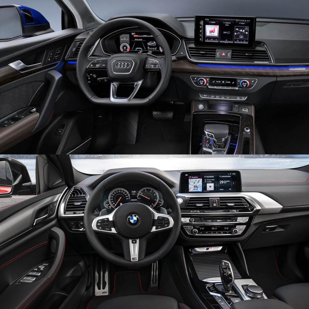 Out back, the BMW X4 is a bit more muscular and has a bit more visual drama. The Audi Q5’s taillights are really nice, though, and better than the Bimmer’s. Having said that, the Q5 loses automatically at the rear end for having fake exhausts.