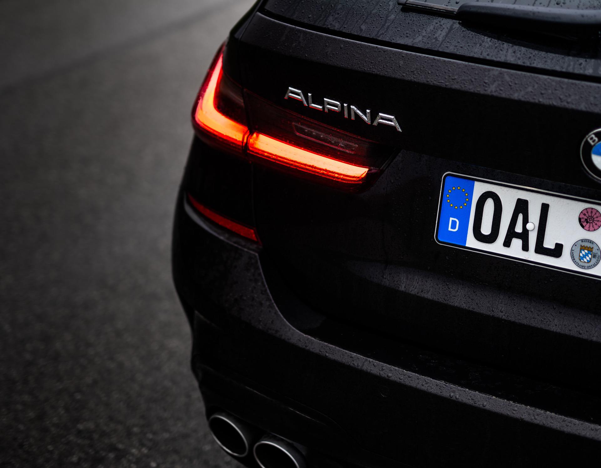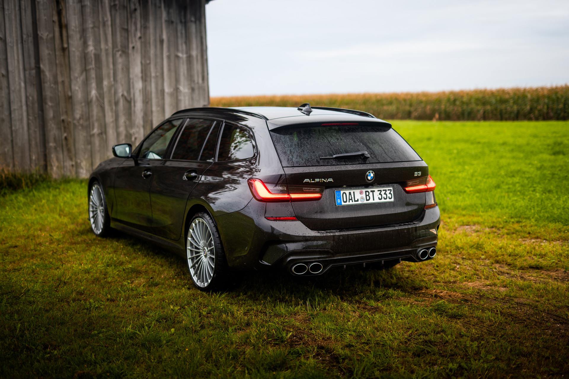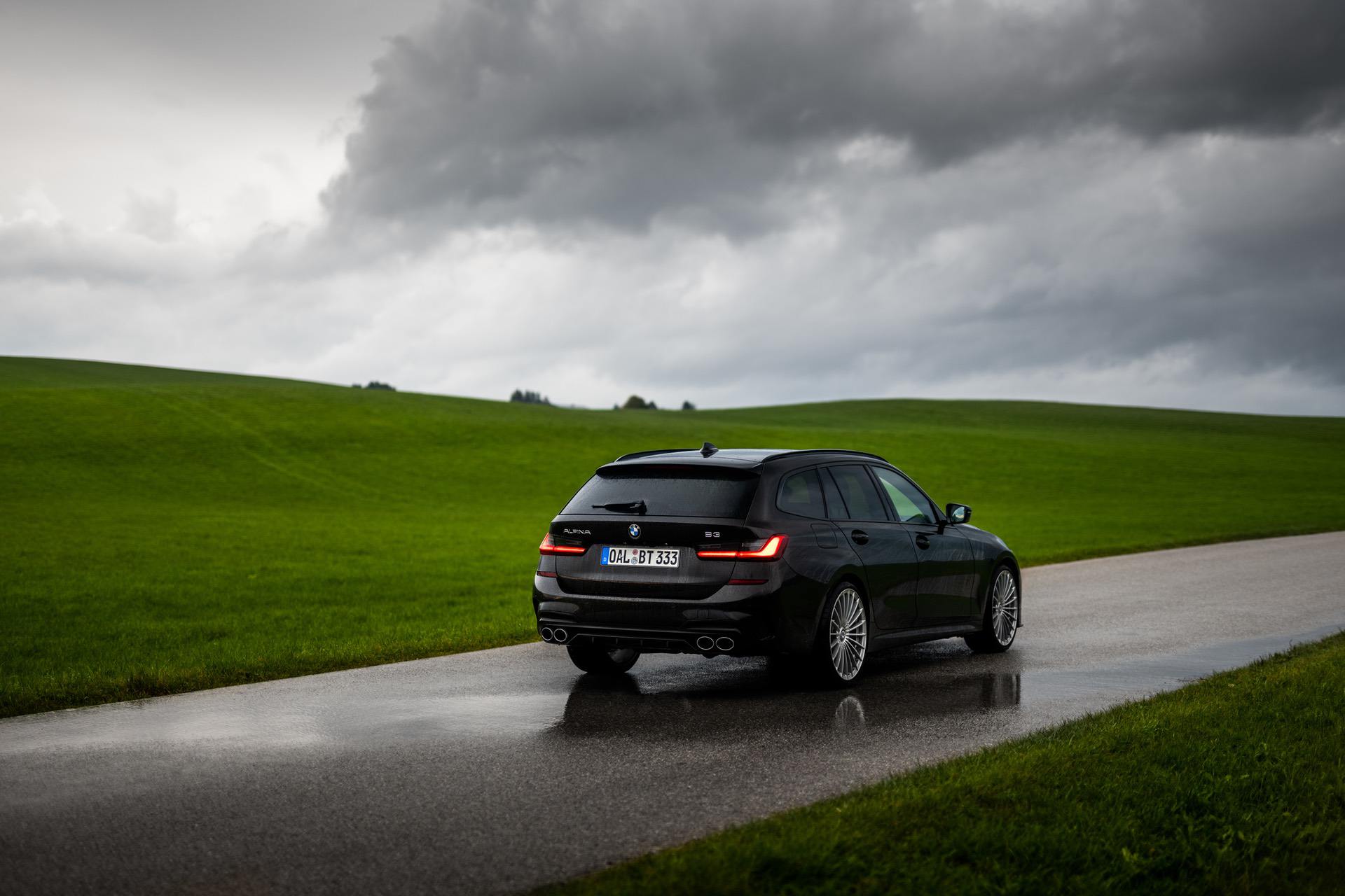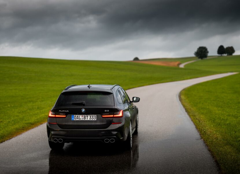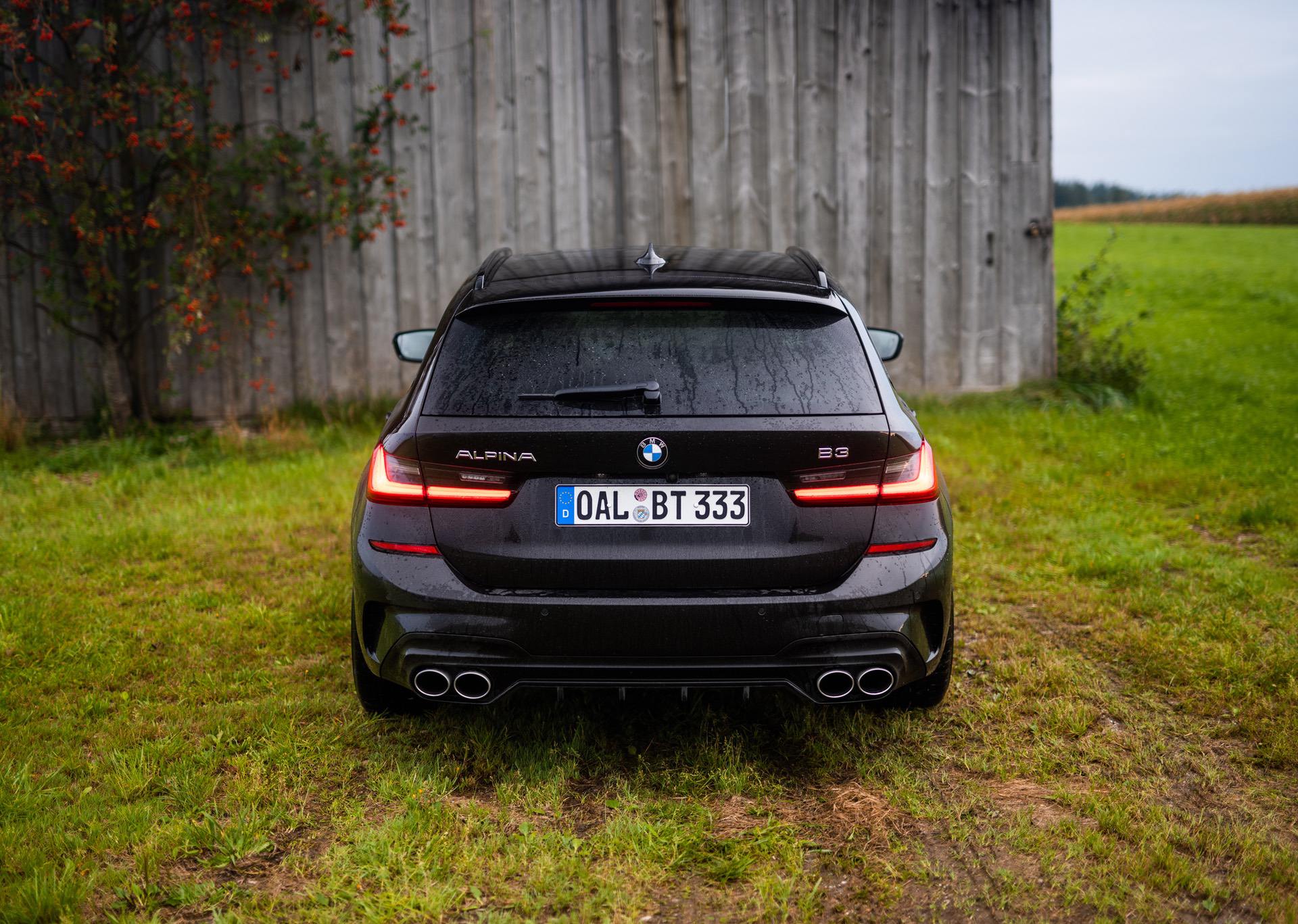 Up on our arrival at the ALPINA headquarters, we were greeted by an ALPINA B3 Touring dressed in a black individual color and almost completely blacked-out exterior except for the silver grille, silver 20-inch multi-spoke wheels (saving 13,7 kg of unsprung mass) shod in Pirelli rubber and the four signature tailpipes.
