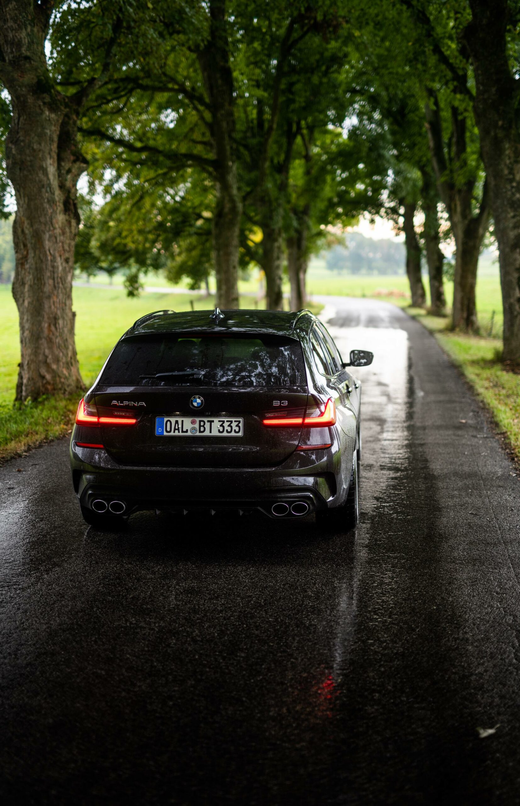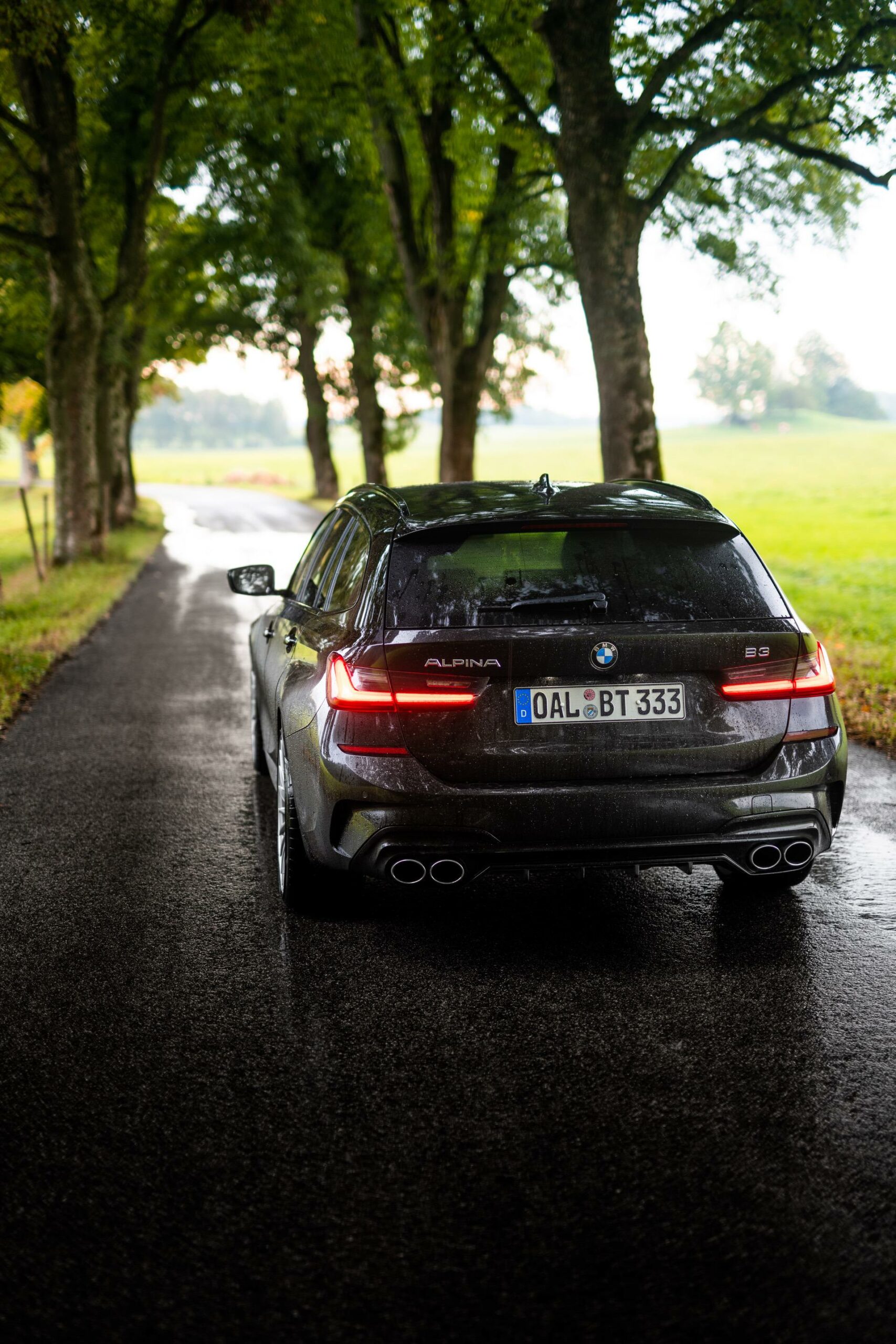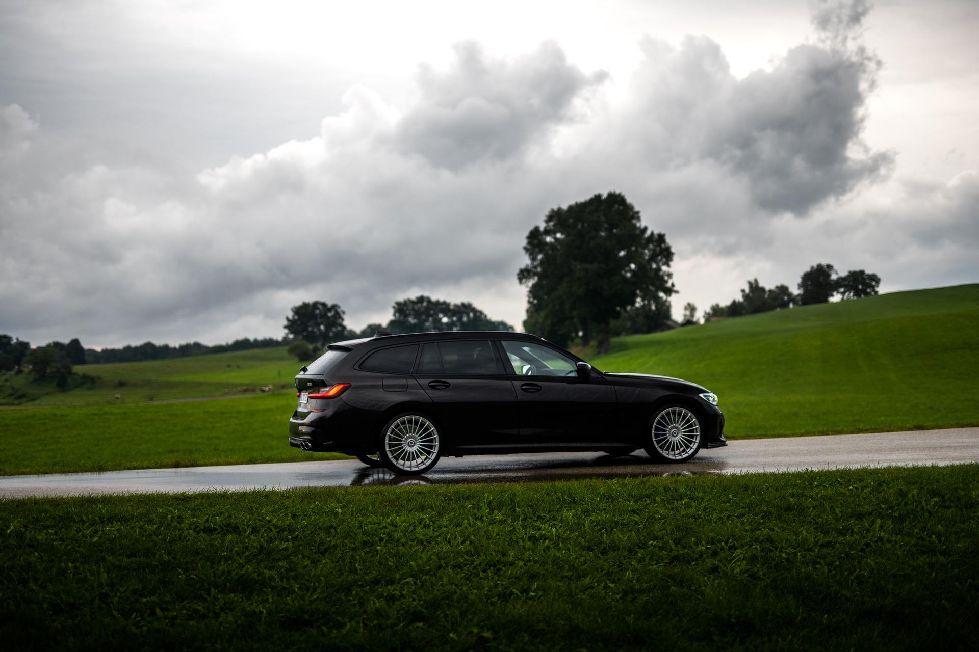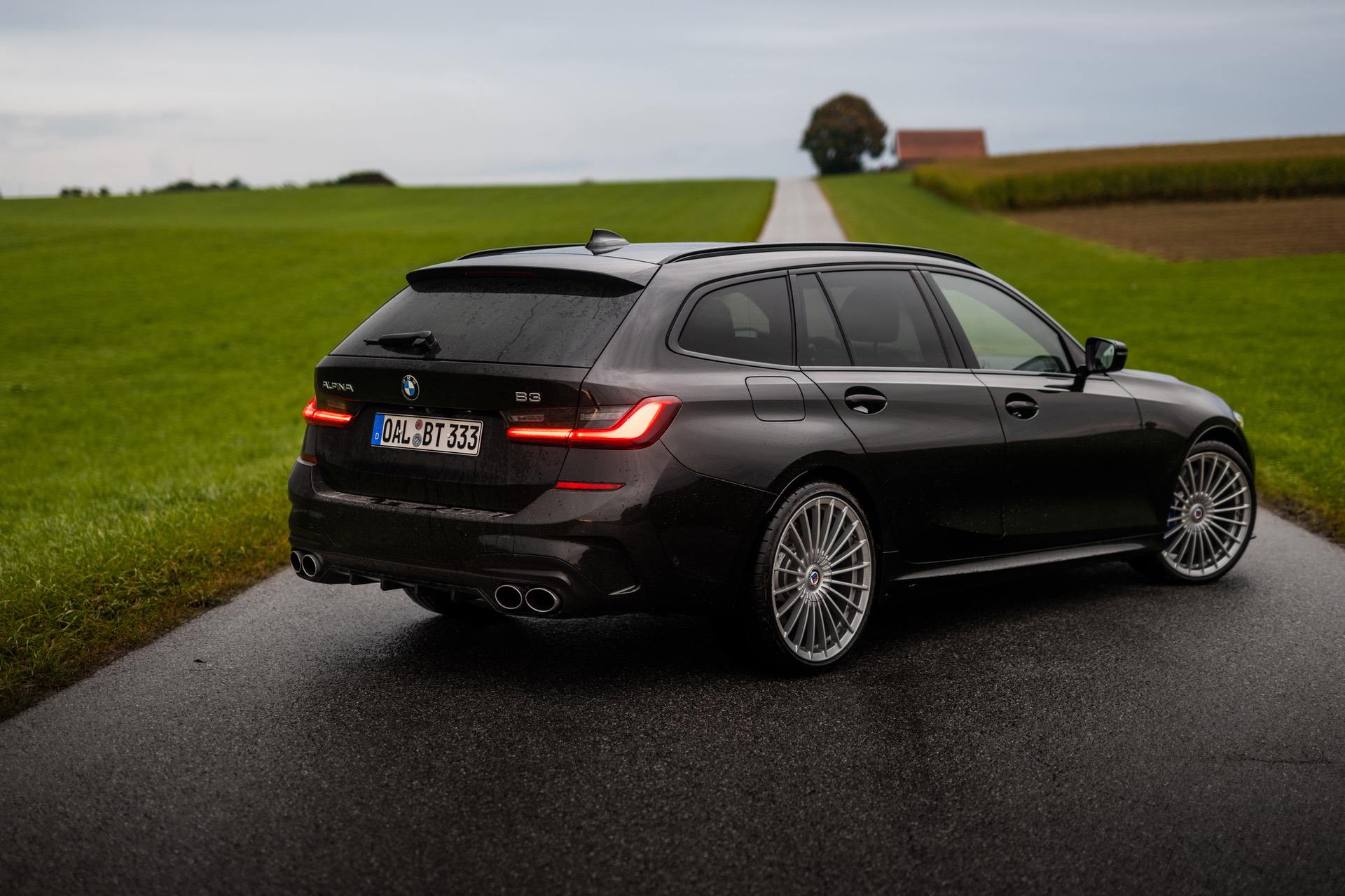 Up on our arrival at the ALPINA headquarters, we were greeted by an ALPINA B3 Touring dressed in a black individual color and almost completely blacked-out exterior except for the silver grille, silver 20-inch multi-spoke wheels (saving 13,7 kg of unsprung mass) shod in Pirelli rubber and the four signature tailpipes.