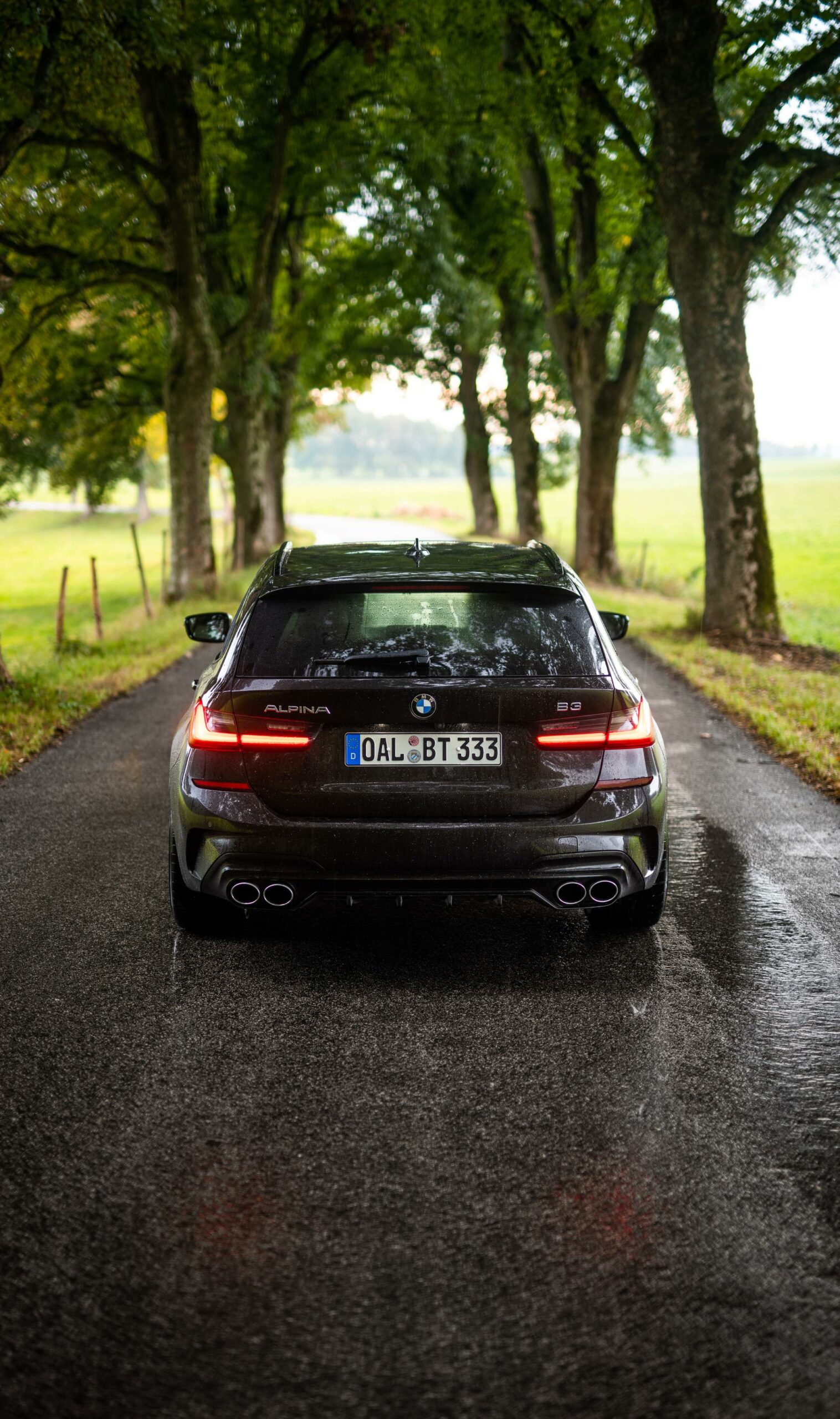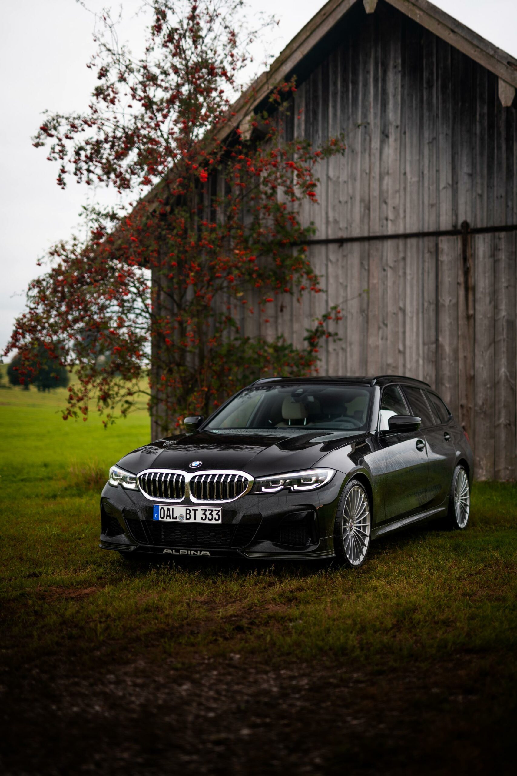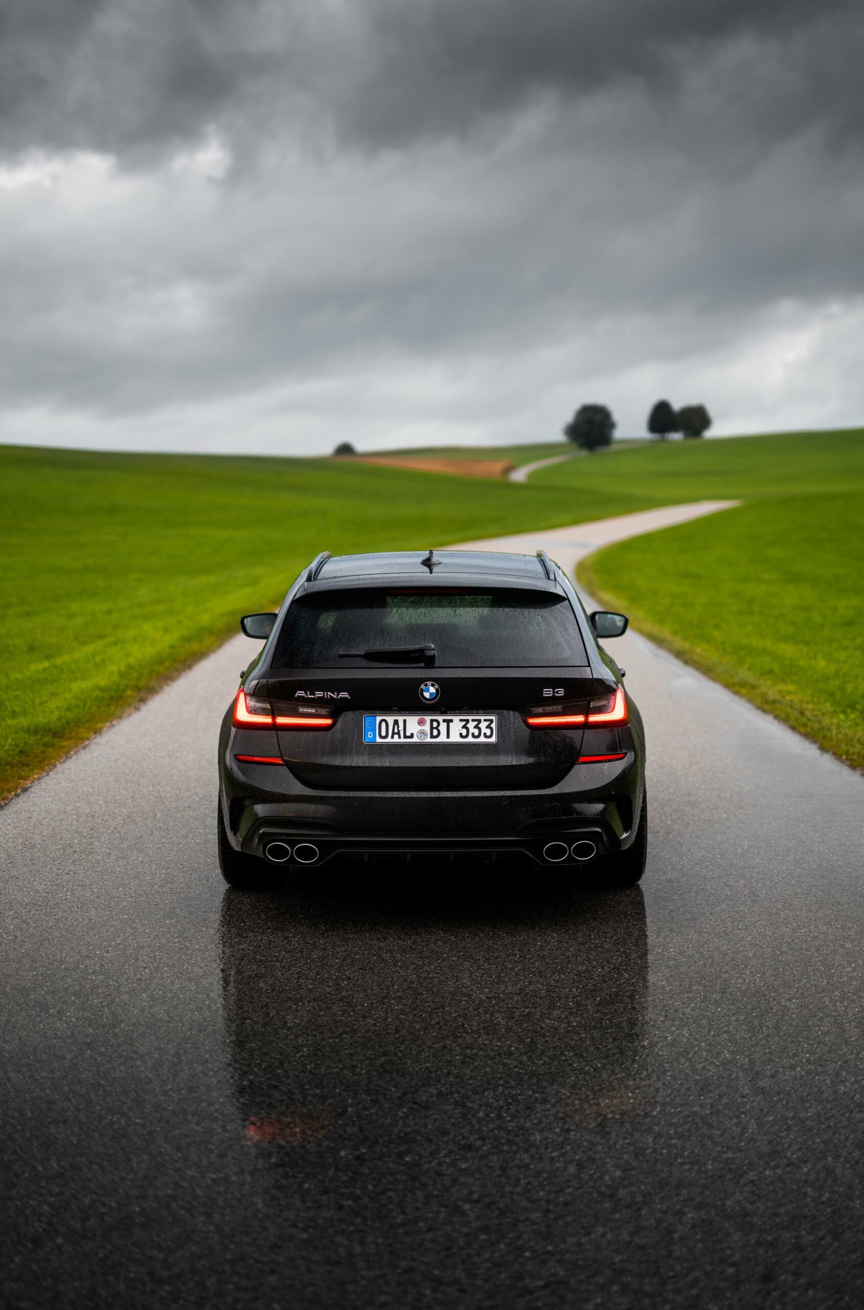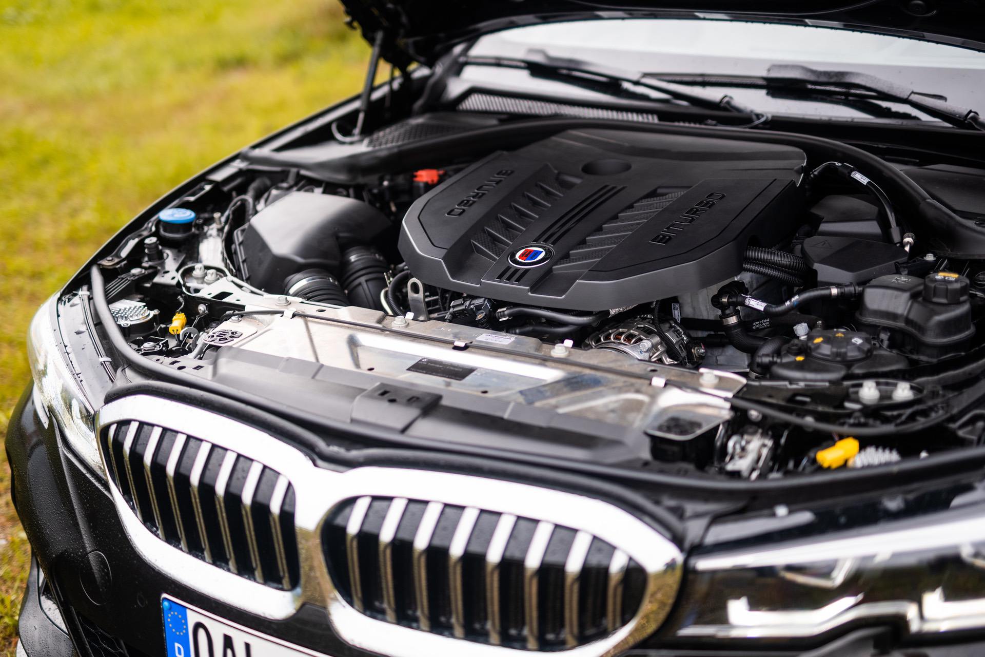 Up on our arrival at the ALPINA headquarters, we were greeted by an ALPINA B3 Touring dressed in a black individual color and almost completely blacked-out exterior except for the silver grille, silver 20-inch multi-spoke wheels (saving 13,7 kg of unsprung mass) shod in Pirelli rubber and the four signature tailpipes.