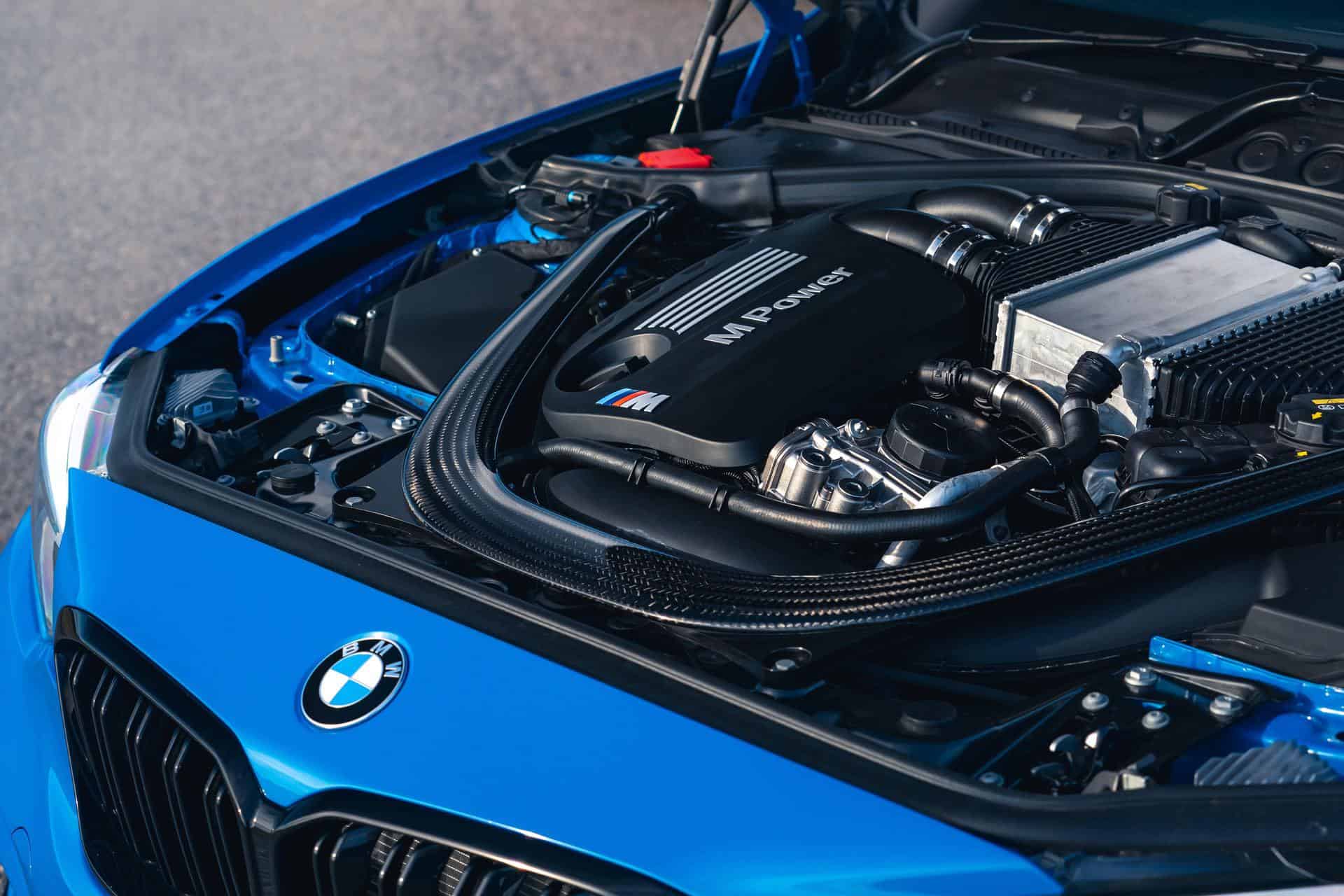 At the front, you will notice the new carbon splitter, which offers improvements on the handling and is combined with a new carbon rear spoiler. Other carbon fiber parts are the M Performance rear diffuser, the two M Performance mirror caps and two more important upgrades. First of is the bonnet, which offers additional weight saving on the front axle, plus improved hot air flow via the vent.