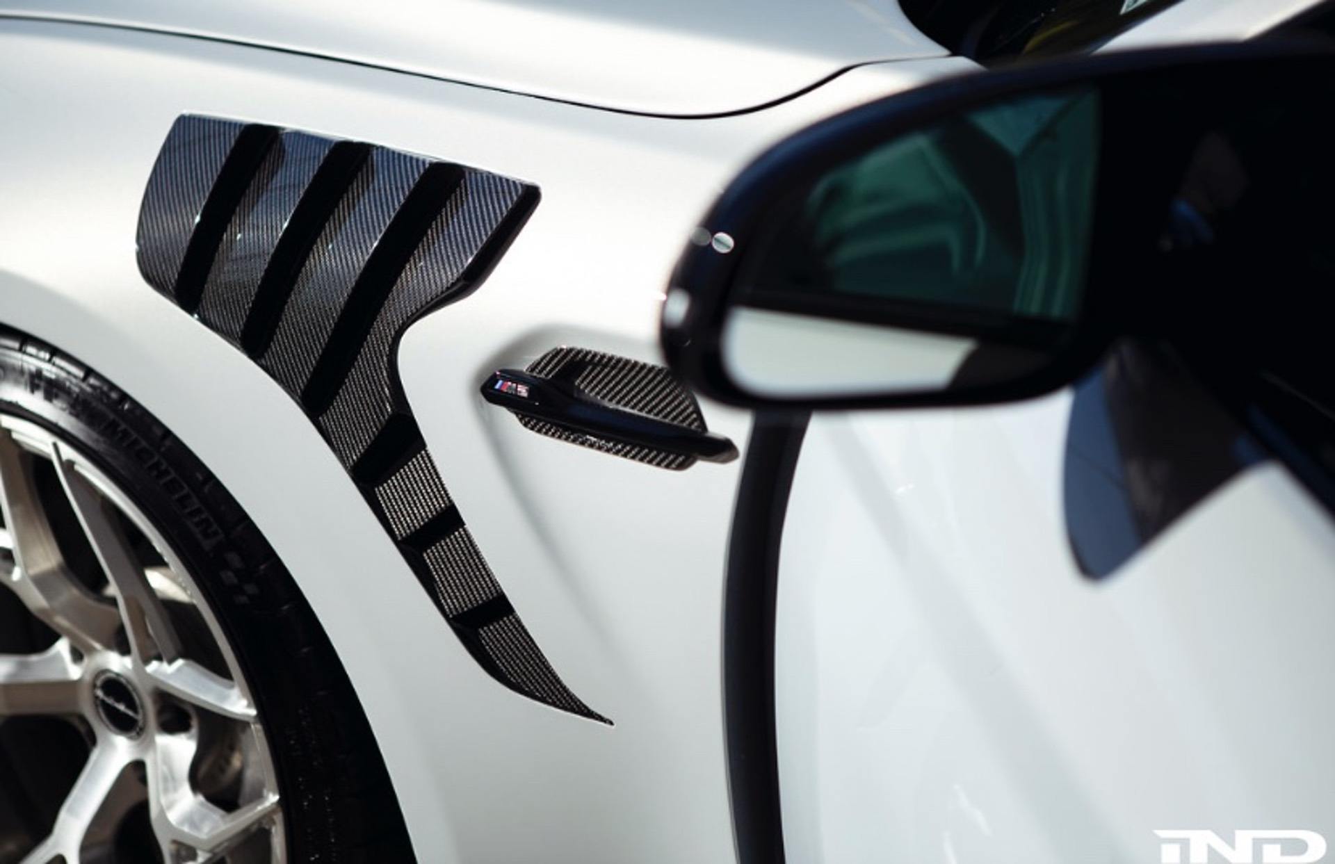 Up front, it has a carbon fiber hood, carbon fiber fender vents, a carbon fiber front lip and even carbon fiber canards. So it has the front-end aero down. There’s no doubt the front end of this M2 Comp will have plenty of grip.