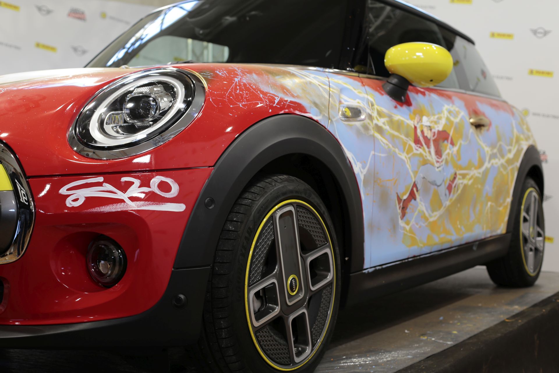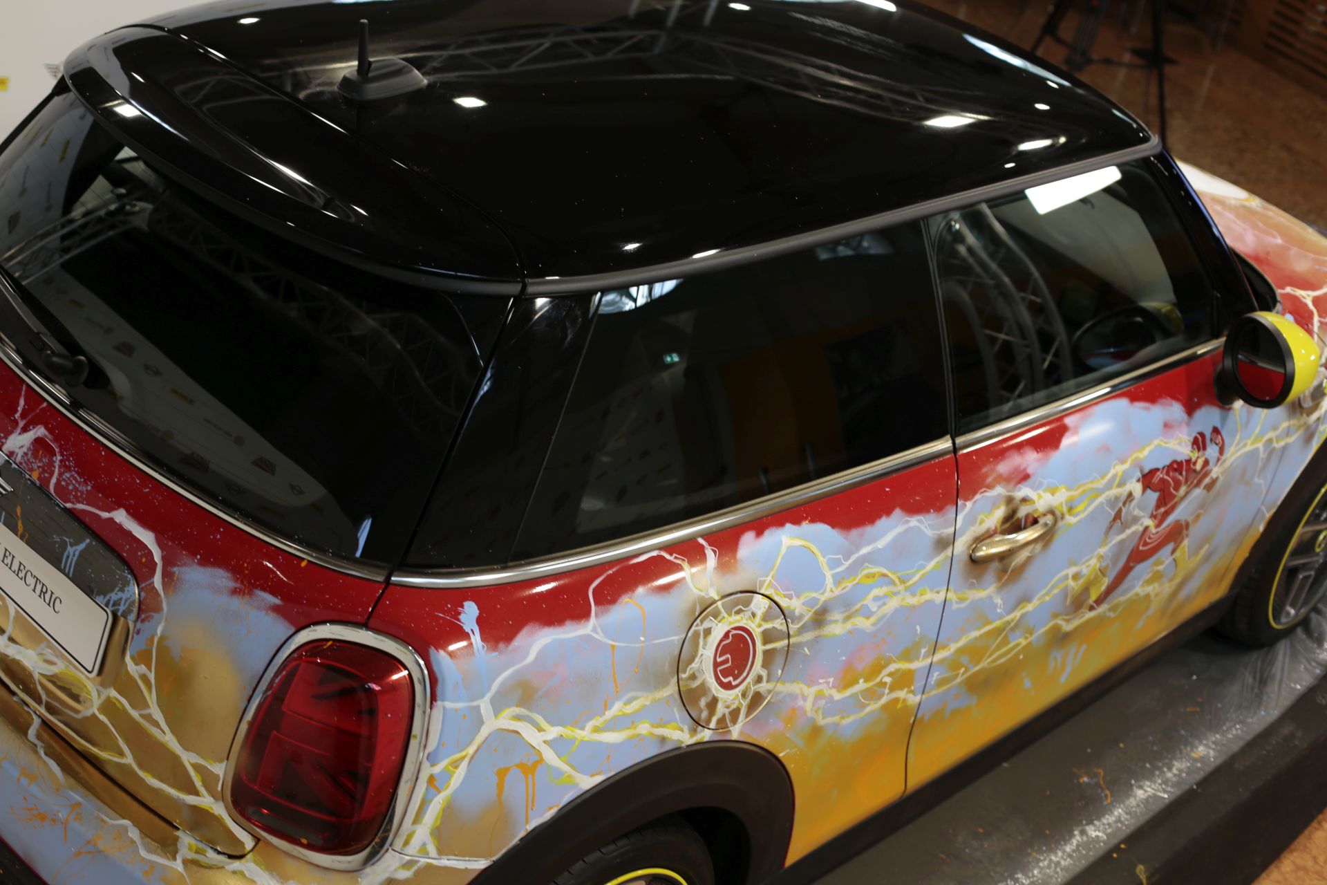 In the background, just like in the original book cover, you can spot the city where all of his adventures take place: Central City. To keep on pace with the superhero and the car, Carmine di Giandomenico designed the full graphics for the MINI Electric in record speed, being done in just 10 hours, using a mixed technique.