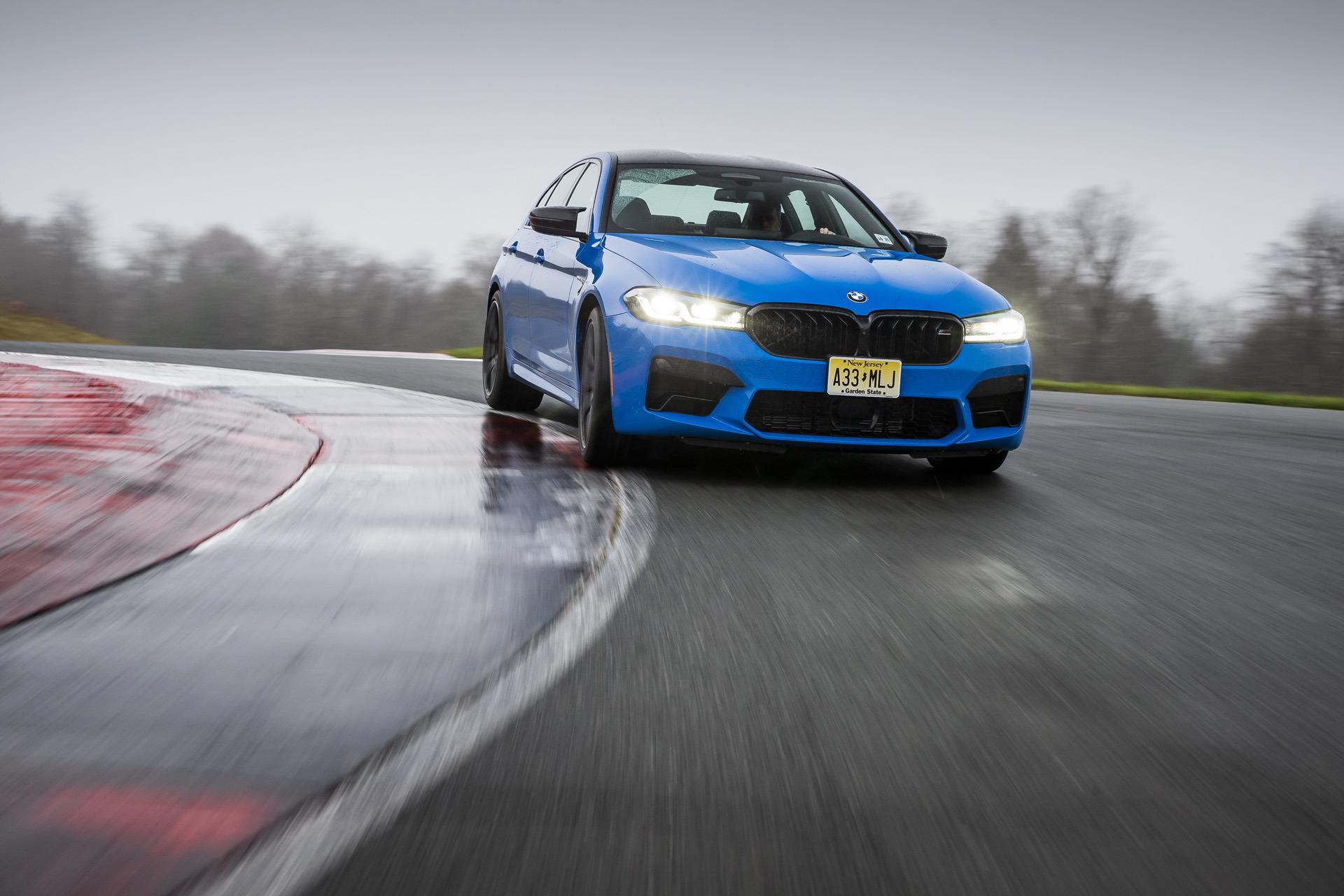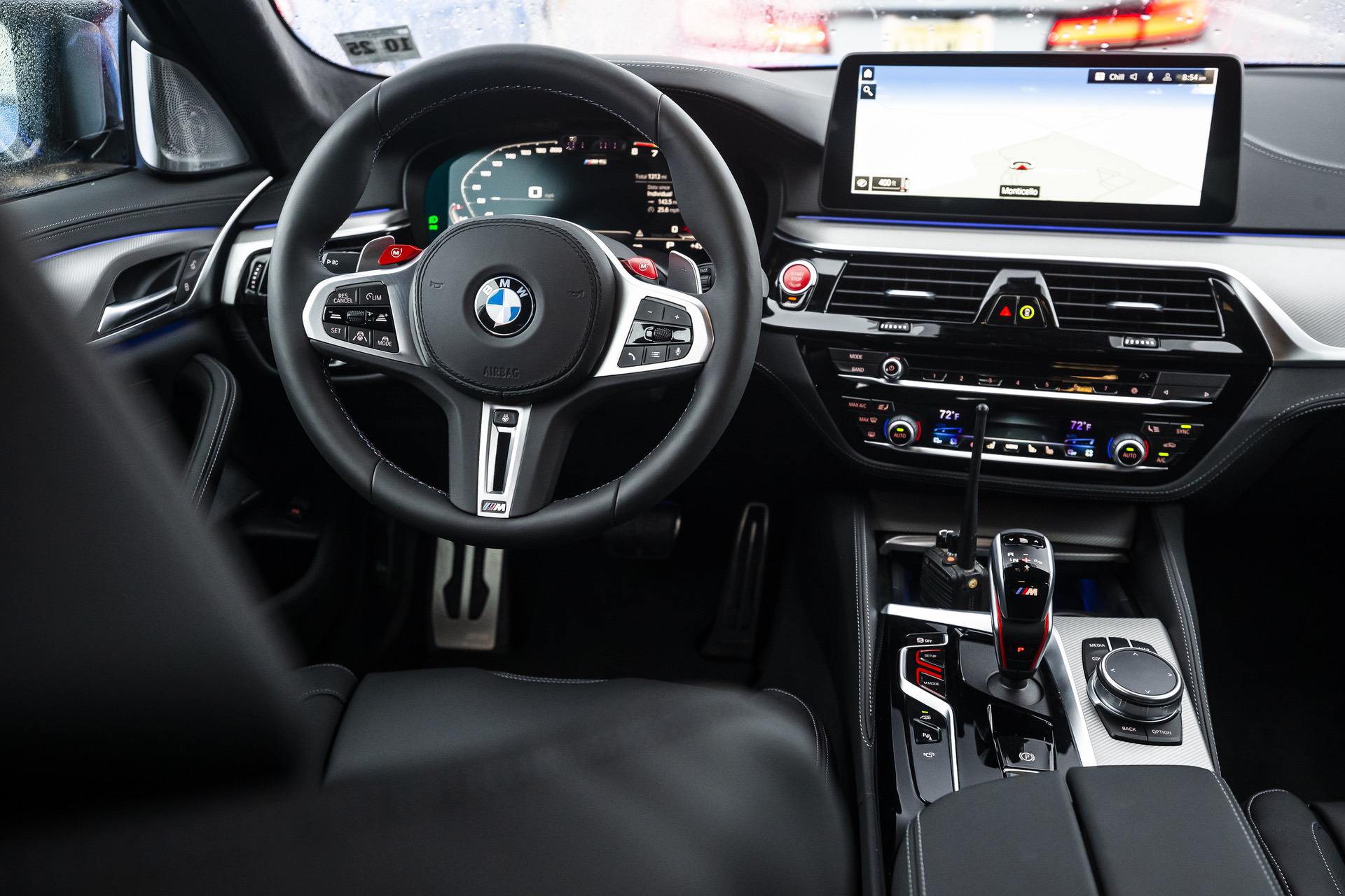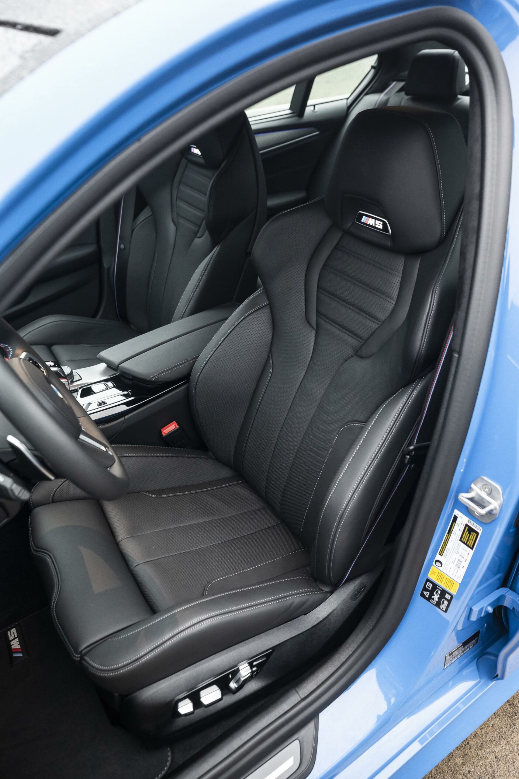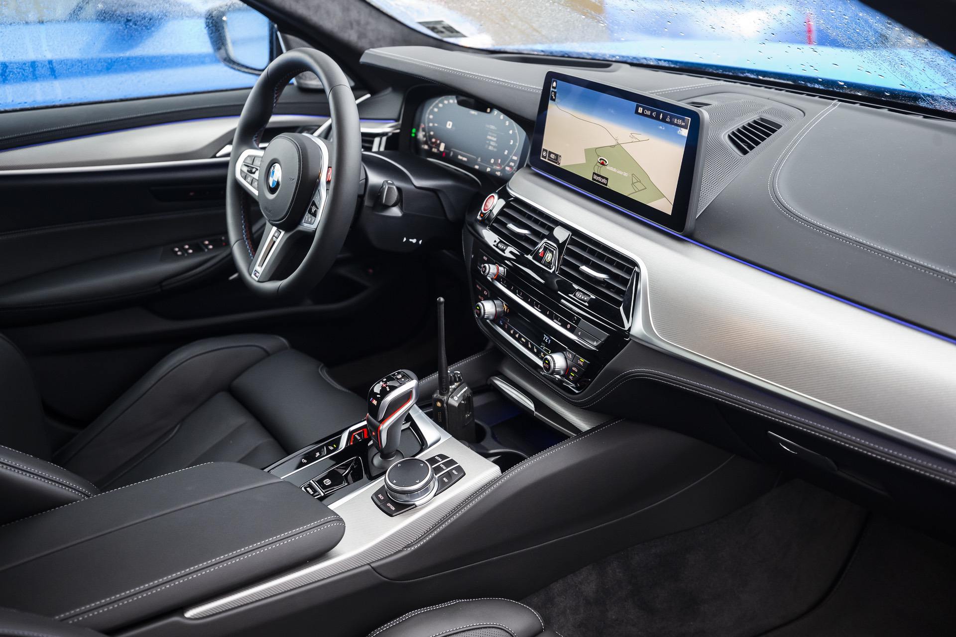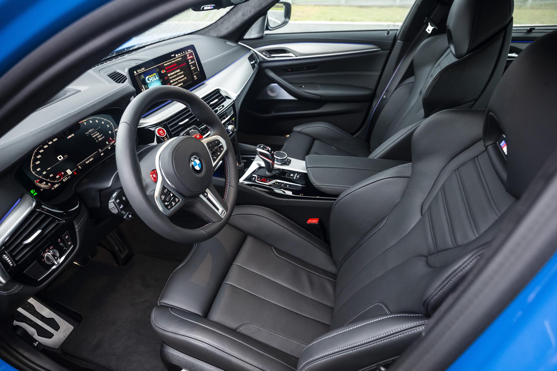 These high-end seats feature an integrated head restraints, an illuminated M5 logo and extended adjustment and functions. All type of seats are offered with standard Merino leather upholstery. Exclusively for the M5 Competition, BMW introduces the Merino full leather upholstery in Black/Midrand Beige finish. This particular Voodoo Blue M5 is paired inside with a black Merino leather.