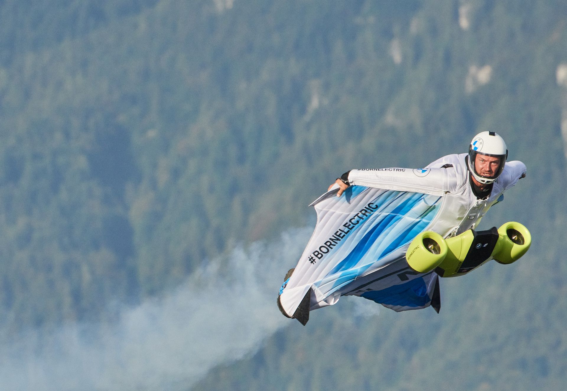 The aim of the electric drive system is to increase the performance of the wingsuit in order to achieve a better constant glide flight, thus allowing longer distances to be covered. Upon activation, Salzmann explains, the pilot experiences immediate acceleration, allowing them to fly at speeds of more than 300 km/h. For the maiden flight with the Electrified Wingsuit by BMW i Salzmann was flown by helicopter together with two other wingsuit pilots over the mountain tops of his Austrian homeland.