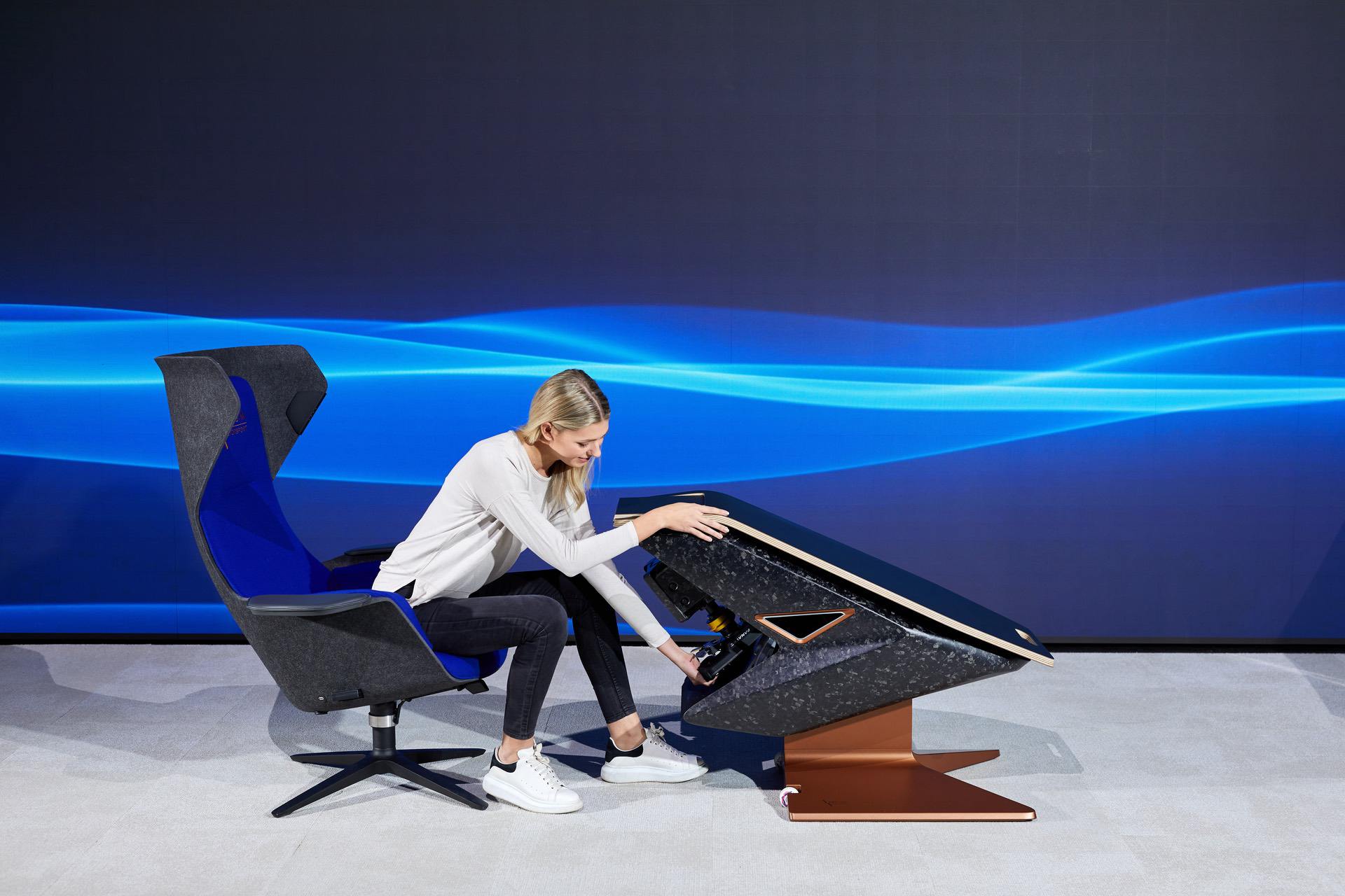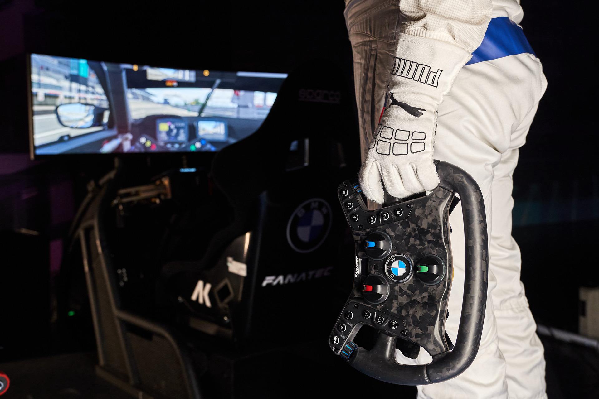 BMW says that absolutely no modifications are required for it to be used in the race car. The carbon steering wheel is a motorsport design, with illuminated buttons and magnetic, dual-action shift paddles also made of carbon. At today’s event in Munich, BMW works driver Philipp Eng entered the stage in the real BMW M4 GT3, emerged holding the steering wheel, inserted it into the simulator, and promptly completed a number of laps in the car’s virtual counterpart.