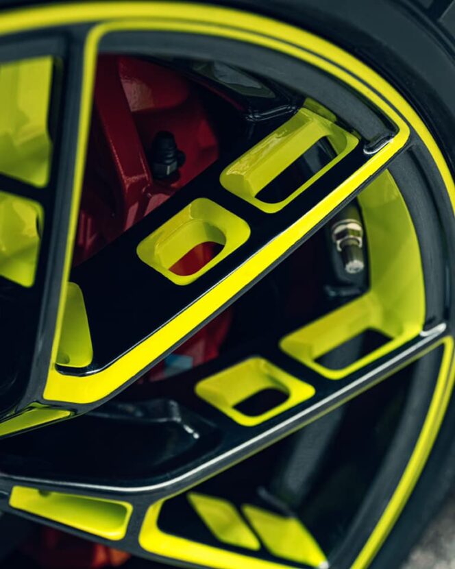 We’re not so sure what sort of paint finish these wheels would work with, though. On a black car, the green might be too harsh a contrast. On a gray car it might look cool but also a bit odd. Isle of Man Green would obviously be too much green. And Sao Paulo Yellow with these green wheels would sear the retinas of onlookers. However, the wheels are cool enough that someone will find a great color combo for them.