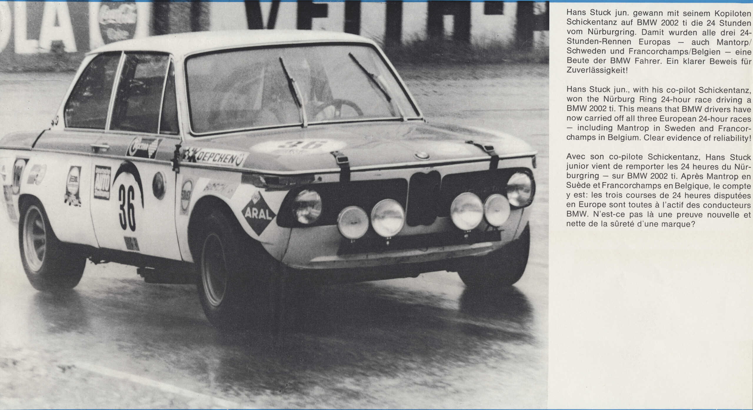 Stuck entered the maiden Nurburgring 24-hour race behind the wheel of a Koepchen BMW Tuning car. It was a BMW 2002 ti that was upgraded by the German tuner to be able to compete with the much more popular Alpina and Schnitzer rivals on the track. Koepchen was actually the official representative of BMW in different competitions, even before the BMW Motorsport division was established.