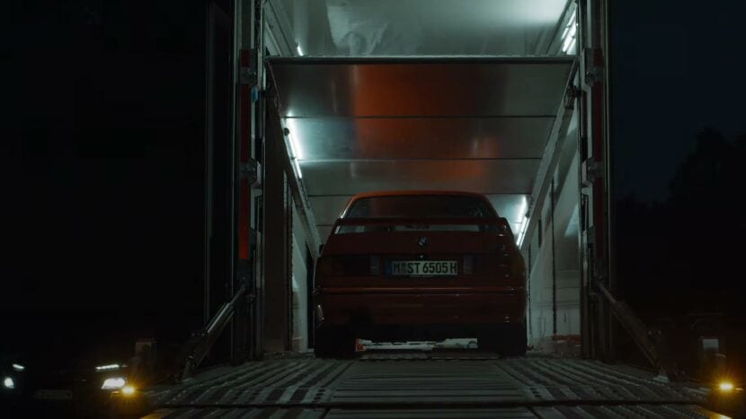 In this opening of this video, you see an E30 BMW M3 being unloaded from a truck at night. The bright lights of the trailer and the vibrant red E30 M3 command your attention, so you might miss the little Easter Egg hidden off to the left. Wait a few seconds and pay attention to the left side of the trailer, as you’ll only get a blink-and-you’ll-miss-it glimpse of the upcoming BMW X8 M’s headlights.