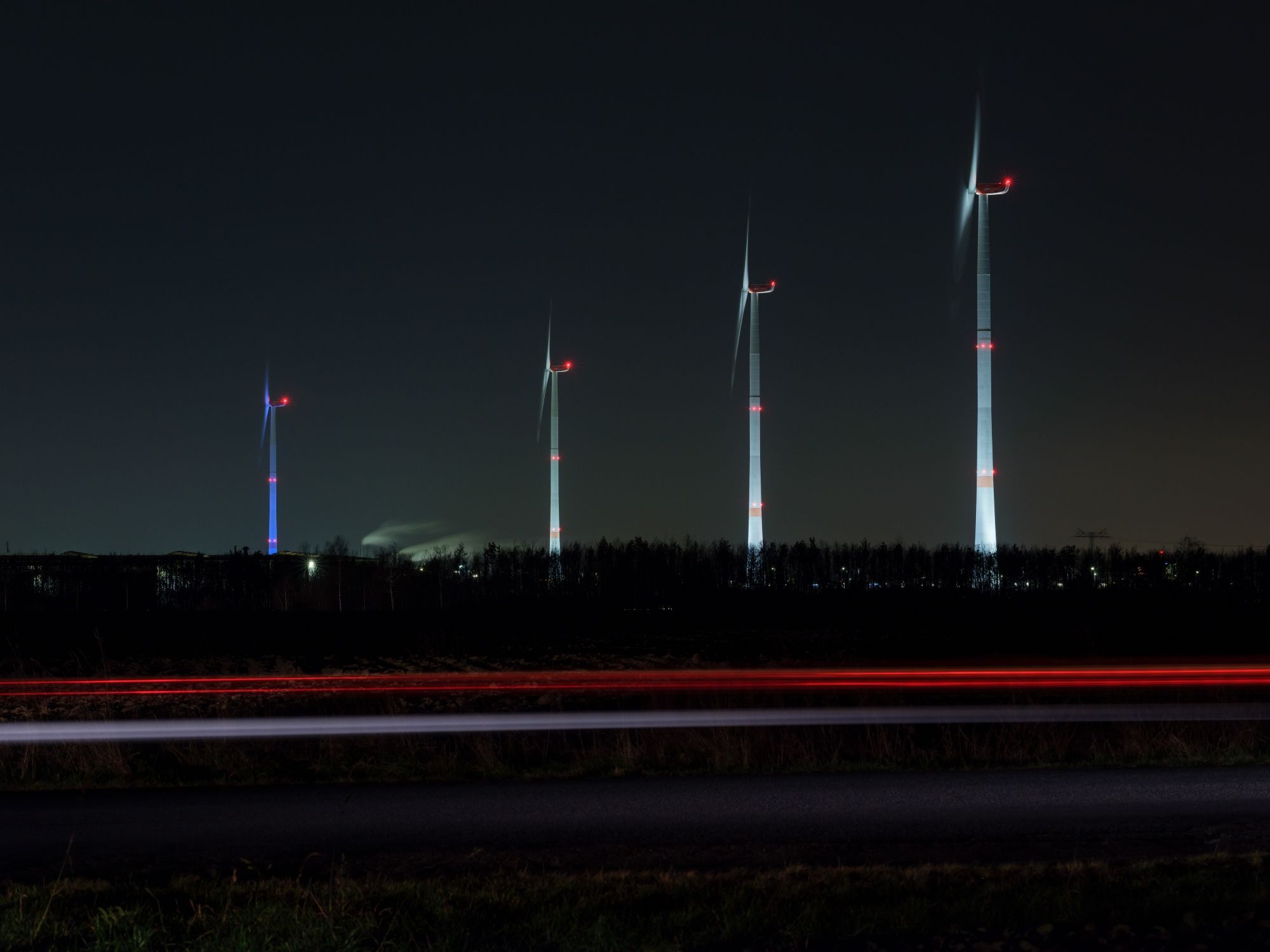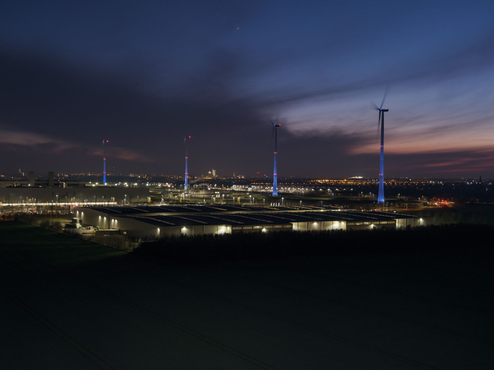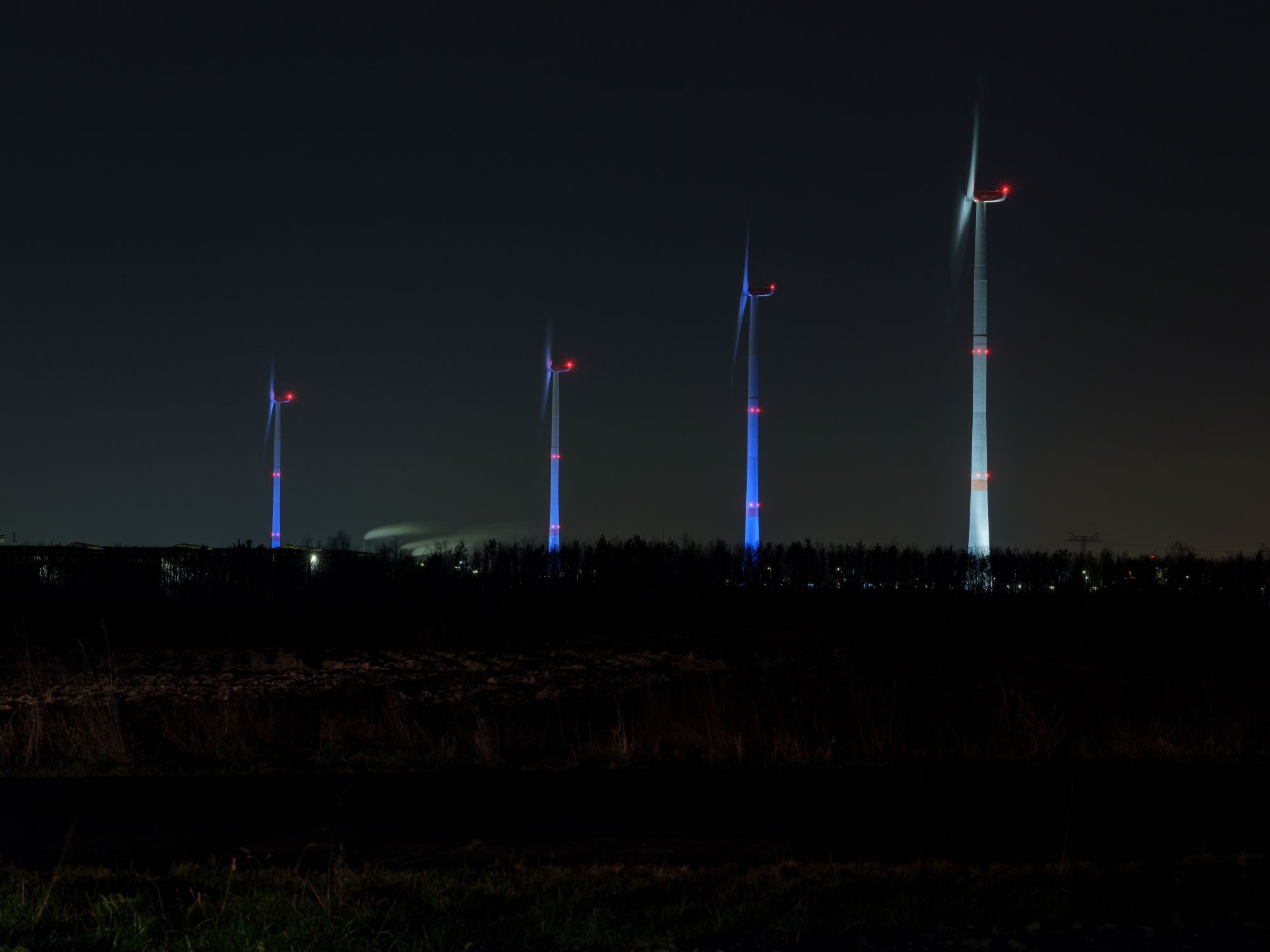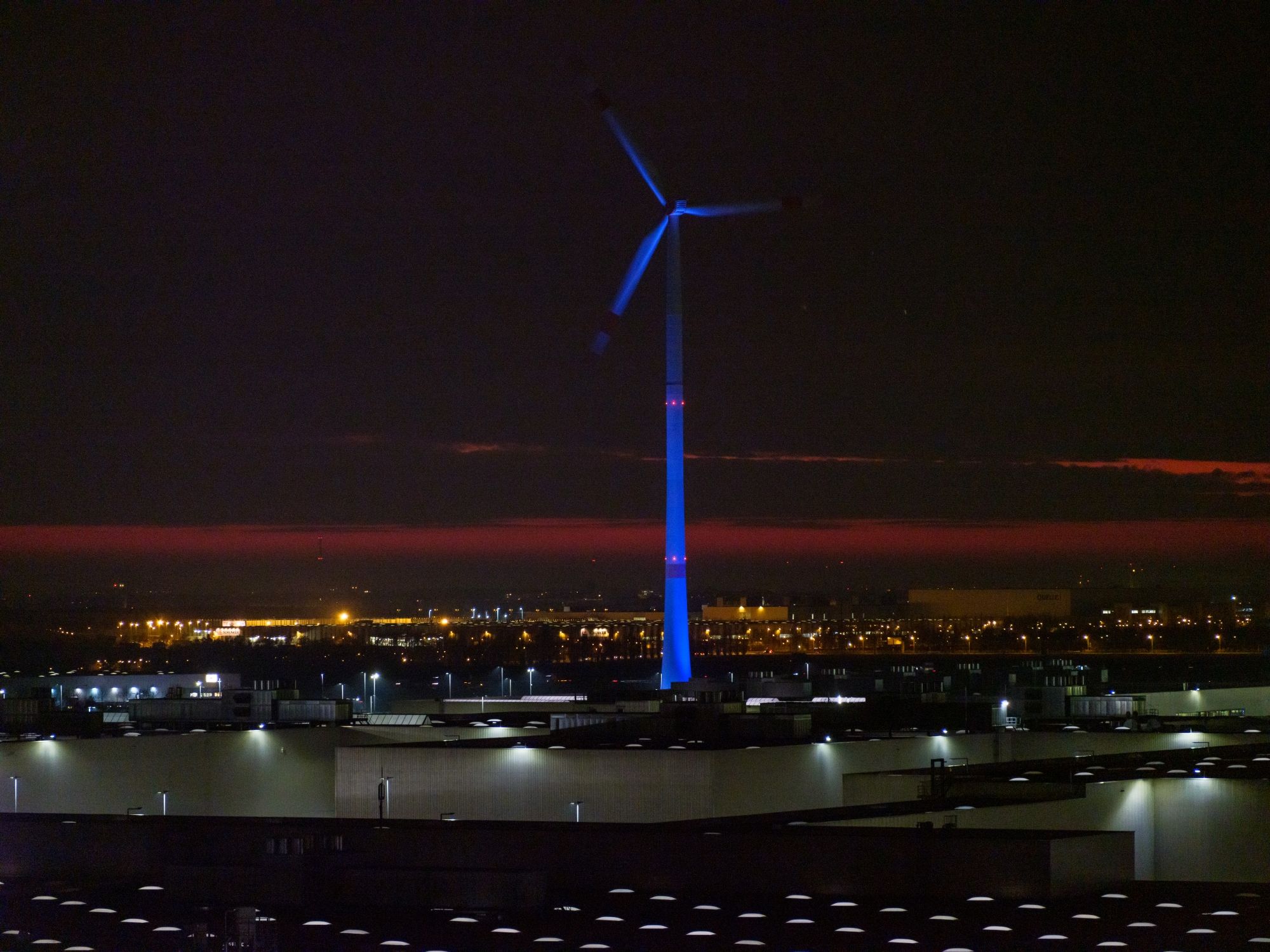 Each Advent Sunday, one more of the turbines is lit up in bright white rather than the usual blue, until the Fourth Sunday of Advent, when all of them will be aglow. Each ‘candle’ is evenly illuminated by the eight powerful LED lights that surround it and are powered by electricity from the turbines themselves. This is basically their second job now, as they did so well on providing power for the Leipzig plant.
