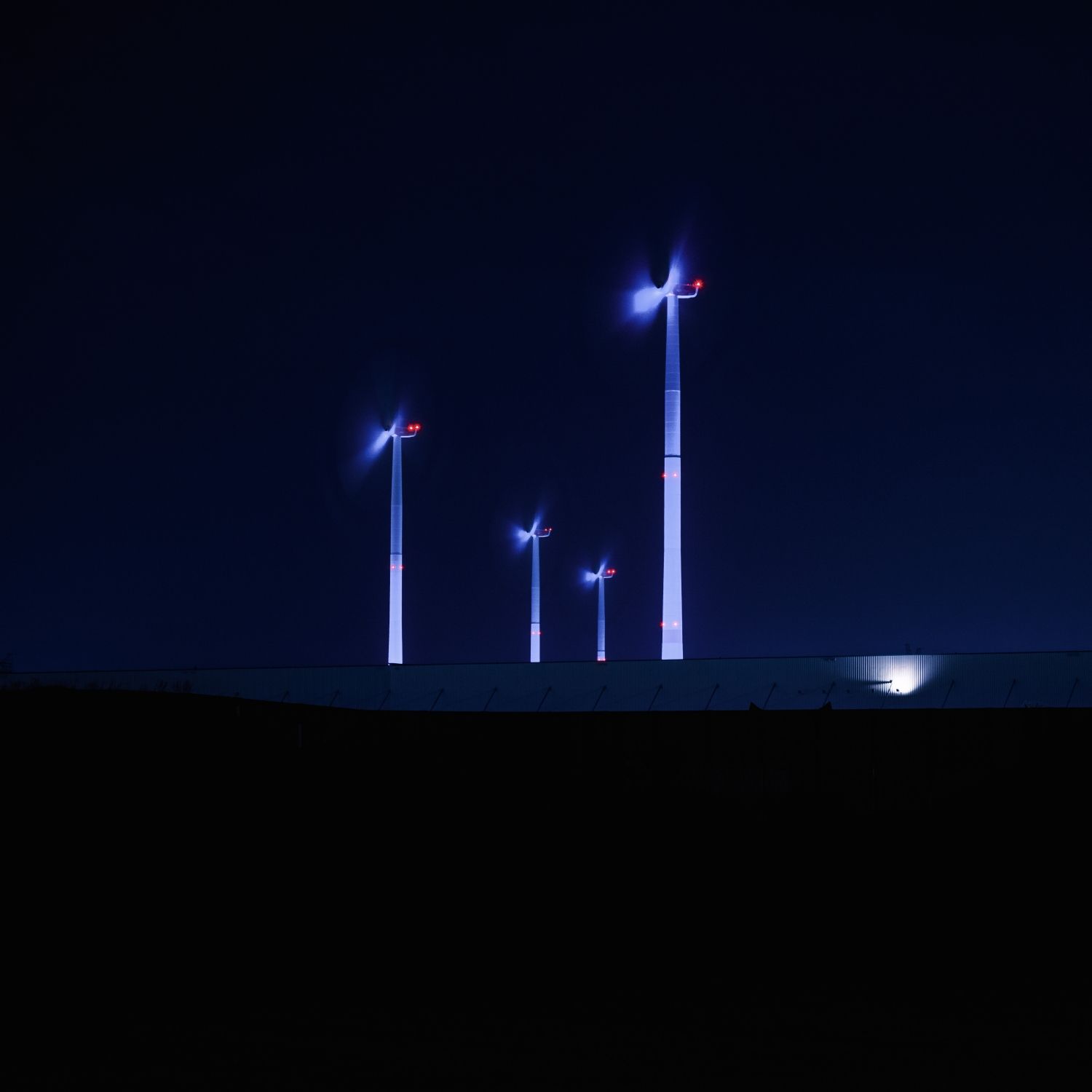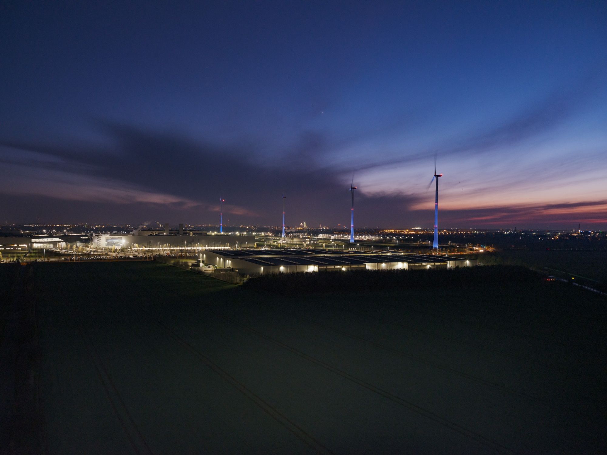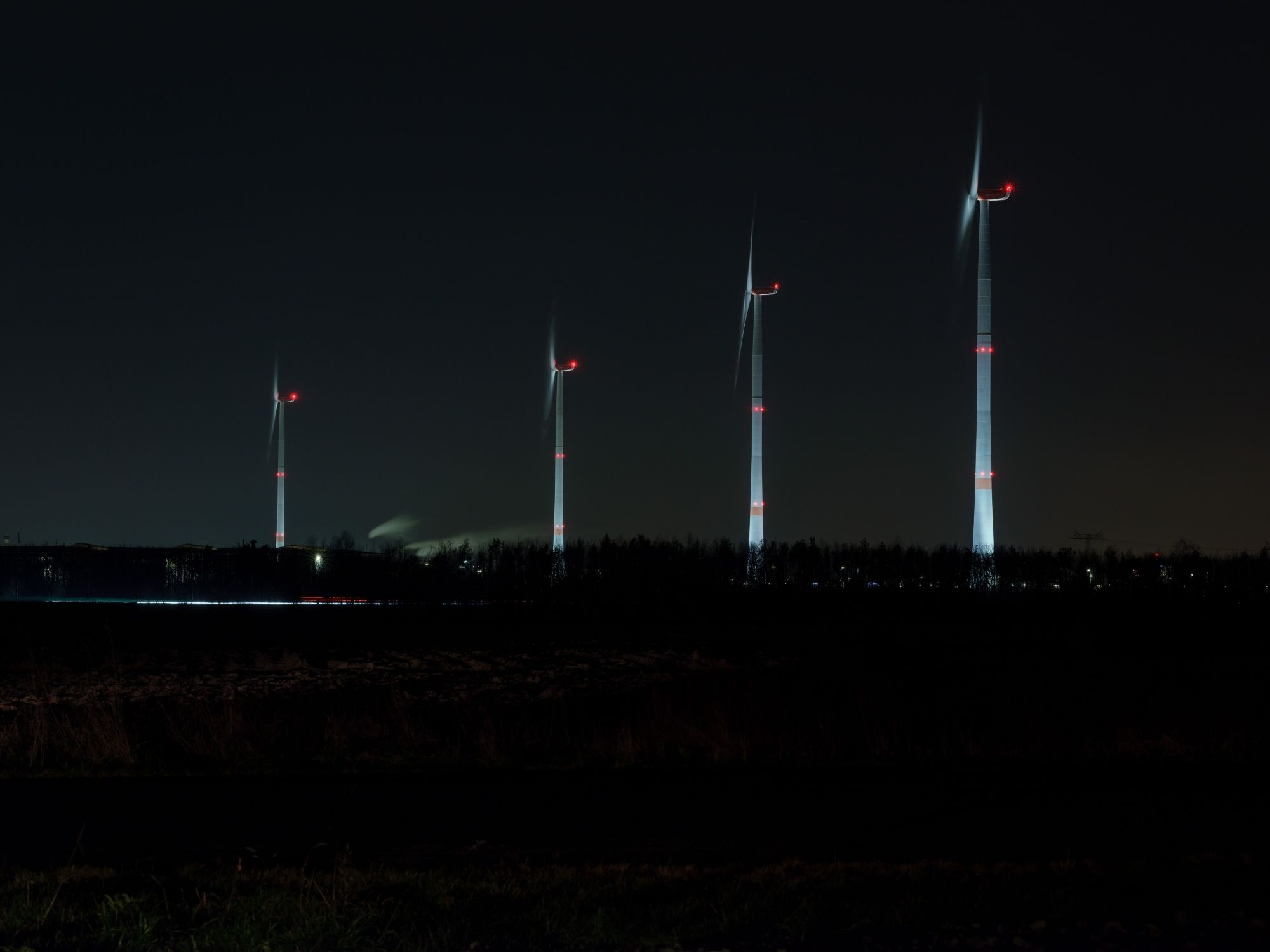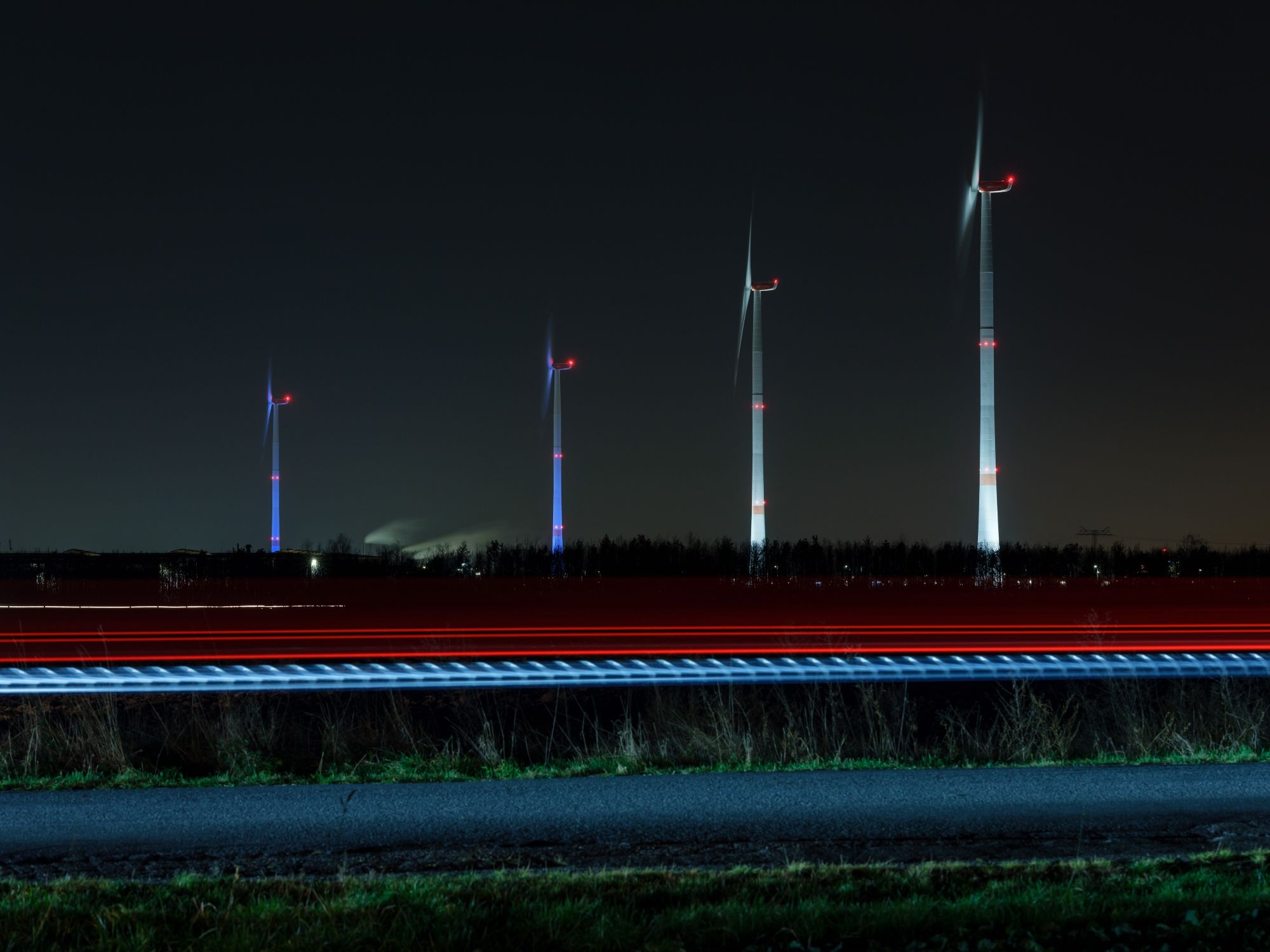 Each Advent Sunday, one more of the turbines is lit up in bright white rather than the usual blue, until the Fourth Sunday of Advent, when all of them will be aglow. Each ‘candle’ is evenly illuminated by the eight powerful LED lights that surround it and are powered by electricity from the turbines themselves. This is basically their second job now, as they did so well on providing power for the Leipzig plant.