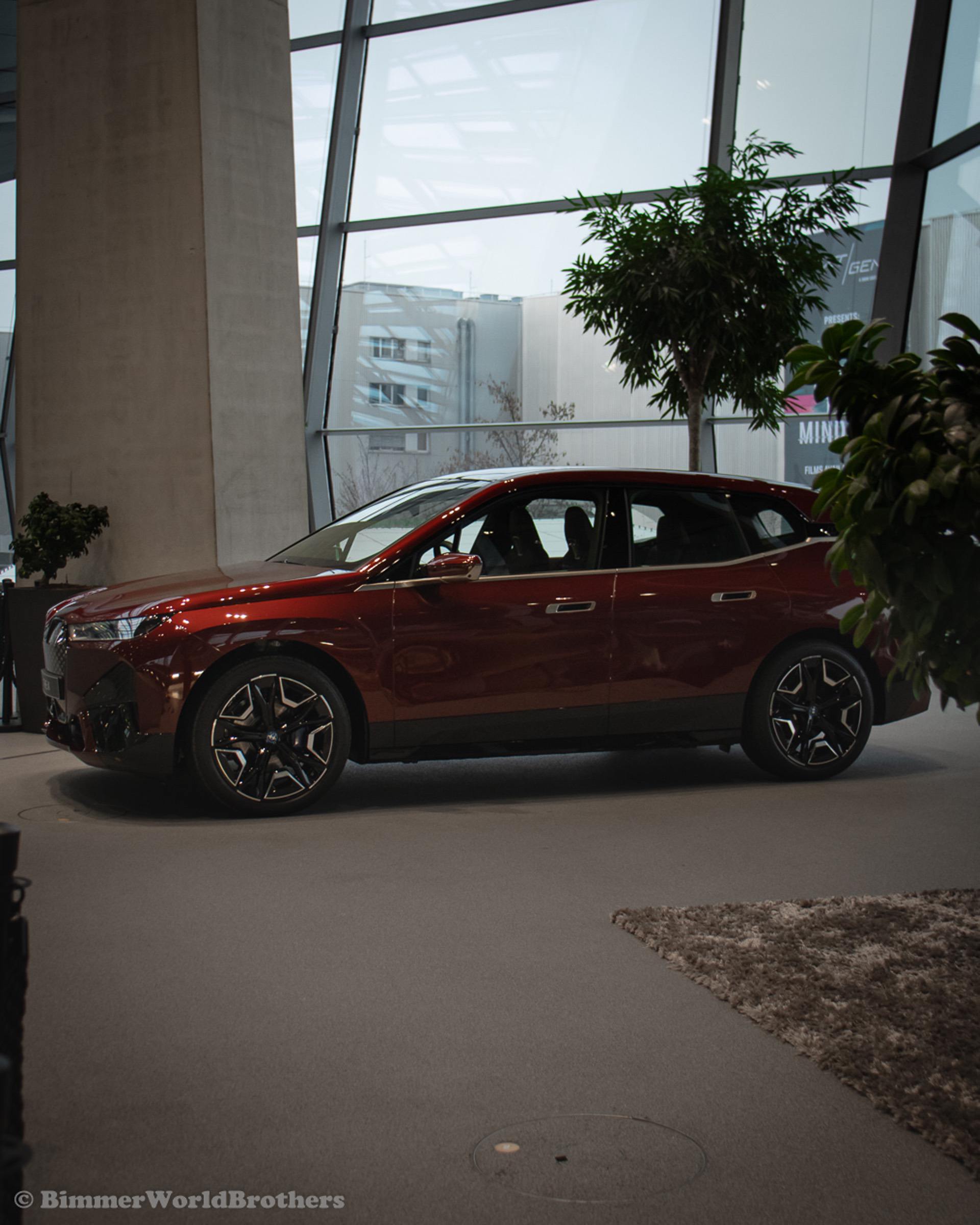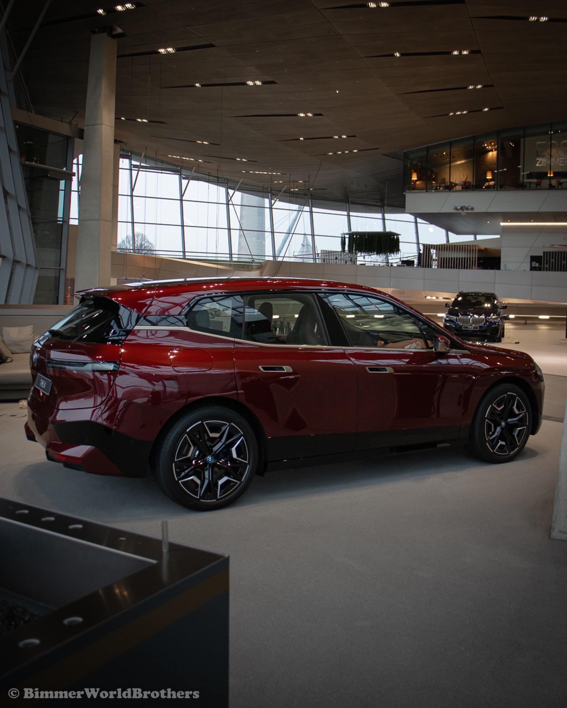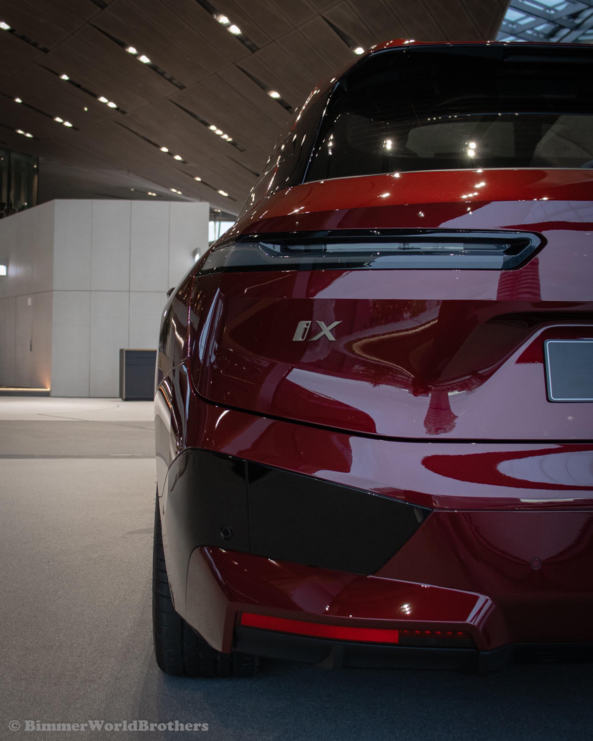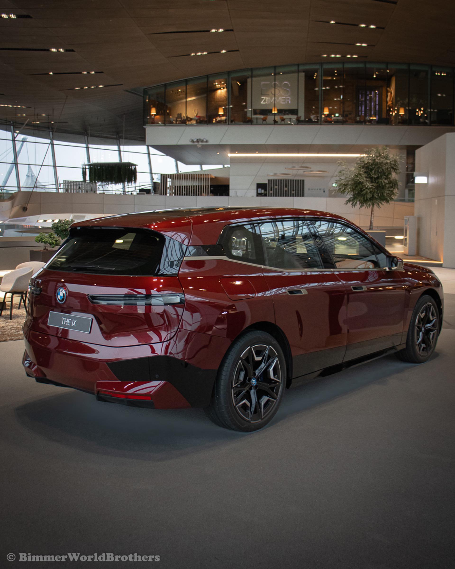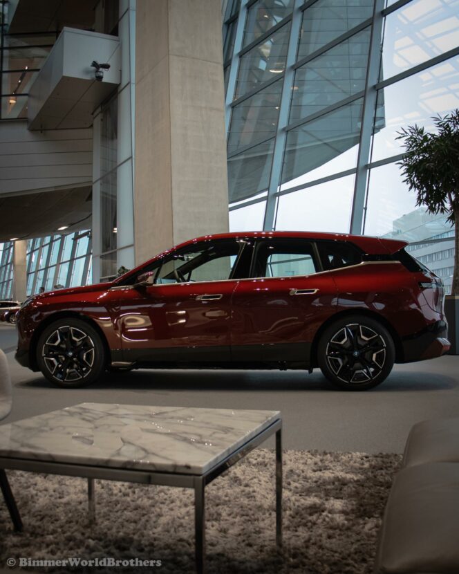 The @bimmerworldbrothers are bringing us new real life photos of the 2022 BMW iX electric crossover. The latest electric vehicle from Munich is now displayed at the famous BMW Welt. The model displayed is the Sport Package with the exquisite Aventurine Red II color. Compared to the standard offering, the Sport Package includes special triangular shields for the Air Curtains and high-gloss black coating for the bordering at the lower edge of the body, as well as for the door handles and the side skirts. As part of this package, the iX also receives smoked-glass tail lights, 21-inch Aerodynamic Wheels in Midnight Grey finish and blue-painted brake calipers.