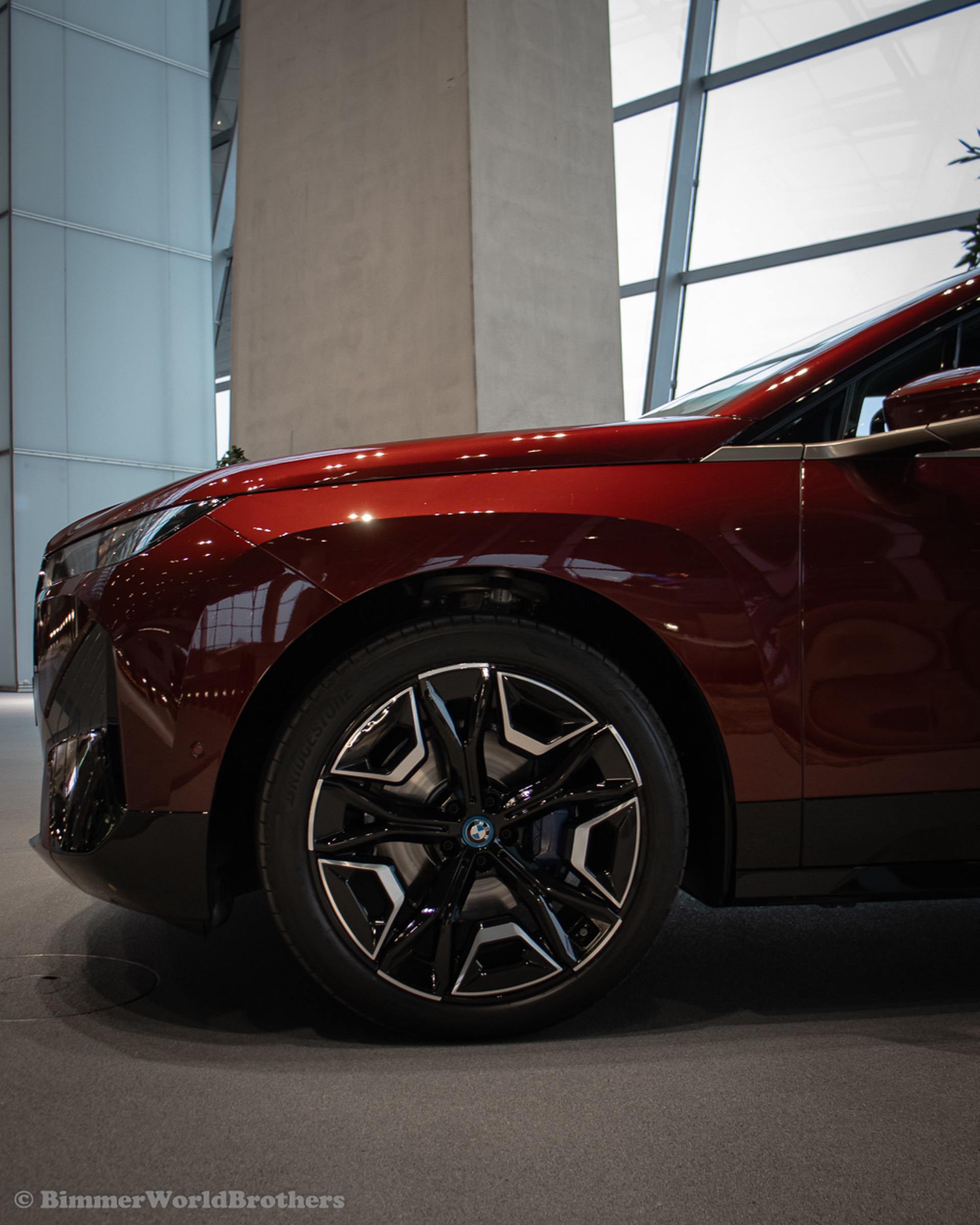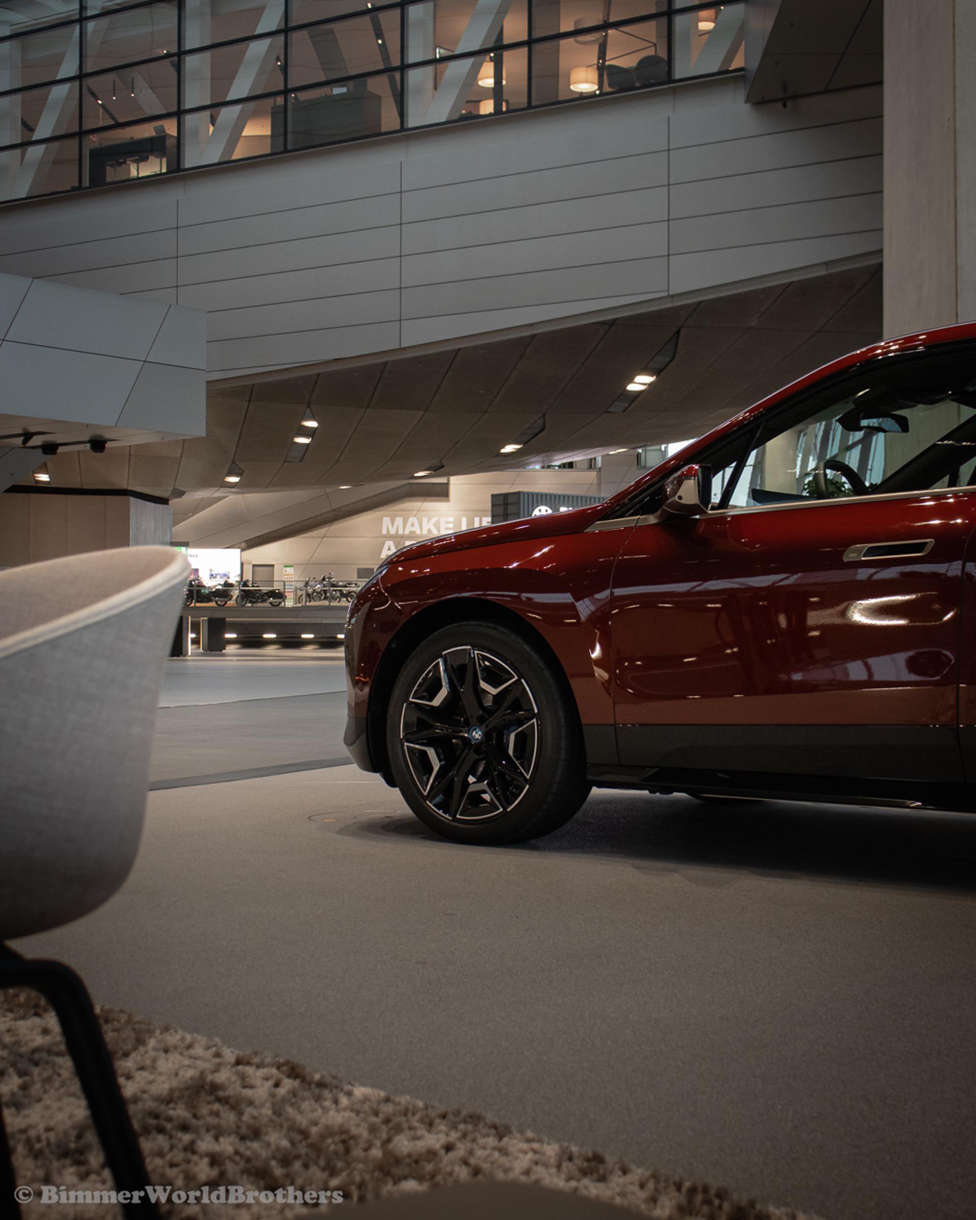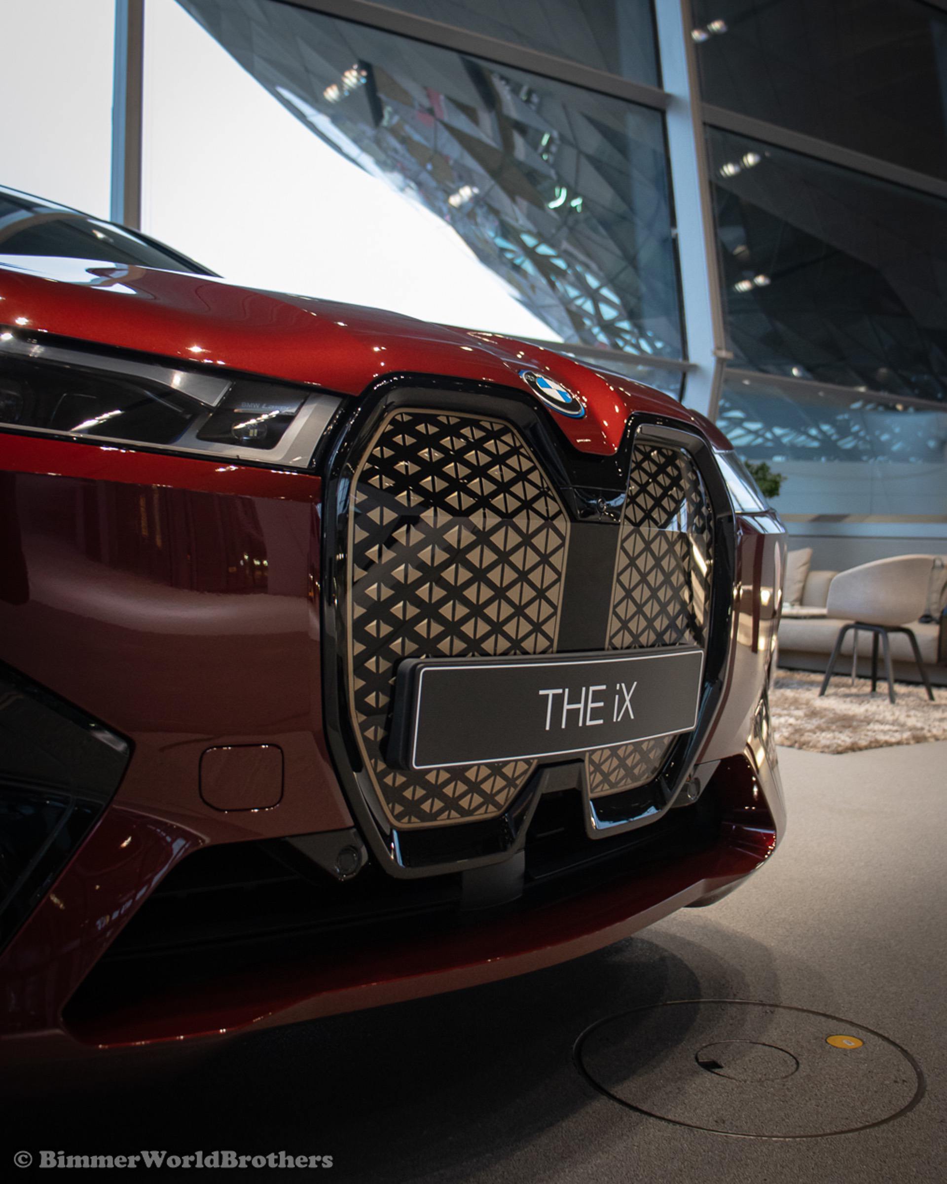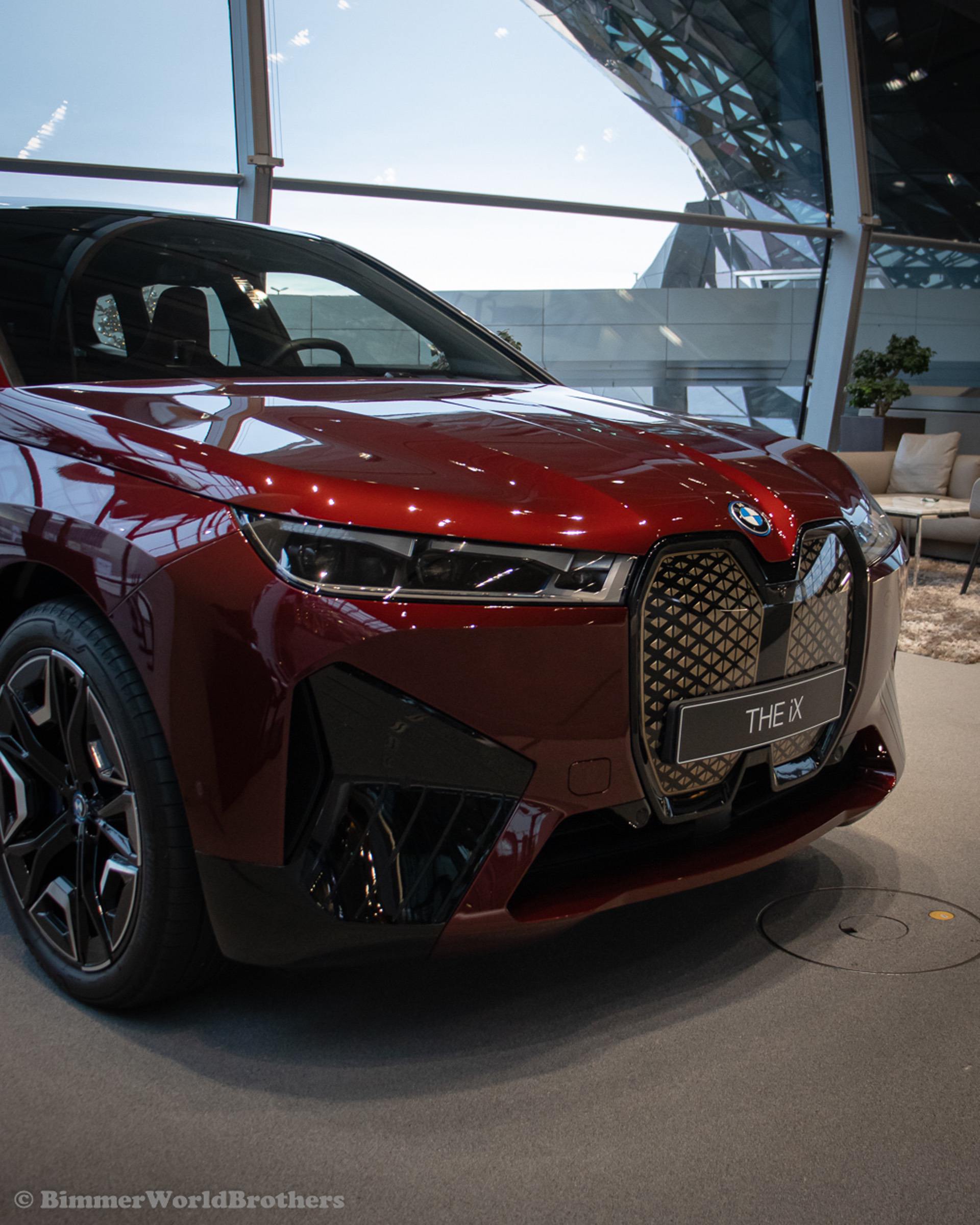 The @bimmerworldbrothers are bringing us new real life photos of the 2022 BMW iX electric crossover. The latest electric vehicle from Munich is now displayed at the famous BMW Welt. The model displayed is the Sport Package with the exquisite Aventurine Red II color. Compared to the standard offering, the Sport Package includes special triangular shields for the Air Curtains and high-gloss black coating for the bordering at the lower edge of the body, as well as for the door handles and the side skirts. As part of this package, the iX also receives smoked-glass tail lights, 21-inch Aerodynamic Wheels in Midnight Grey finish and blue-painted brake calipers.