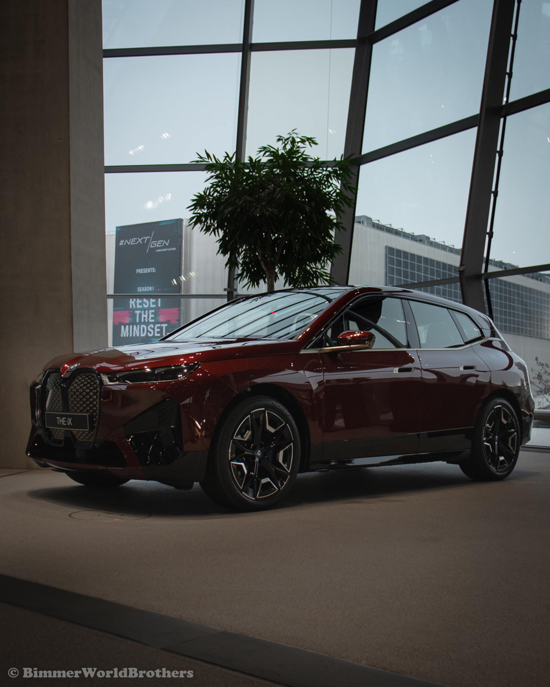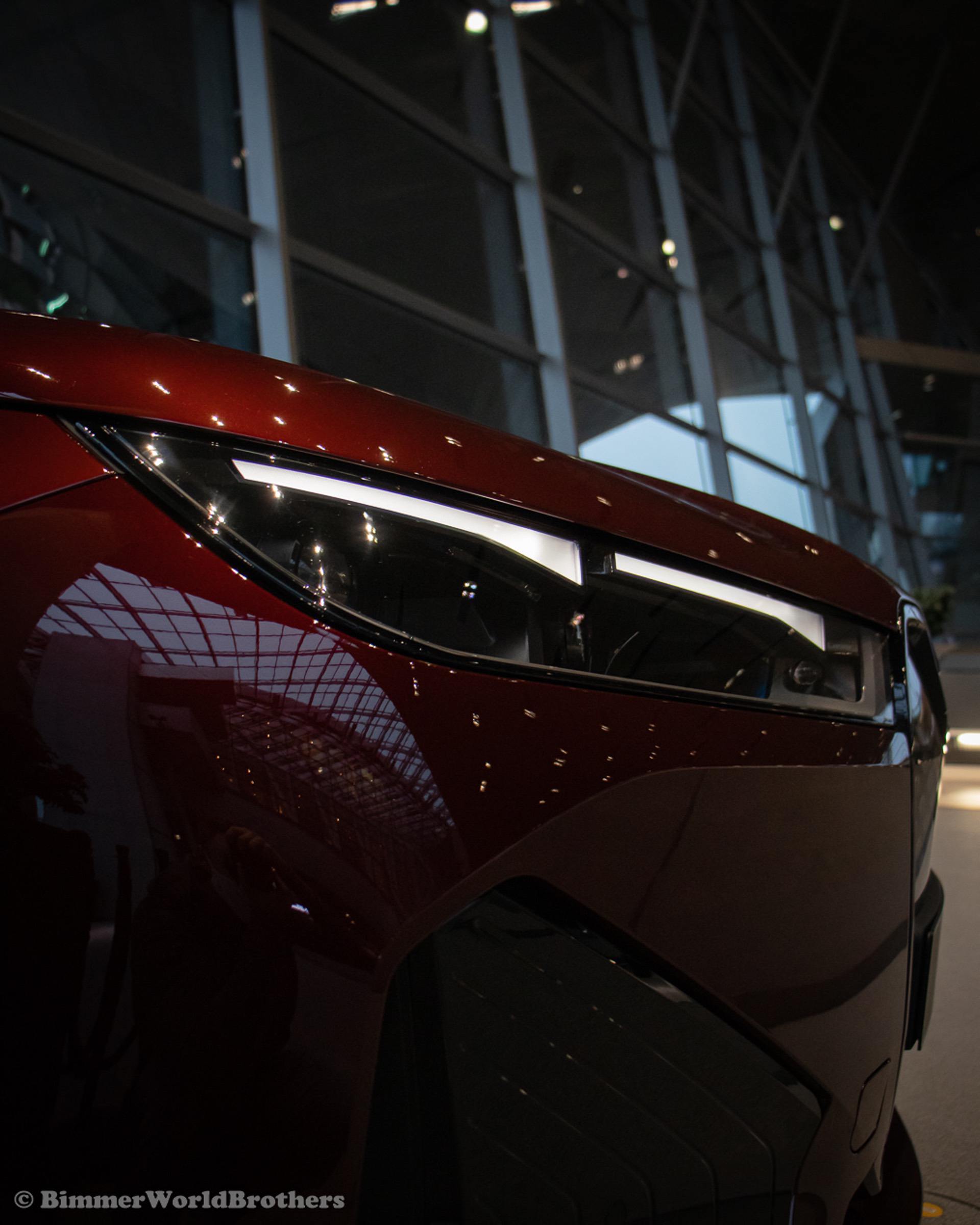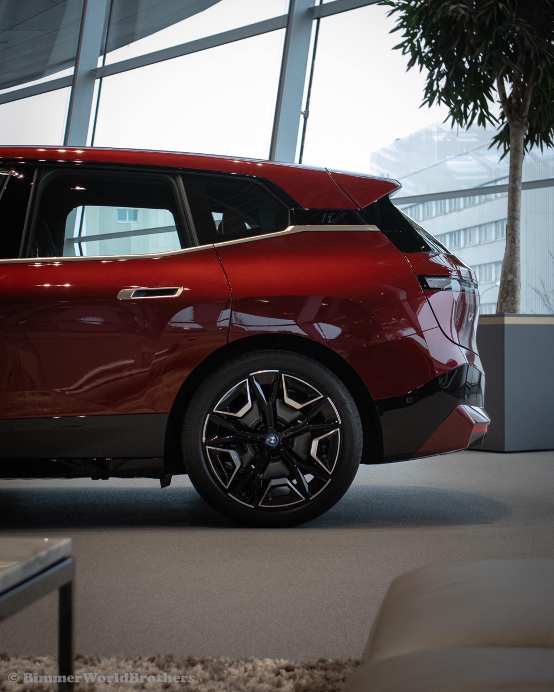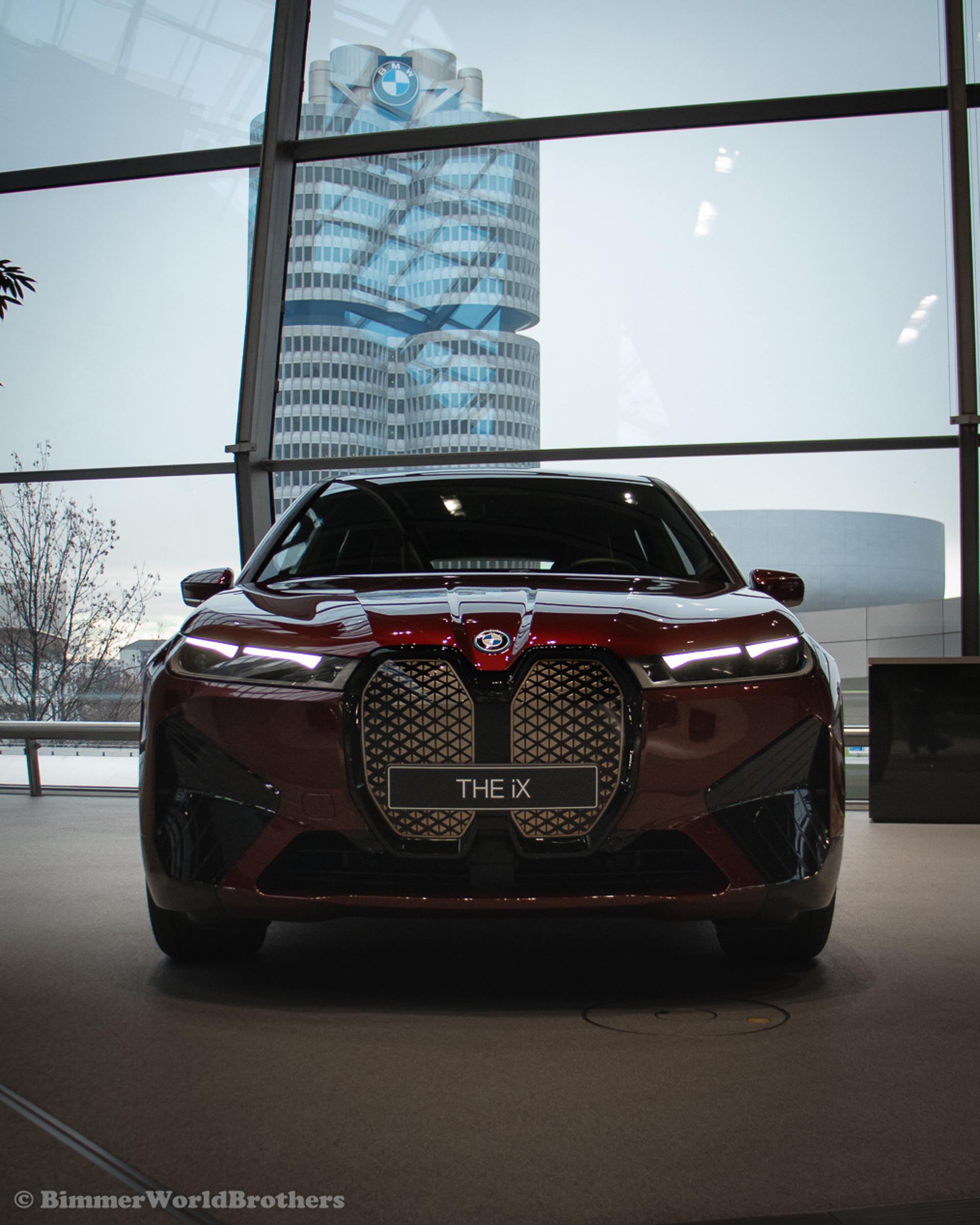 The @bimmerworldbrothers are bringing us new real life photos of the 2022 BMW iX electric crossover. The latest electric vehicle from Munich is now displayed at the famous BMW Welt. The model displayed is the Sport Package with the exquisite Aventurine Red II color. Compared to the standard offering, the Sport Package includes special triangular shields for the Air Curtains and high-gloss black coating for the bordering at the lower edge of the body, as well as for the door handles and the side skirts. As part of this package, the iX also receives smoked-glass tail lights, 21-inch Aerodynamic Wheels in Midnight Grey finish and blue-painted brake calipers.