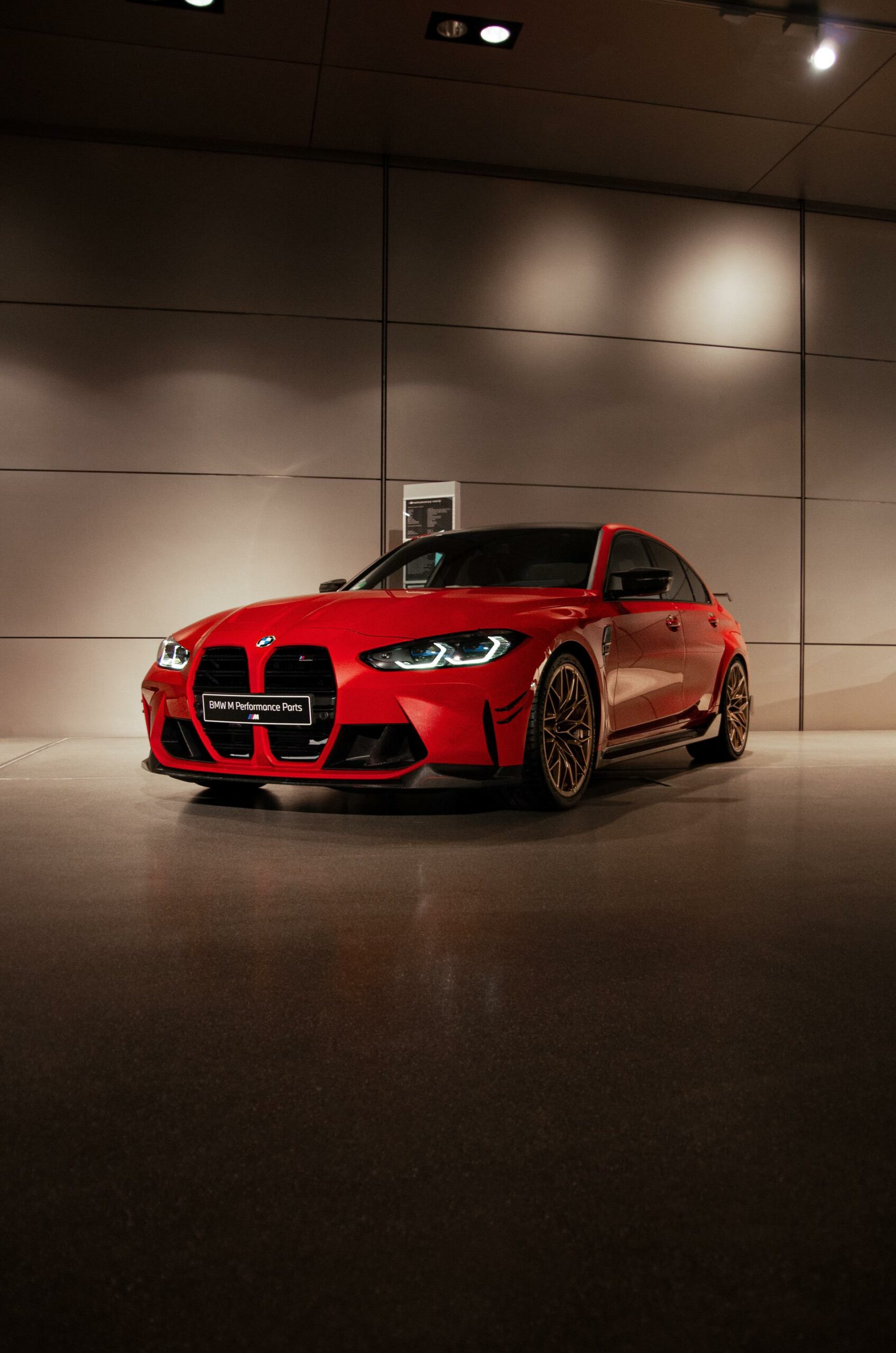 Live from the BMW Welt we bring you a new set of images (courtesy of @bmw_tpoc) featuring the 2021 BMW M3 with the new M Performance Parts. The Toronto Red M3 Competition sits on the floor of the famous Bavarian building and showcases the latest tuning parts from the M Division. Without a doubt, these are the most aggressive aftermarket parts ever designed by BMW. In a conversation with Domagoj Dukec, BMW’s Head of Design, we learned that the M Performance Parts were designed to push the envelope even more.