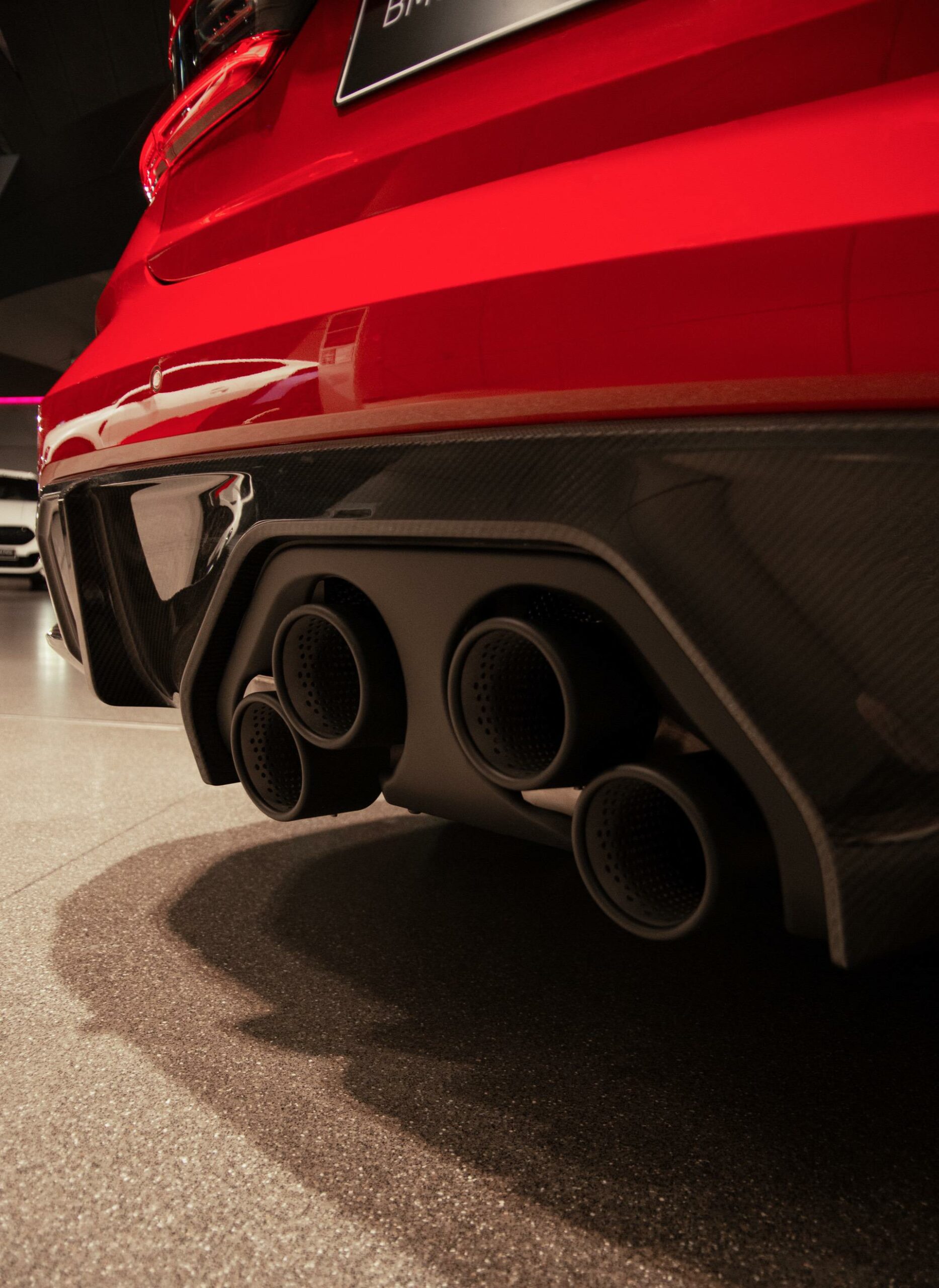 From the massive rear wing to the aggressive front fascia and especially to the trapezium-shaped pipes of the aftermarket exhaust system, these new parts certainly stand out. On top of this, BMW gave the launch car a two-tone red and black paint job which just adds even more flavor. The exclusive photos give you a closer look at the car, and especially, at some of its unique aero and performance parts. The most interesting piece is the new exhaust system.