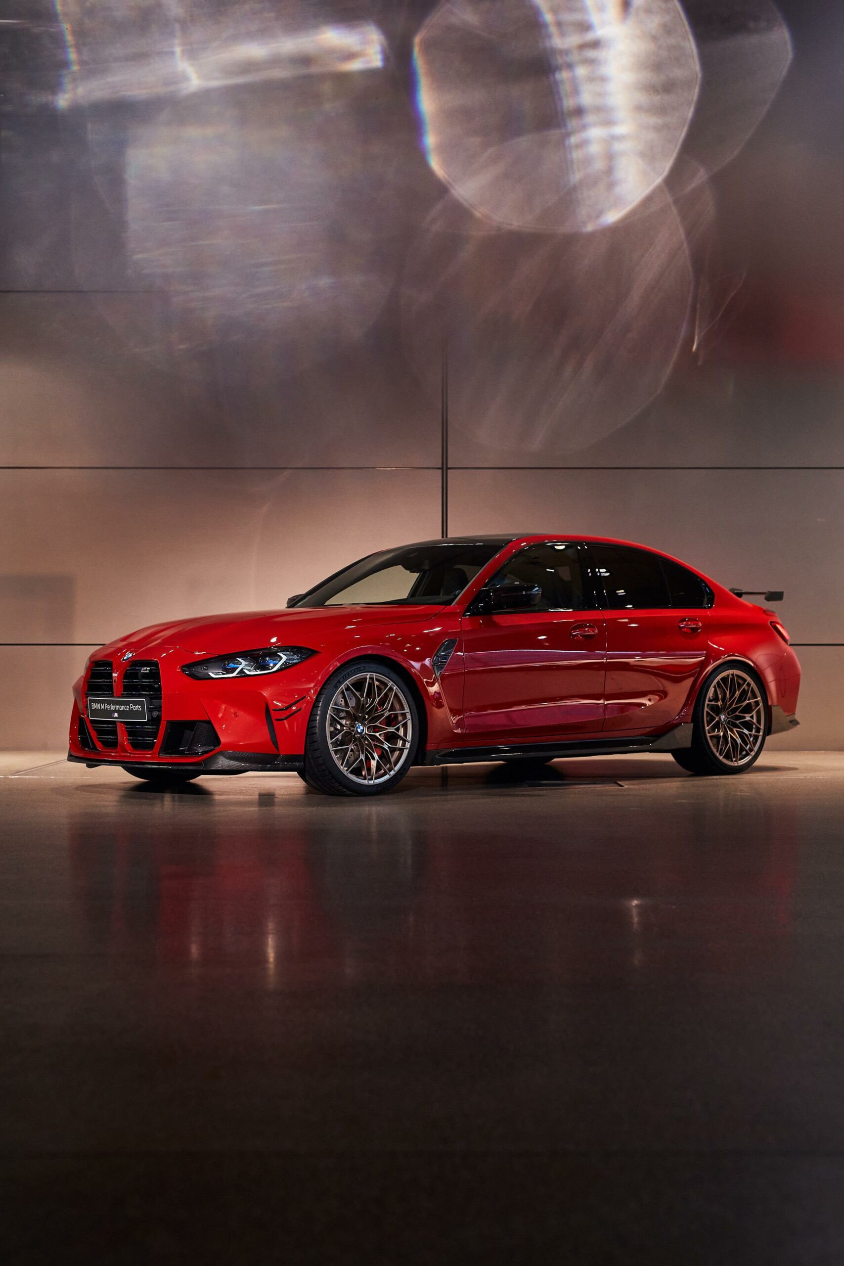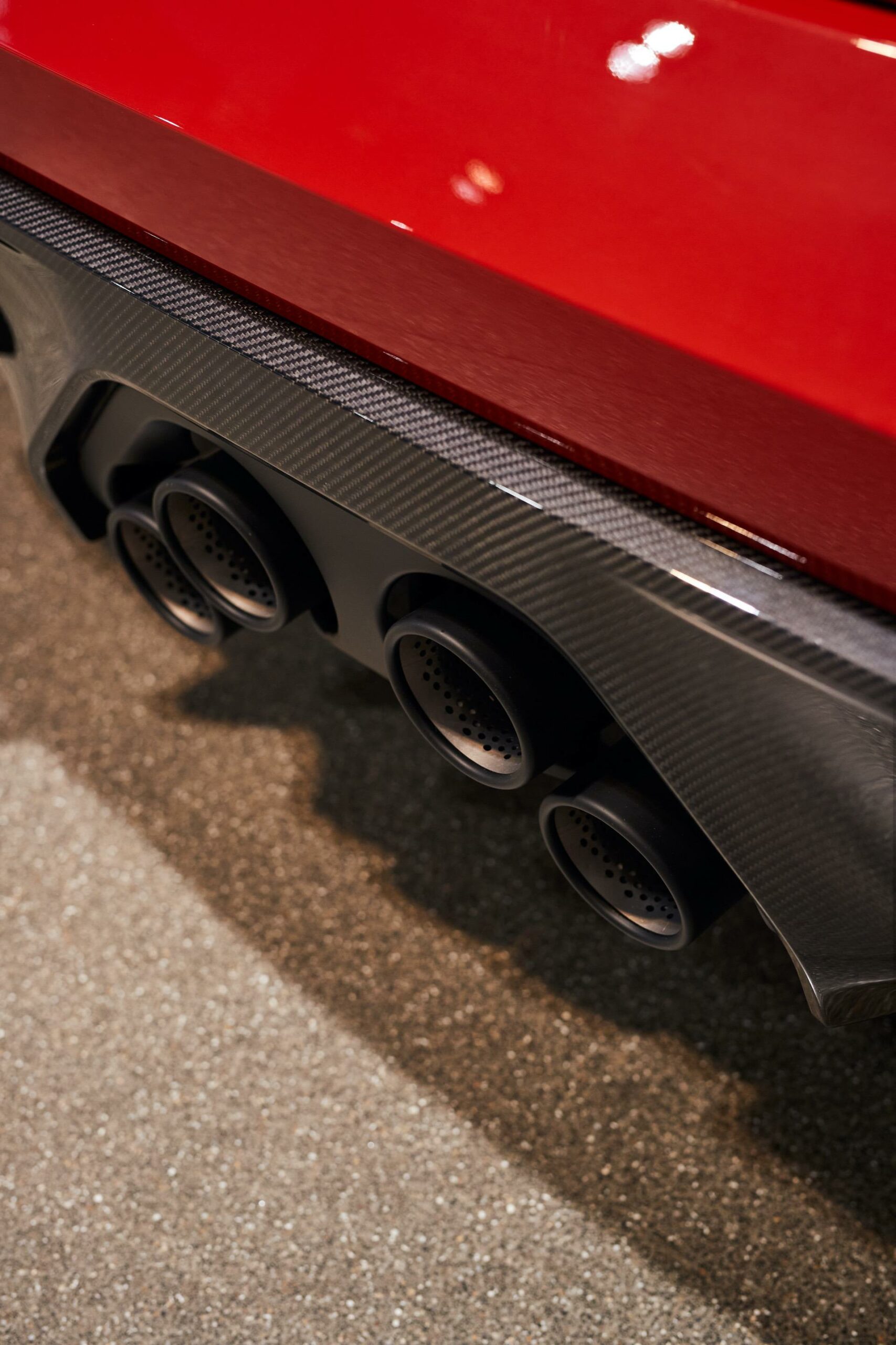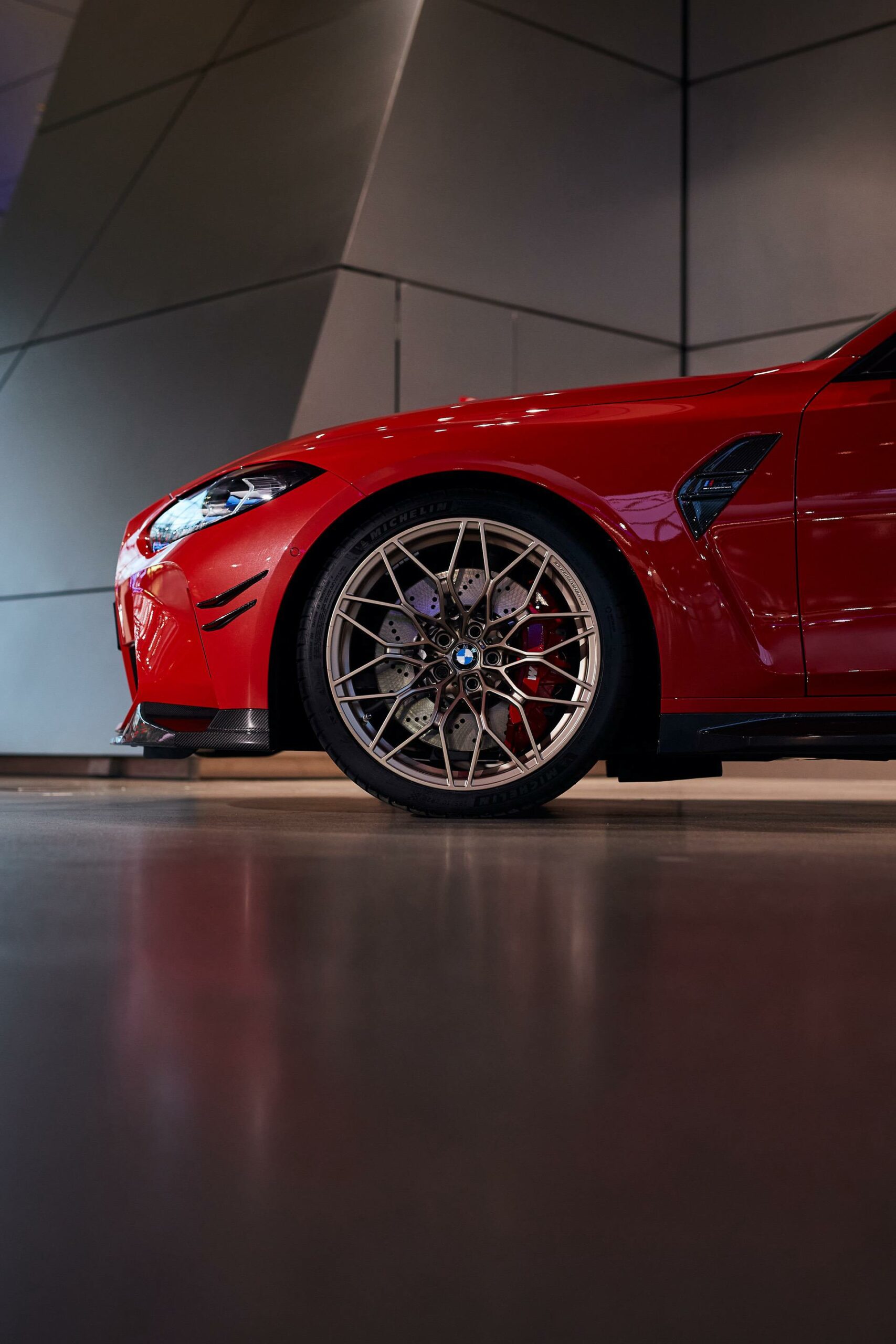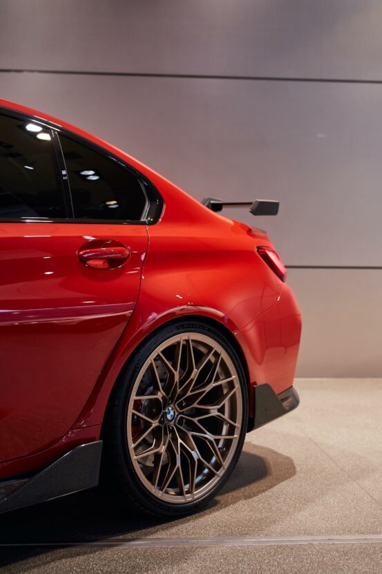 Painted in Toronto Red, this G80 M3 is a display for the upcoming BMW M Performance Parts. Every new M car gets this special treatment, but it’s the M3 and M4 who often get the largest array of aftermarket parts. And with an aggressive and controversial styling, the G80 M3 is certainly the right showcar for the M Performance Parts division. As you can see in these exclusive photos, the G80 M3 immediately stands out with a massive rear wing and trapezium-shaped pipes of the aftermarket exhaust system.