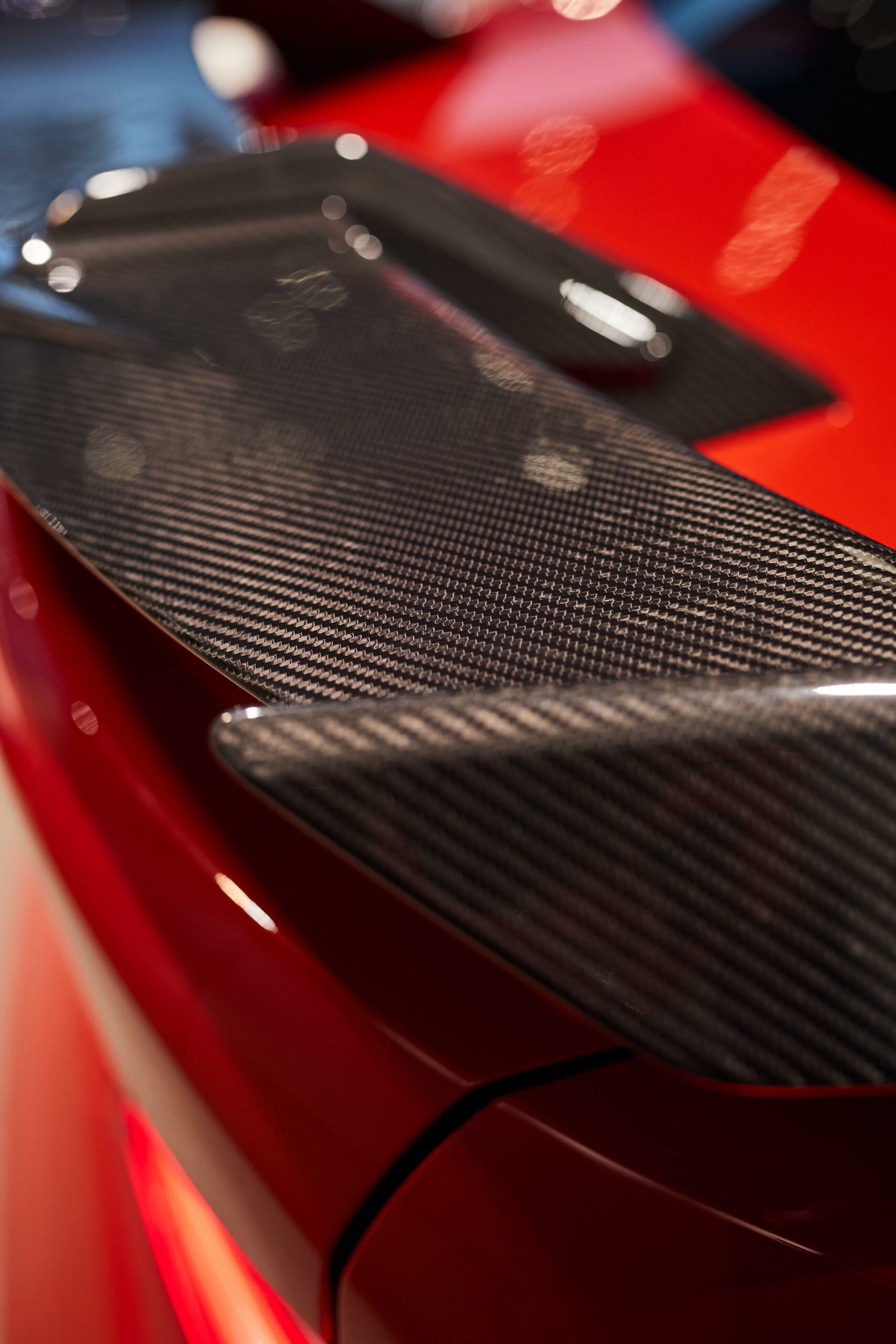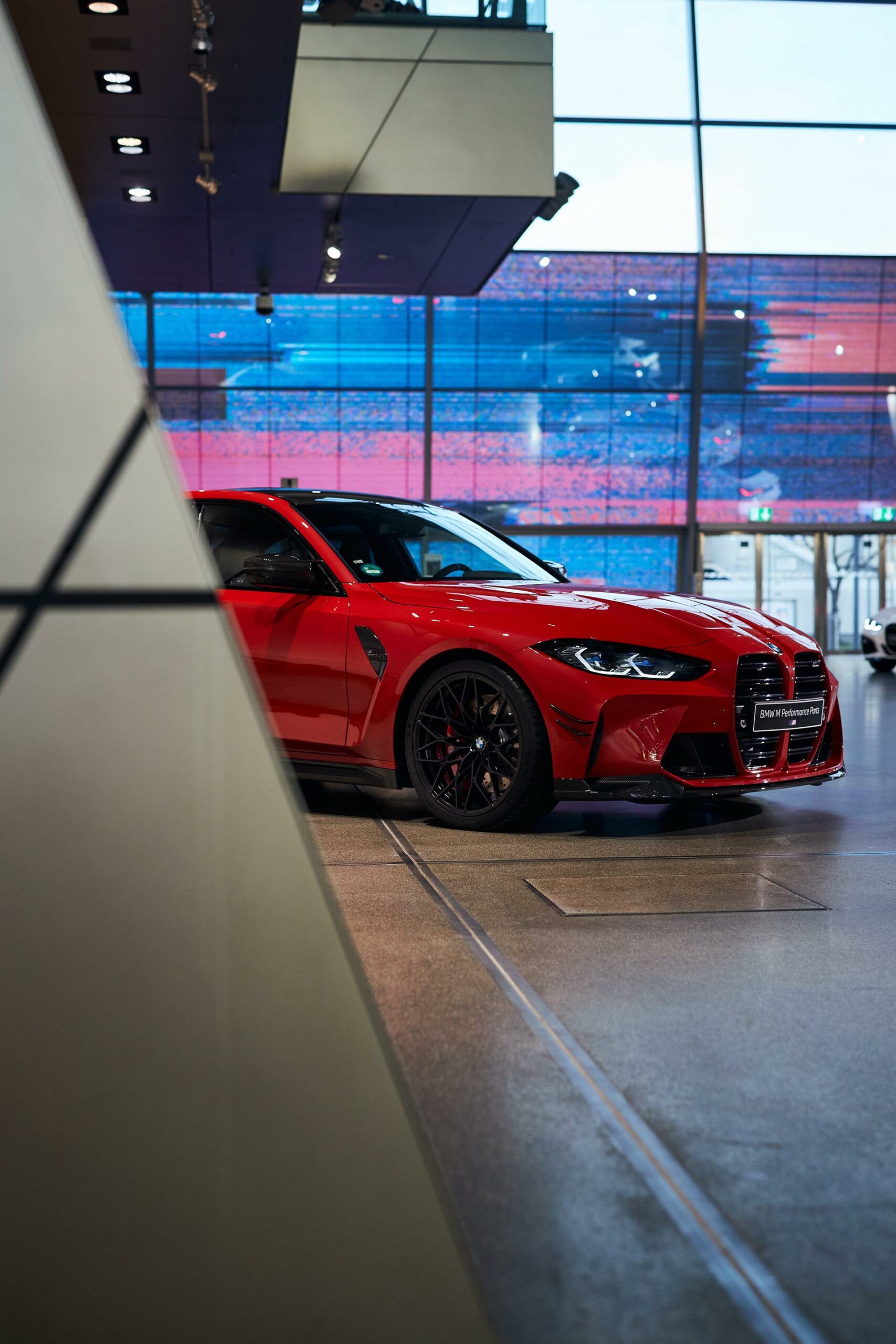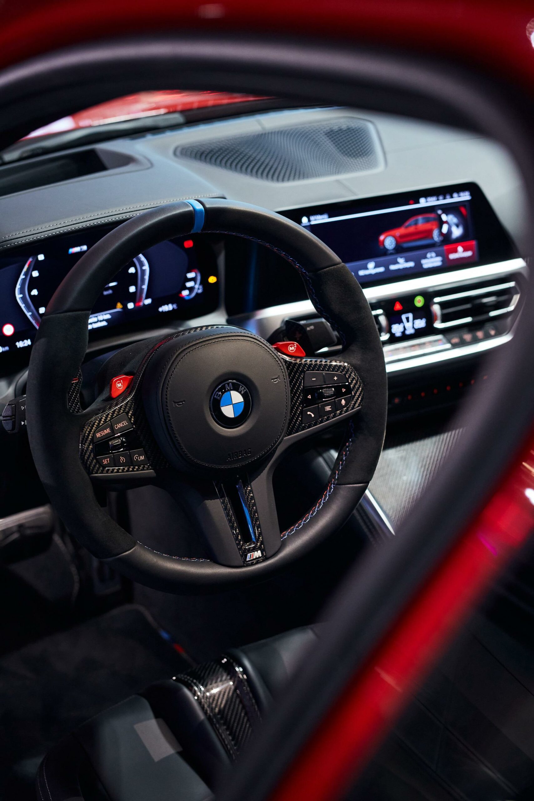 Painted in Toronto Red, this G80 M3 is a display for the upcoming BMW M Performance Parts. Every new M car gets this special treatment, but it’s the M3 and M4 who often get the largest array of aftermarket parts. And with an aggressive and controversial styling, the G80 M3 is certainly the right showcar for the M Performance Parts division. As you can see in these exclusive photos, the G80 M3 immediately stands out with a massive rear wing and trapezium-shaped pipes of the aftermarket exhaust system.