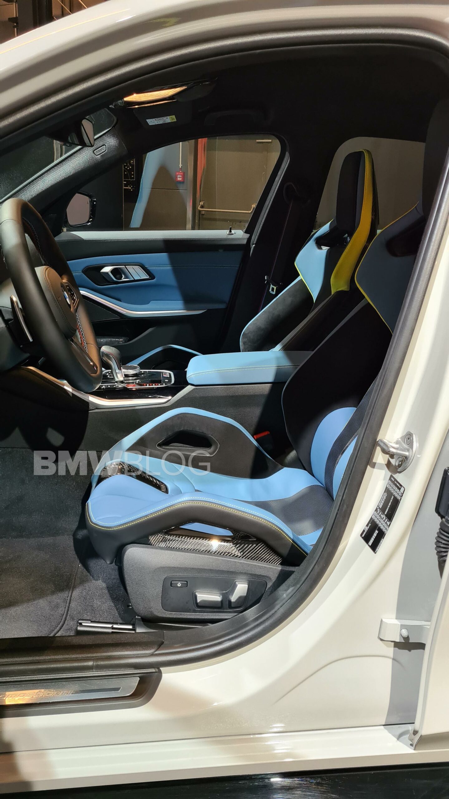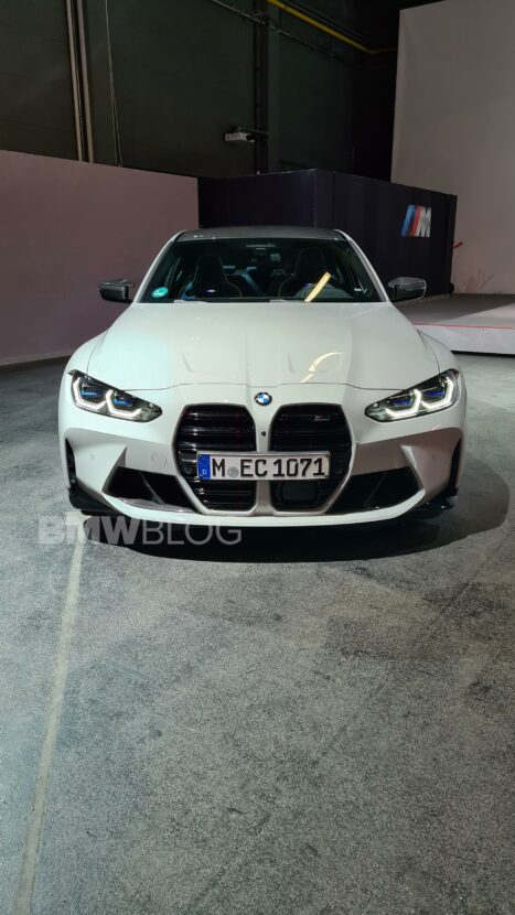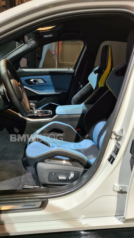 The G80 M3 was paired with black wheels and a Merino fine-grain full leather in Yas Marina Blue/Black with accents in Yellow. While the blue looks great, we would love to see a red-based interior paired with Chalk. Of course, customers with deep pockets might be able to customize their interior with the help of the BMW Individual catalog.