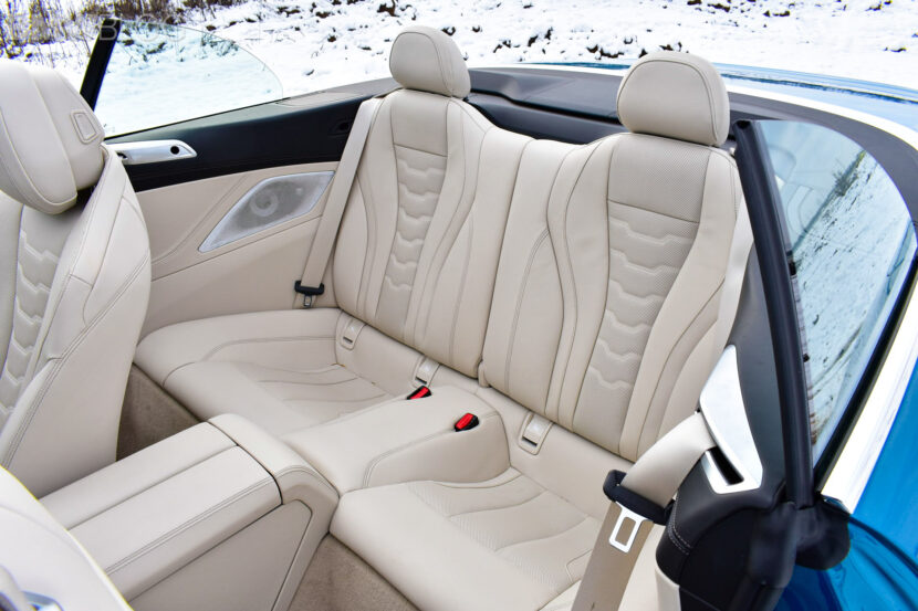 Essentially, the 8 Series Convertible is still a car vastly suitable for two people and no extra one (maybe a child not older than 6-7 years). The dimensions of the interior are slightly smaller than in the case of the Coupe variant, due to the additional measures to increase torsional rigidity. Furthermore, the roofless 8 Series is less wider than the outgoing 6 Series Convertible was, so the space on the back seats is even more confined, also given the fact that you must adjust the front seats pretty close to the rear seats as to drive comfortably, even when you are below 6 ft tall.